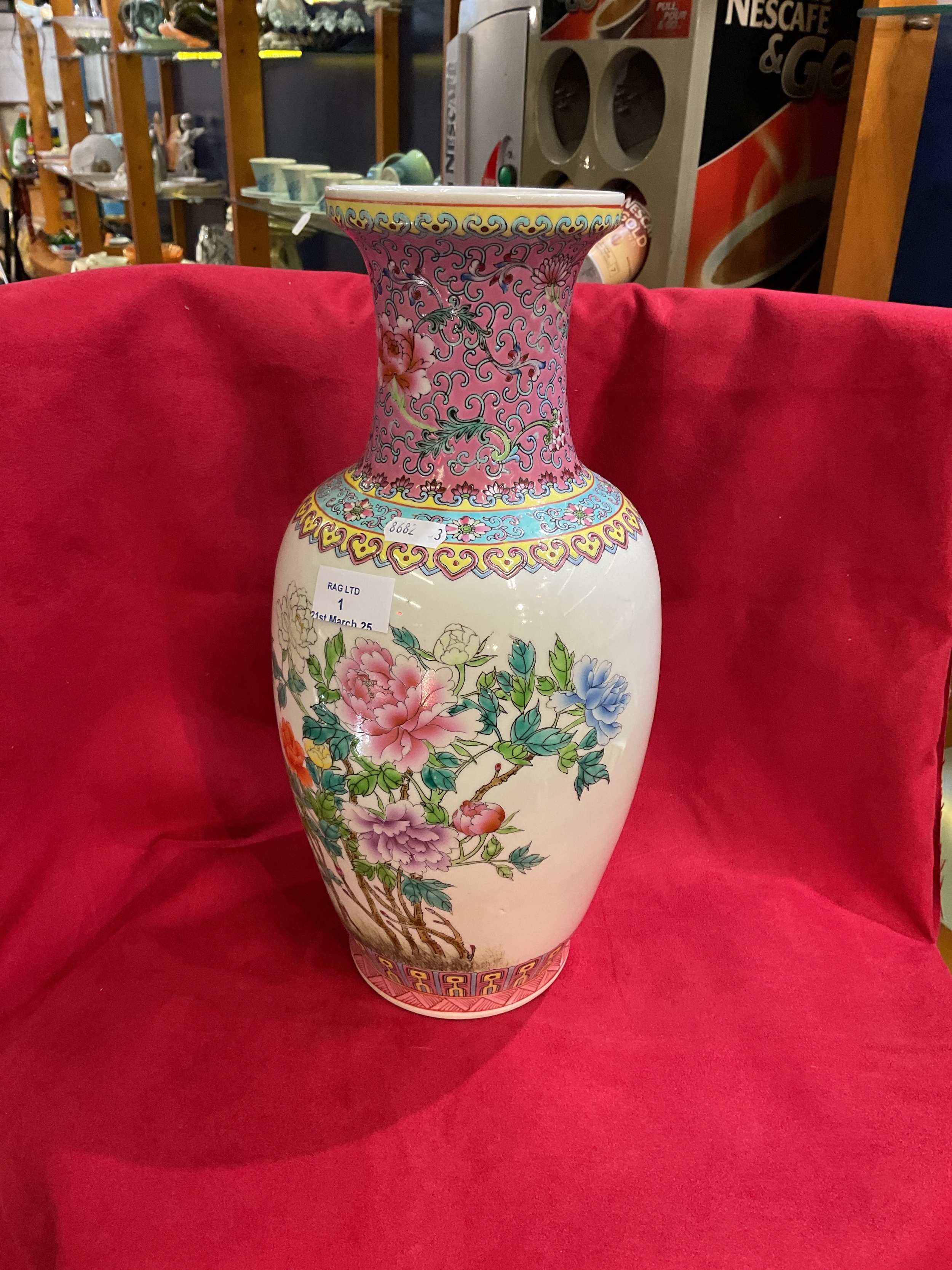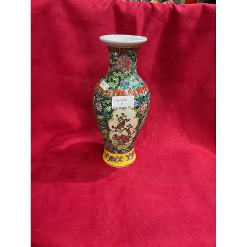 A large Chinese family rose vase with character marks to base 14.5” tall