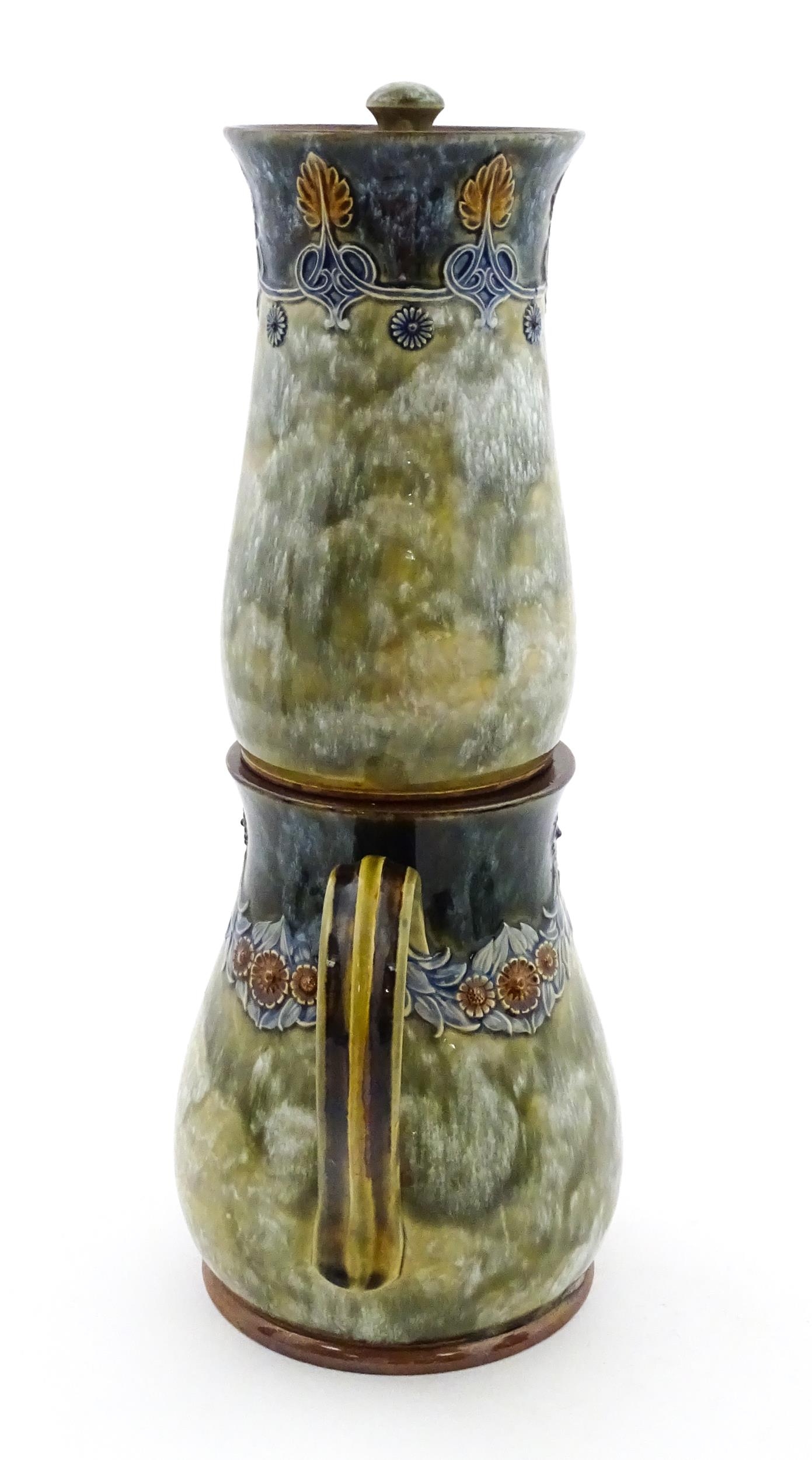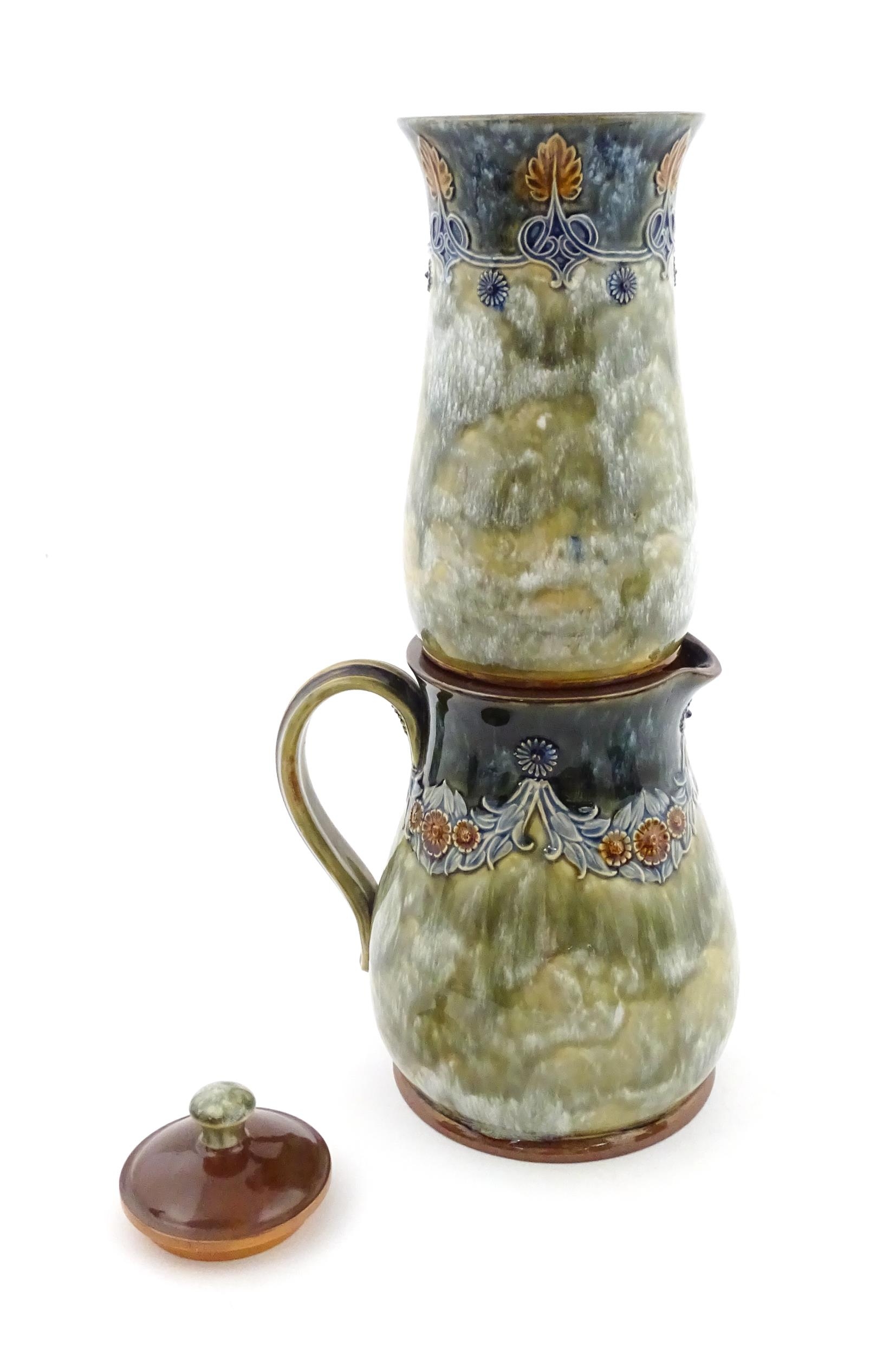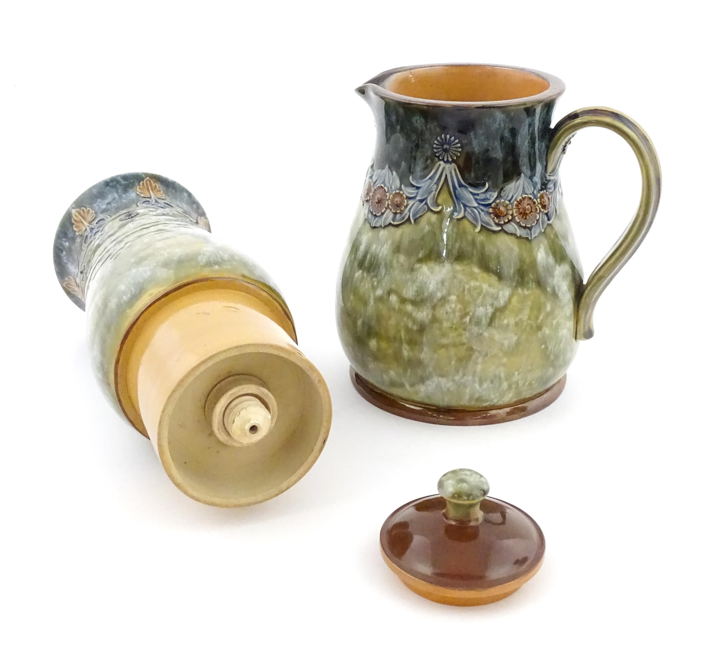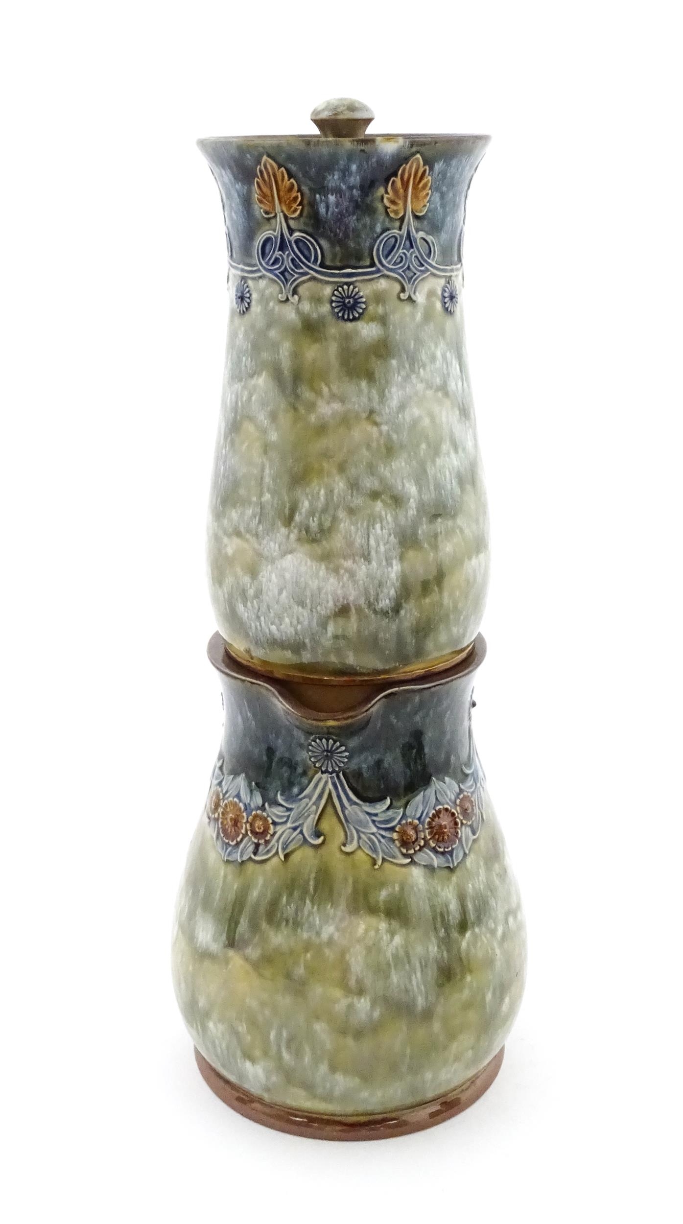 A Royal Doulton stoneware water filter and jug with lid, the mottled green glaze with scrolling and swag detail. Marked under, numbered 351Y, and marked with maker's mark. Approx. 16 1/2" high
