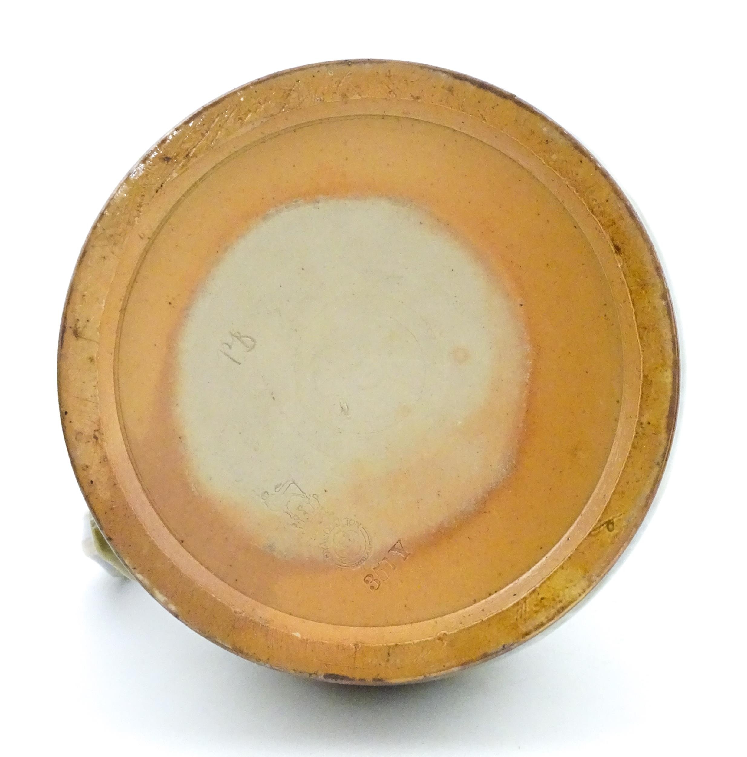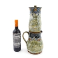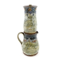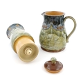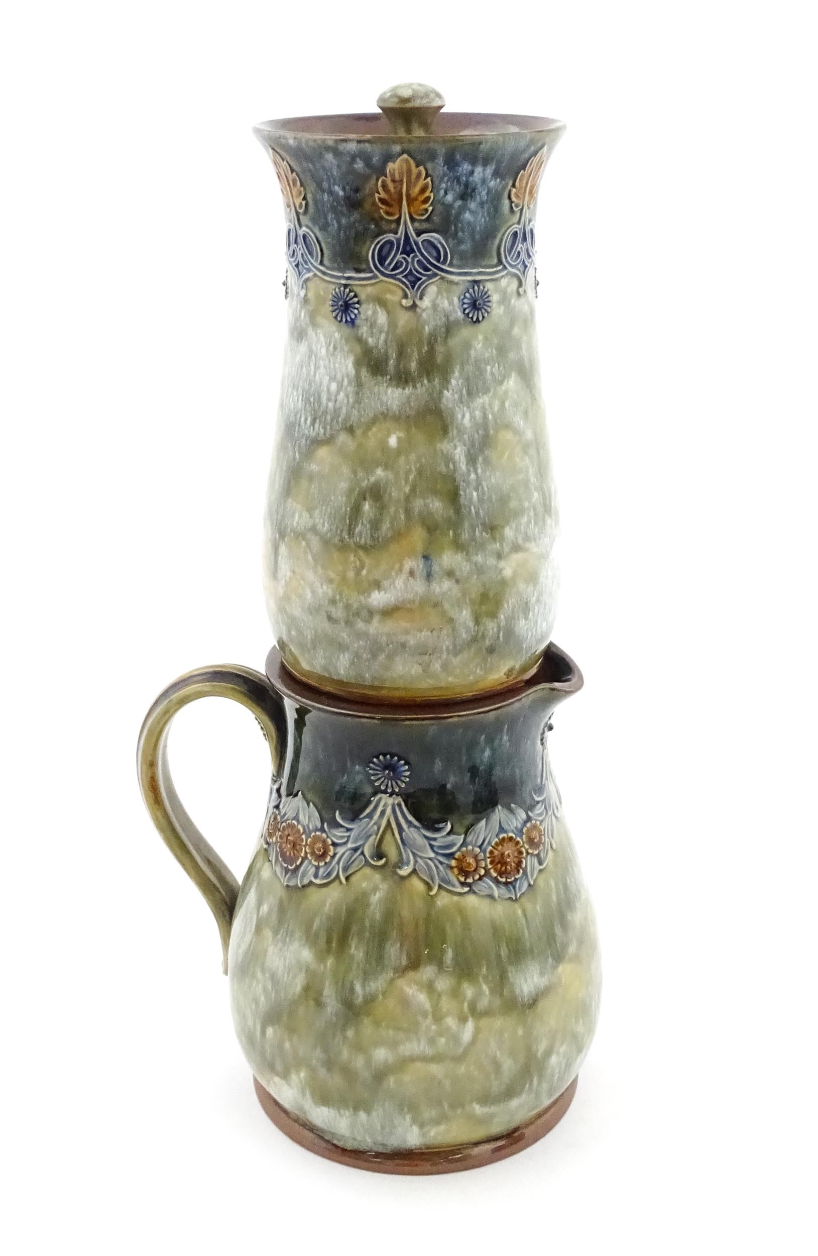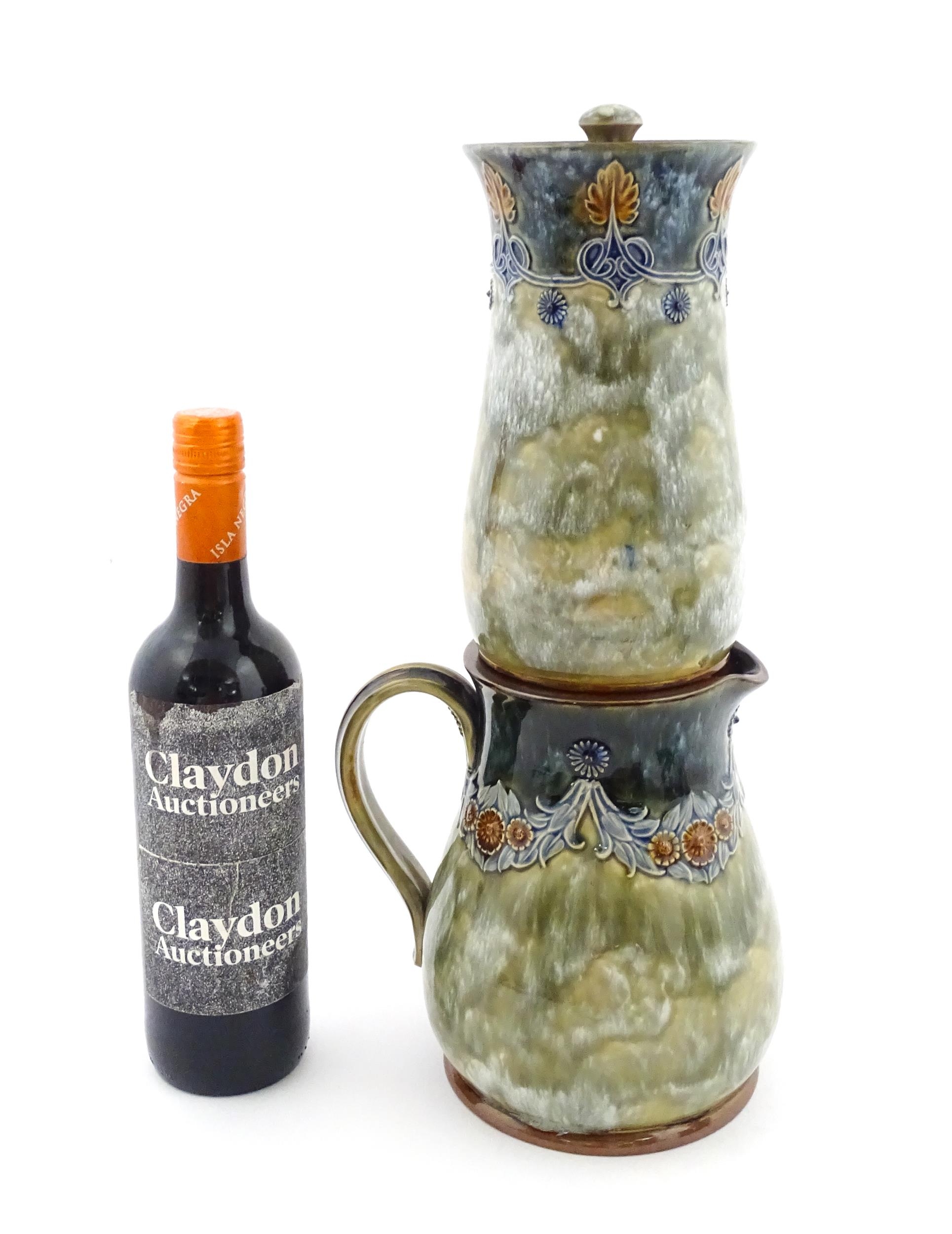A Royal Doulton stoneware water filter and jug with lid, the mottled green glaze with scrolling and swag detail. Marked under, numbered 351Y, and marked with maker's mark. Approx. 16 1/2" high