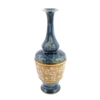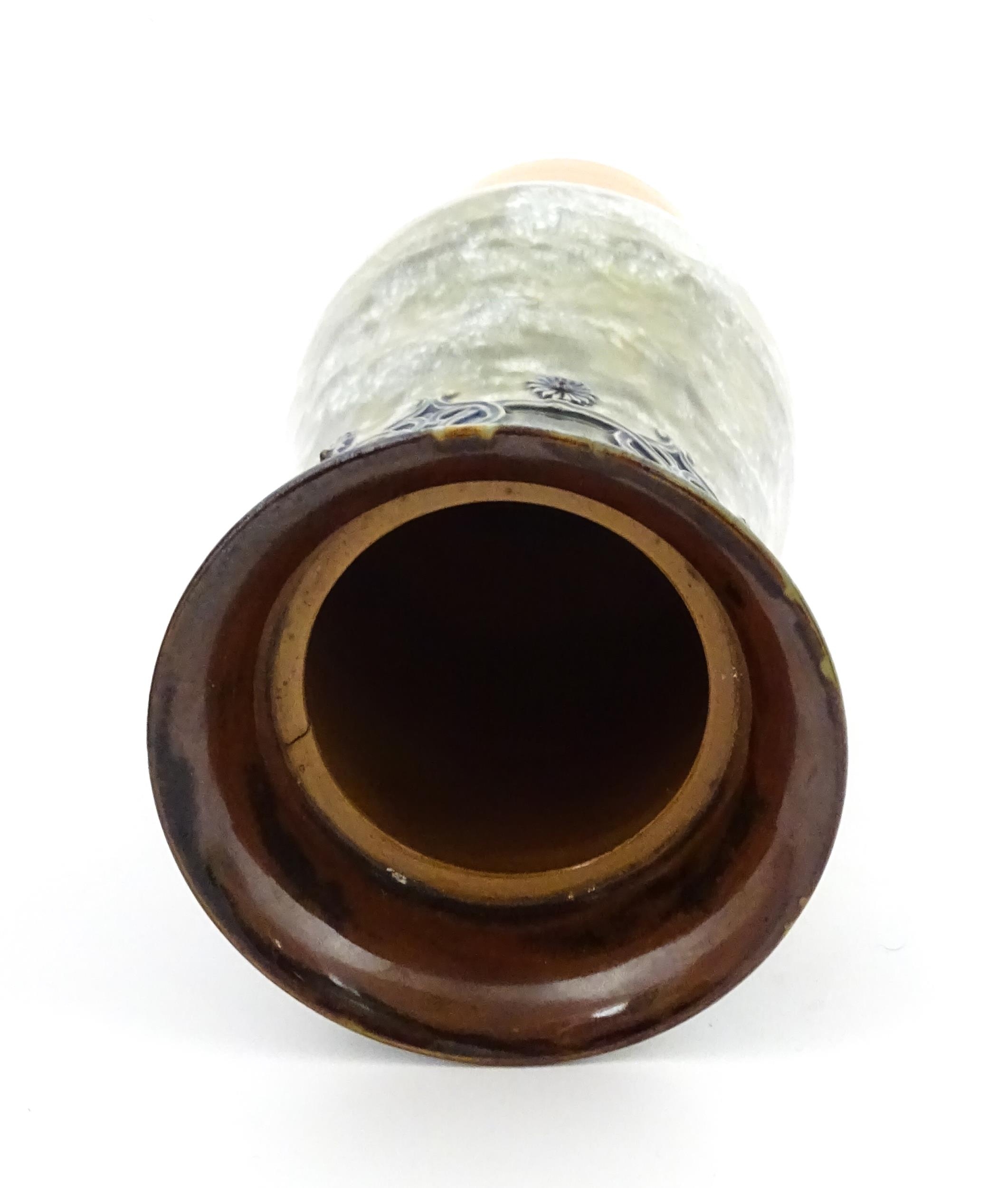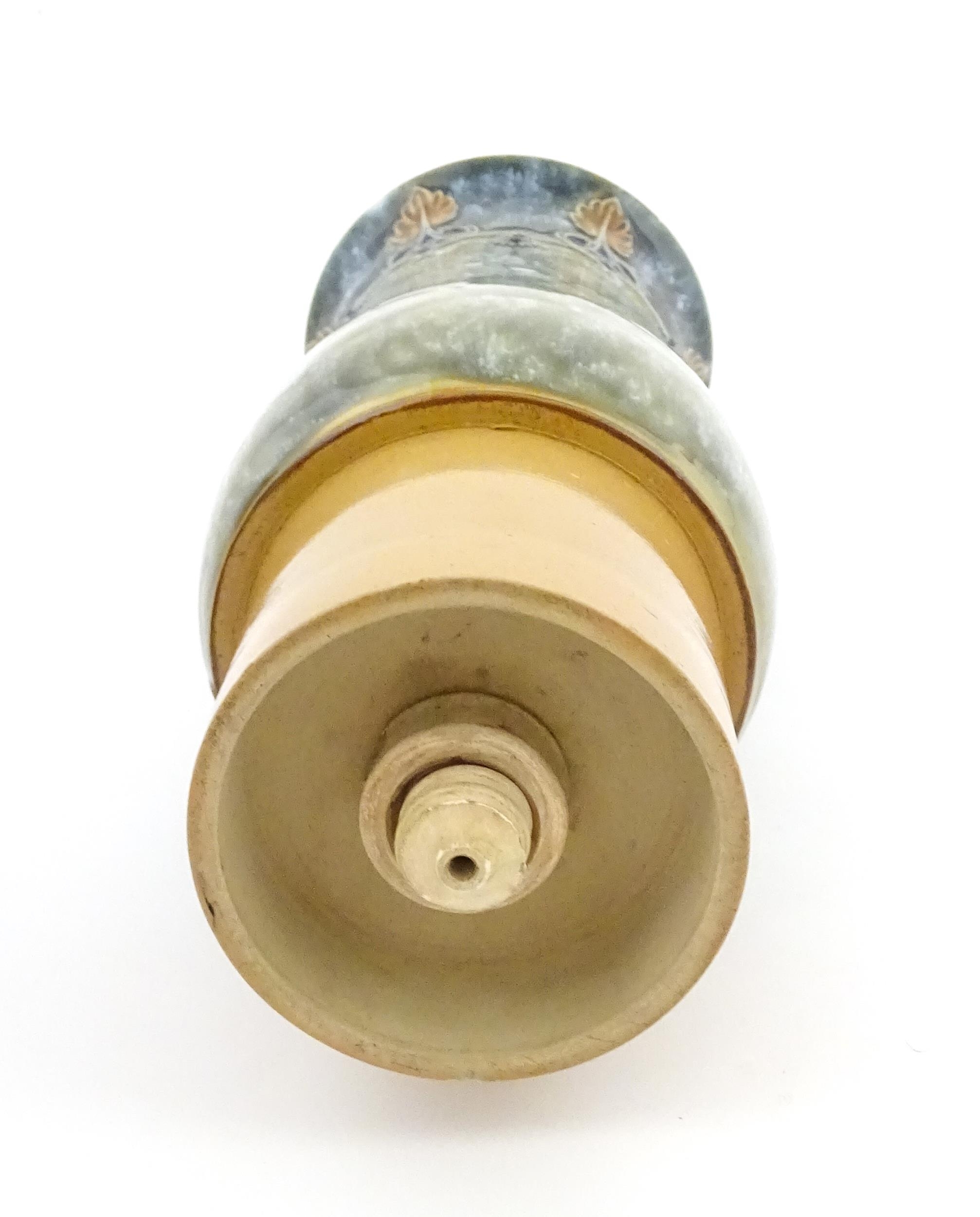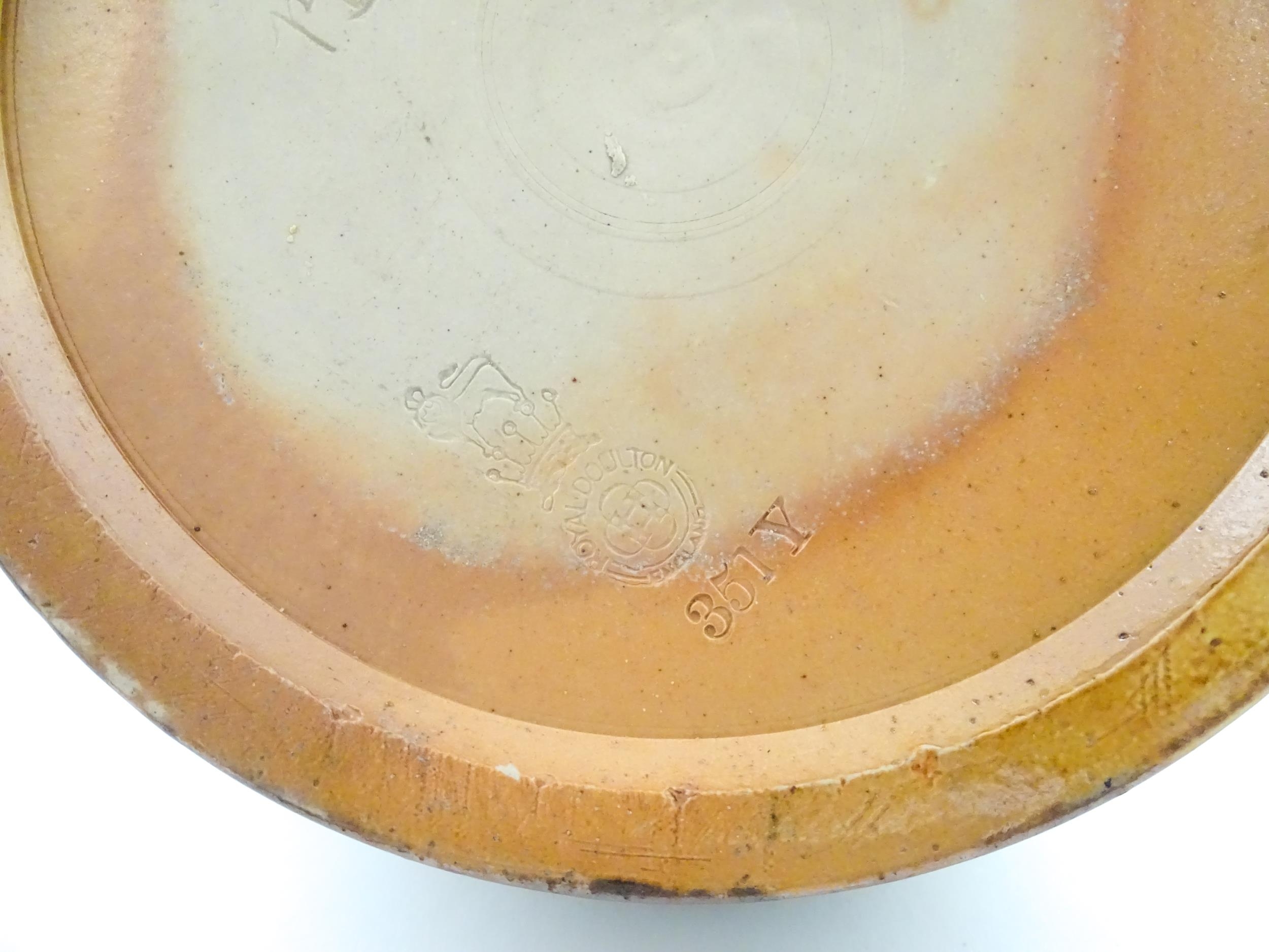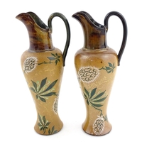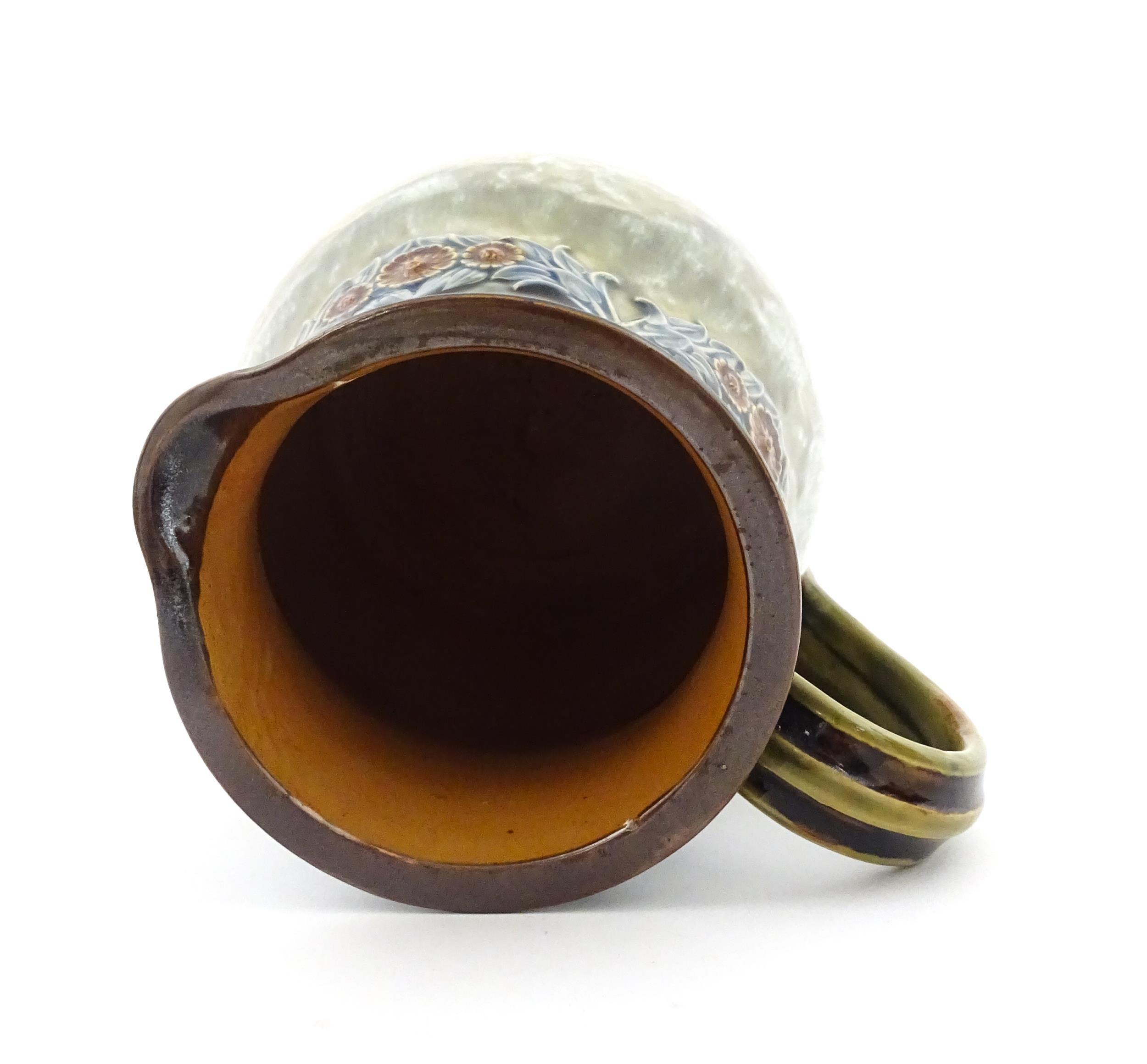 A Royal Doulton stoneware water filter and jug with lid, the mottled green glaze with scrolling and swag detail. Marked under, numbered 351Y, and marked with maker's mark. Approx. 16 1/2" high