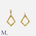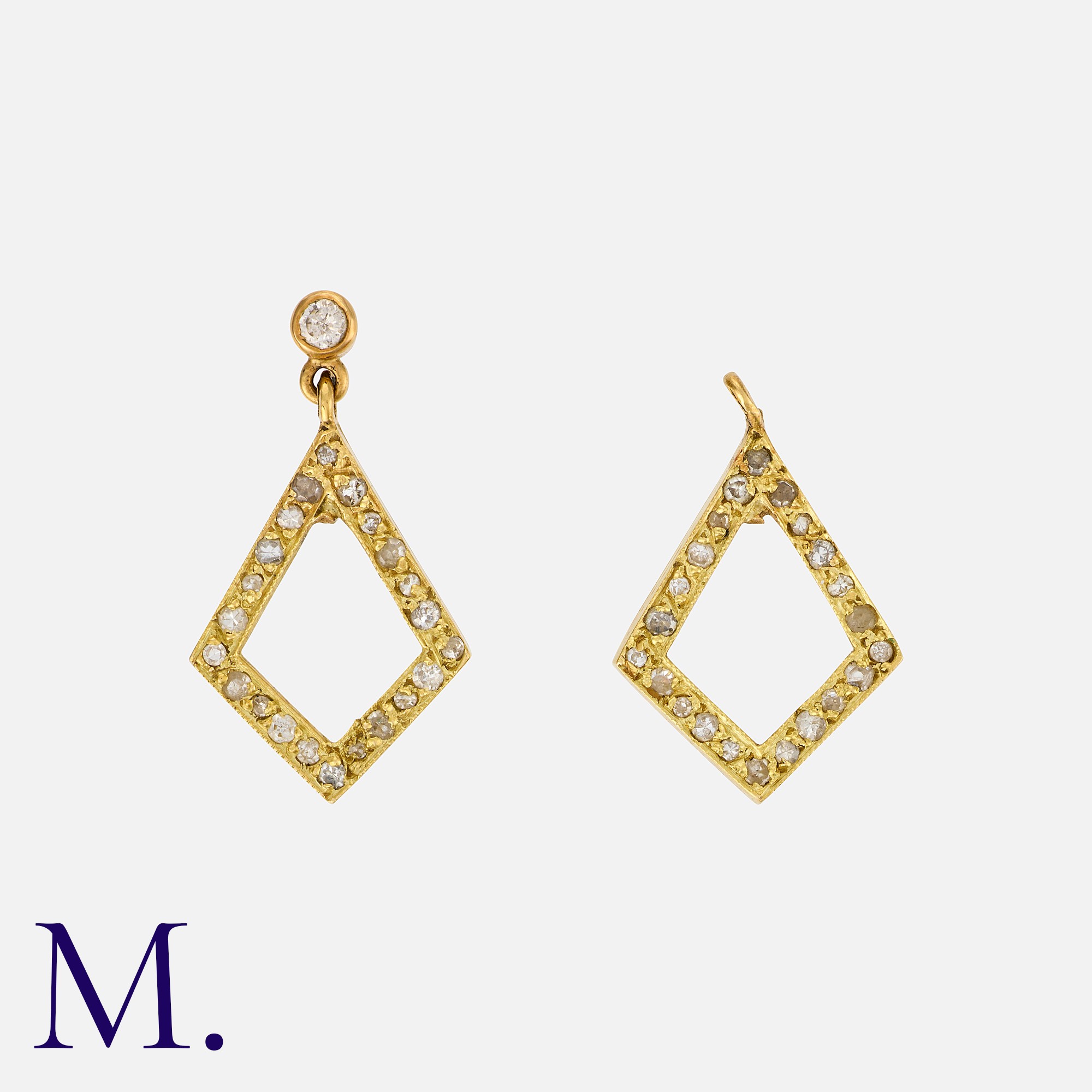 A pair of kite shaped diamond earrings (one top/ post deficient) Partially Hallmarked for 18 carat gold. Weight: 1.8g.