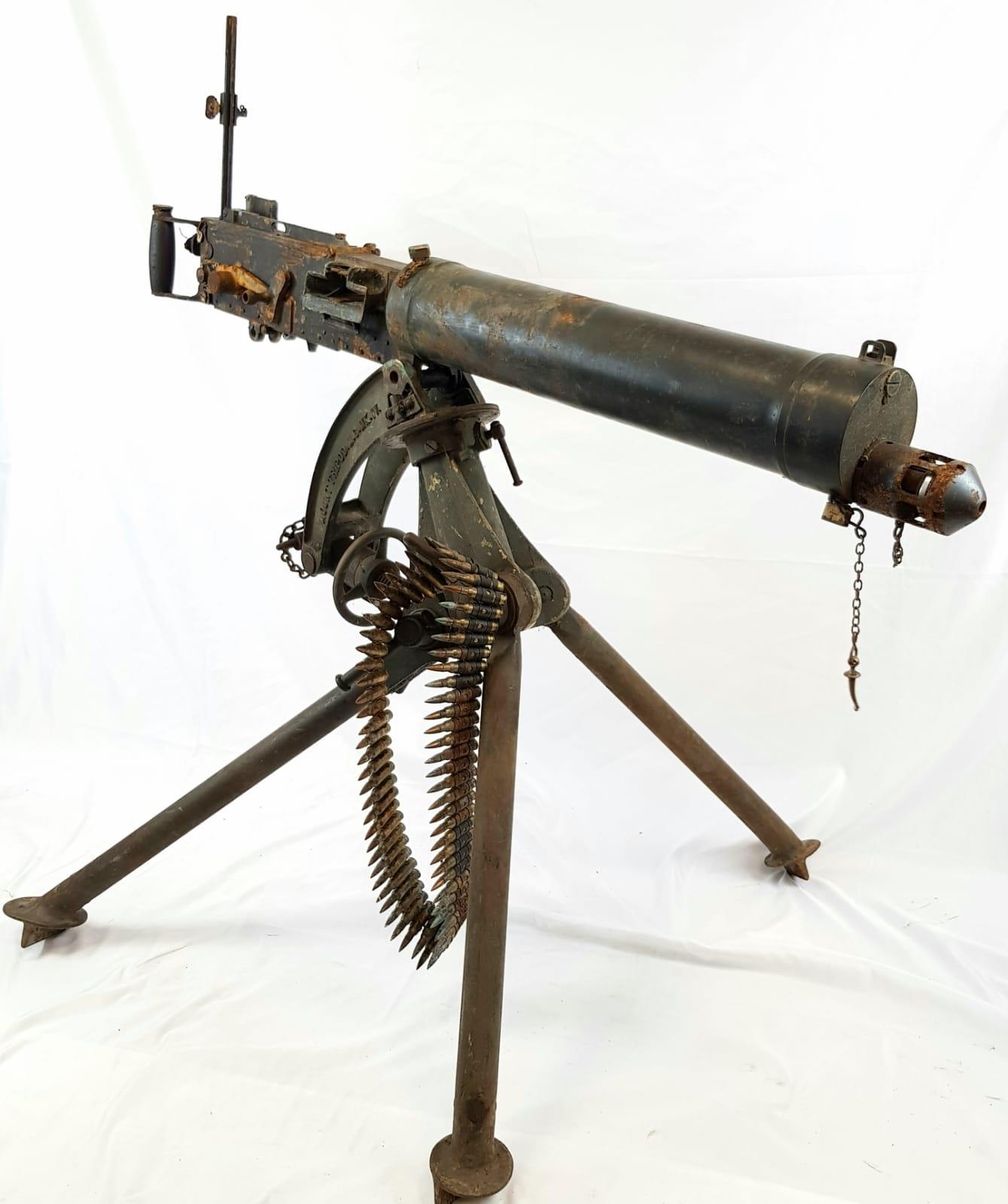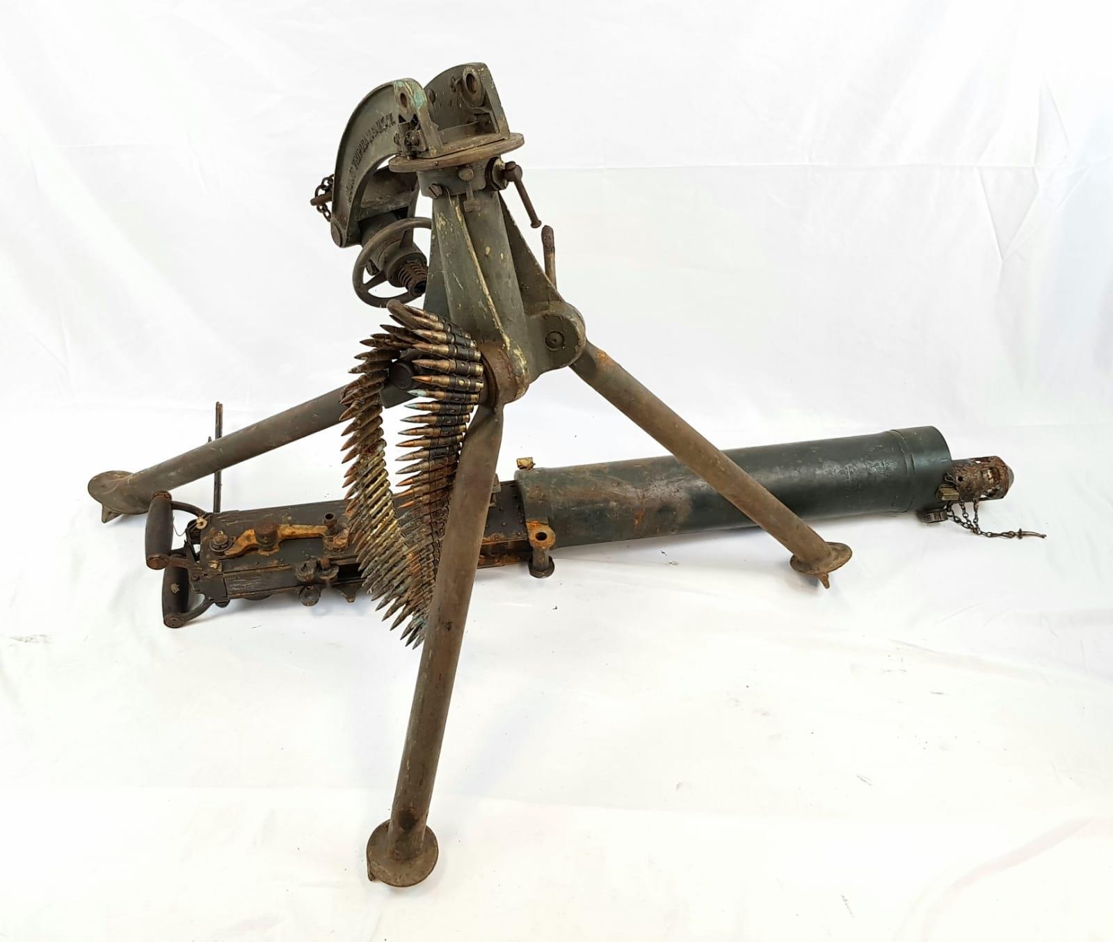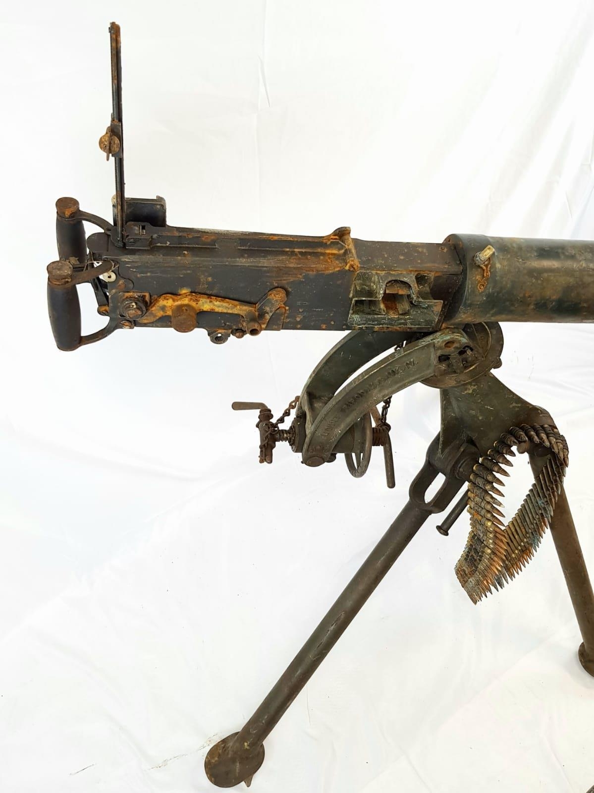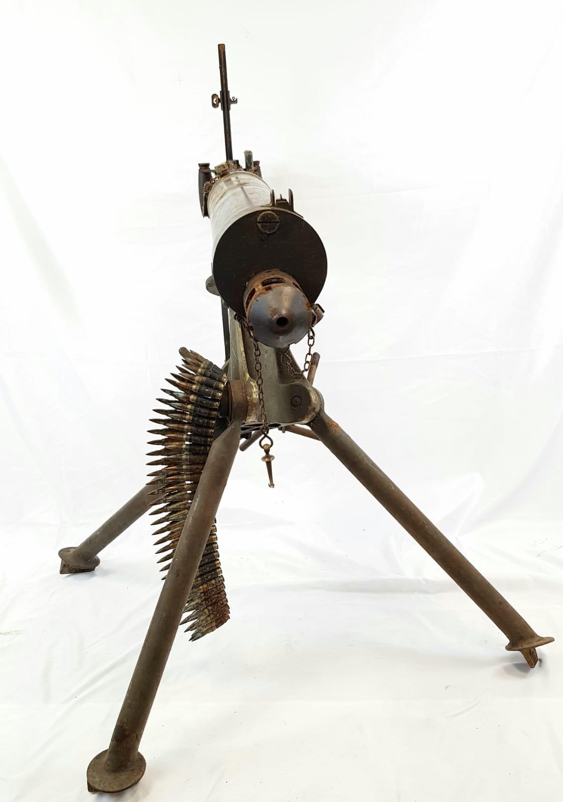 A WW2 Era Deactivated British Vickers Machine Gun and Tripod. This gun has seen action on three continents. Awkward to set up but once this water-cooled killing machine got going the fire-rate was 500 - .303 rounds per minute. In need of some love and attention so a perfect restoration piece for the serious militaria collector. Lovely stuff!