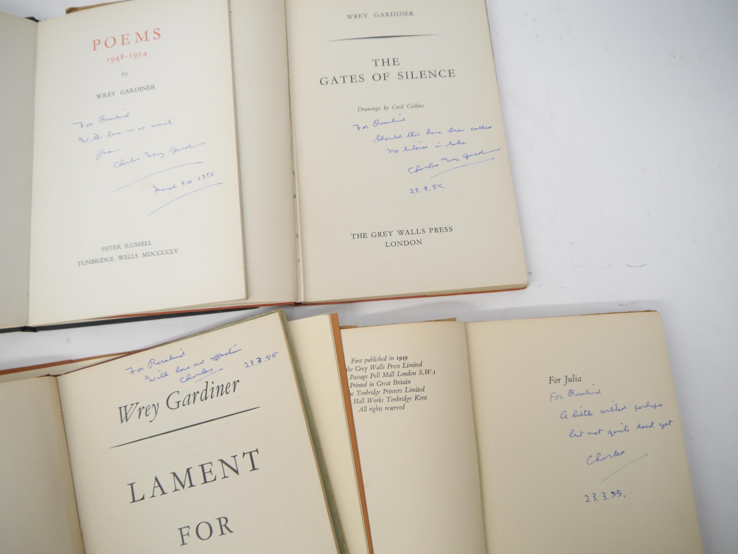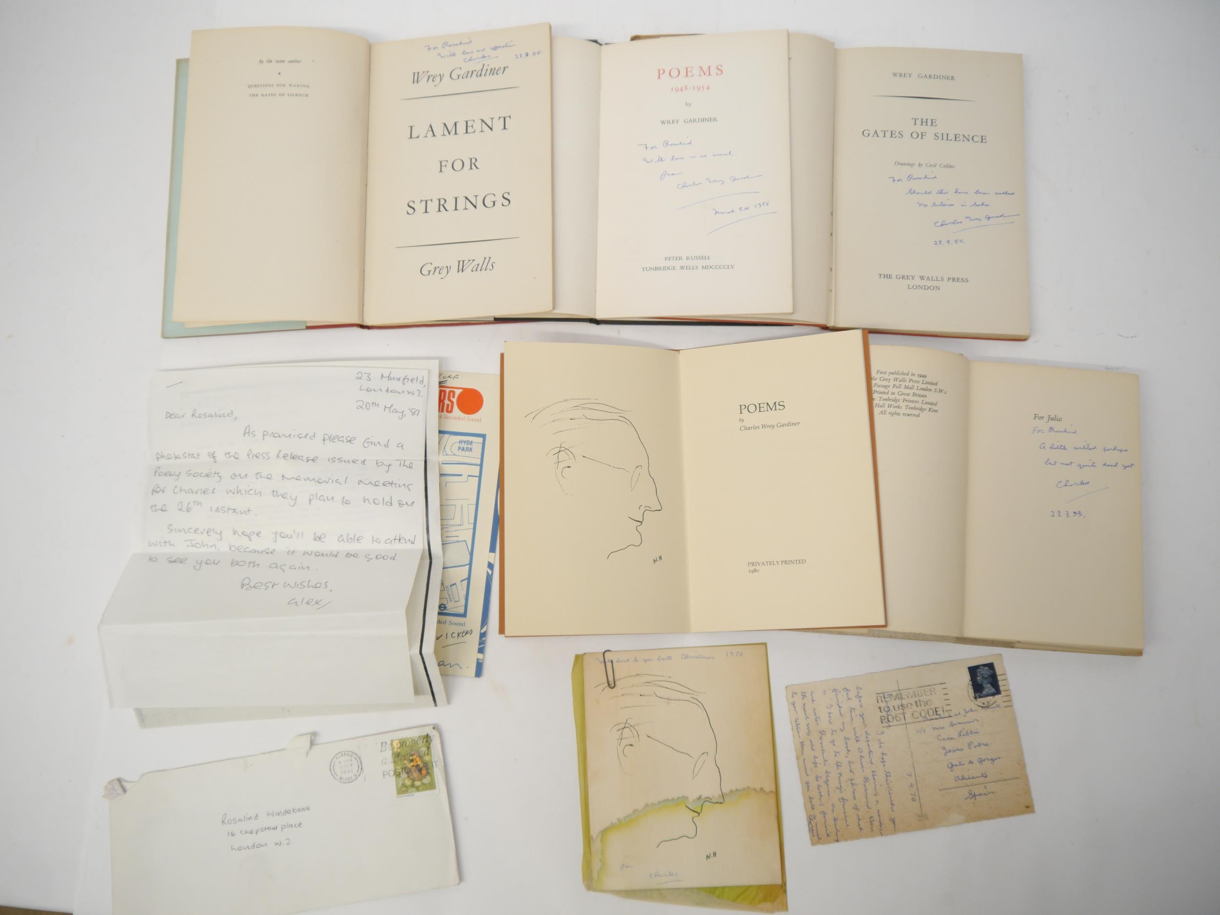 Wrey Gardiner, 4 titles, all first editions, all signed & inscribed by Gardiner to Rosalind Windebank (1932-2022), copywriter, all original cloth, all in dust wrappers, comprising: 'The Gates of Silence', London, The Grey Walls Press, 1944, signed & inscribed on title "For Rosalind, Should this have been called no silence in Soho. Charles Wrey Gardiner 23.3.55", 'Lament for Strings', L, Grey Walls Press, 1947, signed & inscribed on title page, Wrey Gardiner Autograph Postcard Signed dated 7.9.70 to Rosalind Windebank loosely inserted, plus Autograph Christmas Card 1970 with m/s poetry by Wrey Gardiner, m/s invitation letter to Rosalind Windebank for Charles Wrey Gardiner memorial 1981, etc, 'The Flowering Moment', Grey Walls Press, 1949, signed & inscribed on dedication page, 'Poems 1948-1954', Tunbridge Wells, Peter Russell, 1955, 1st edition, limited edition (350), signed & inscribed on title page, plus 'Poems', Privately Printed for the Enitharmon Press, 1980, ltd. edn. (51/100), numbered, orig. wraps (5)