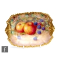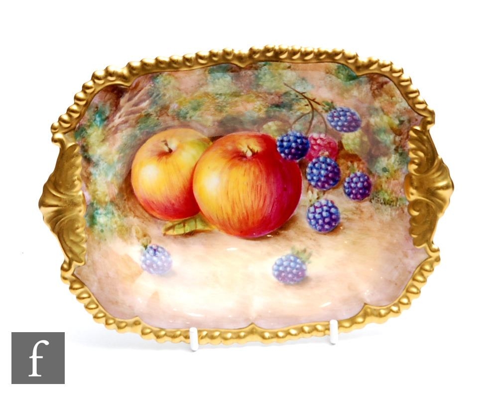 A Royal Worcester Fallen Fruits square shaped dish decorated with hand painted apples and blackberries, indistinctly signed, black printed mark, 18cm x 13cm.