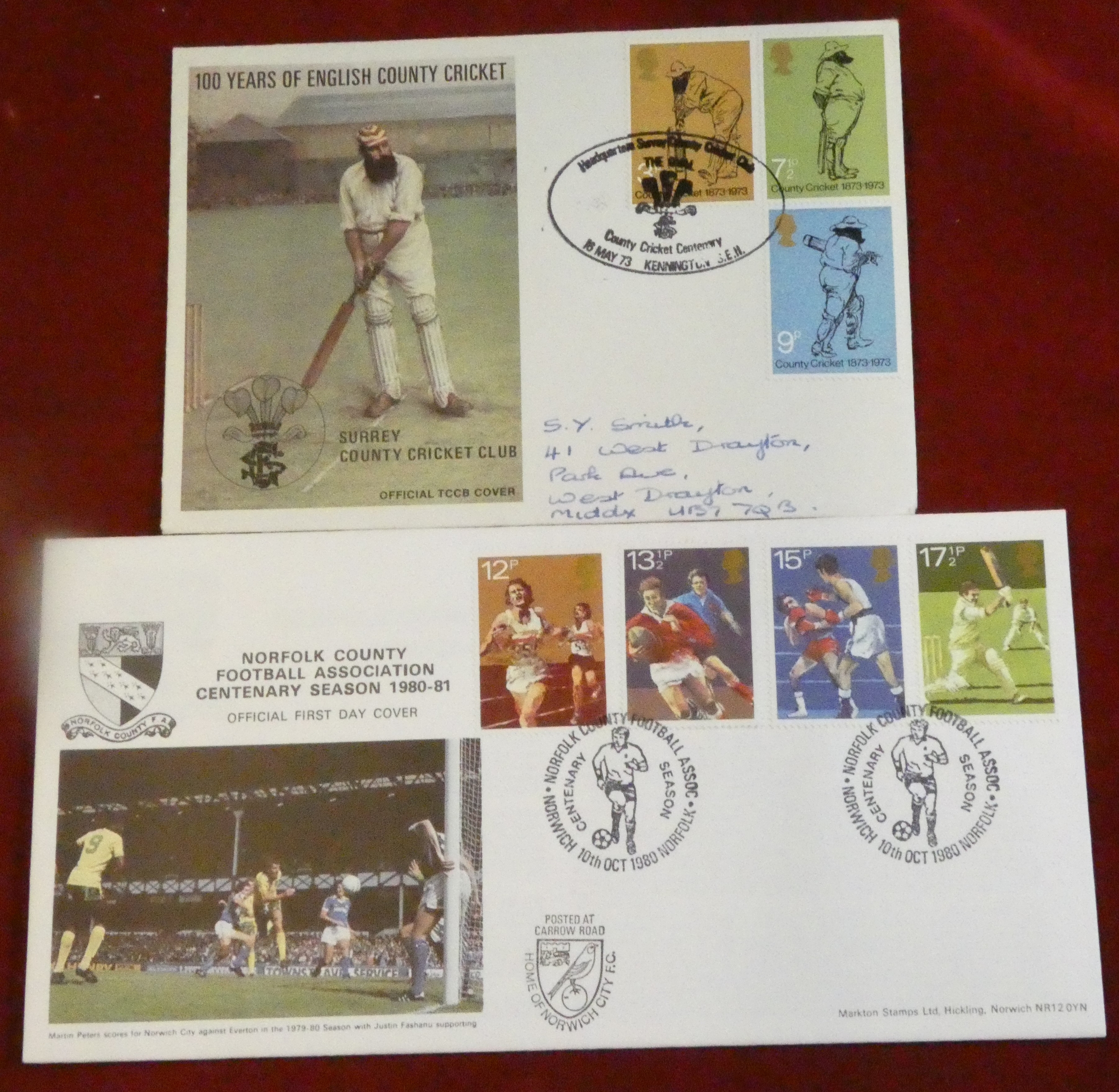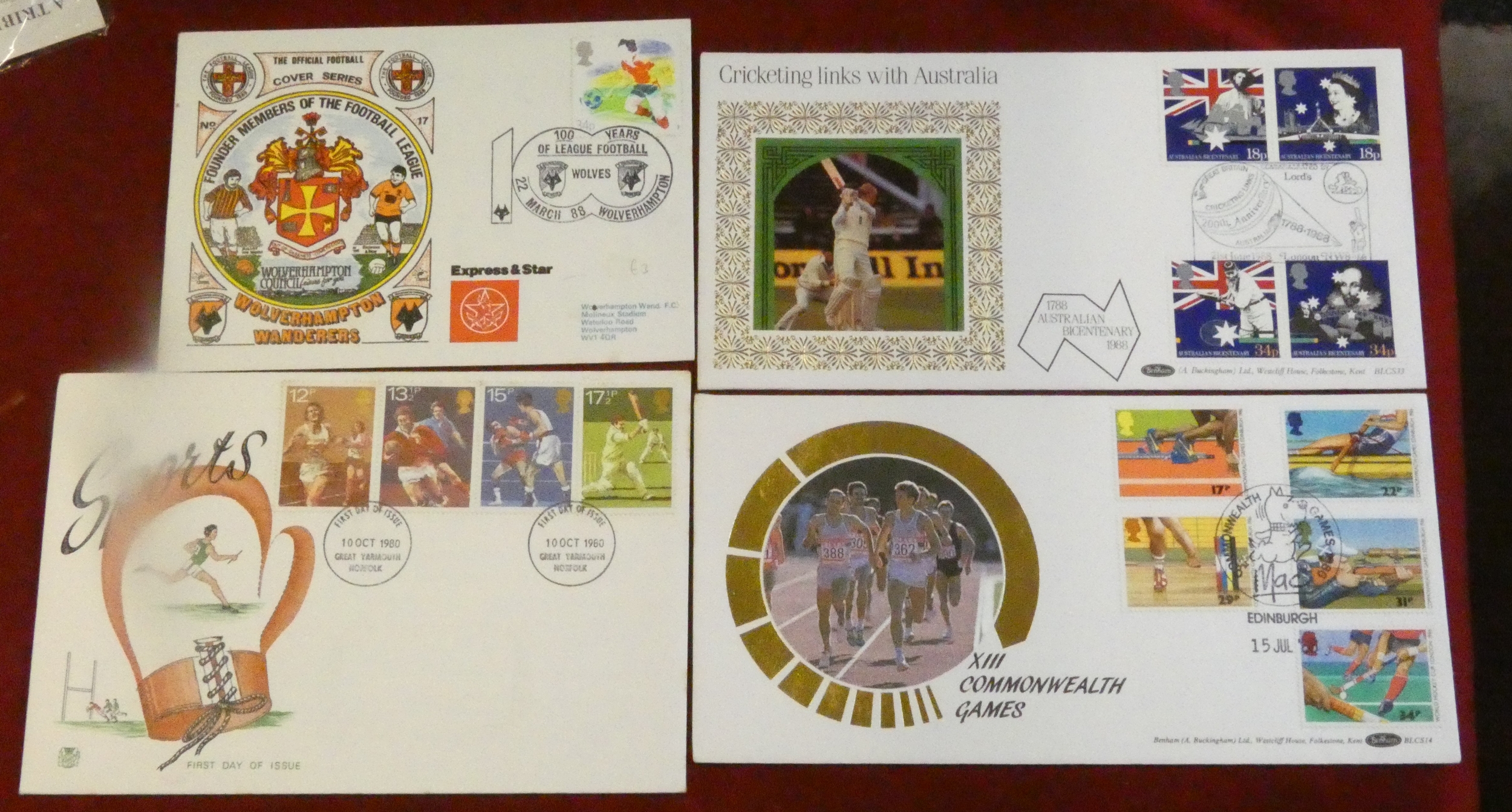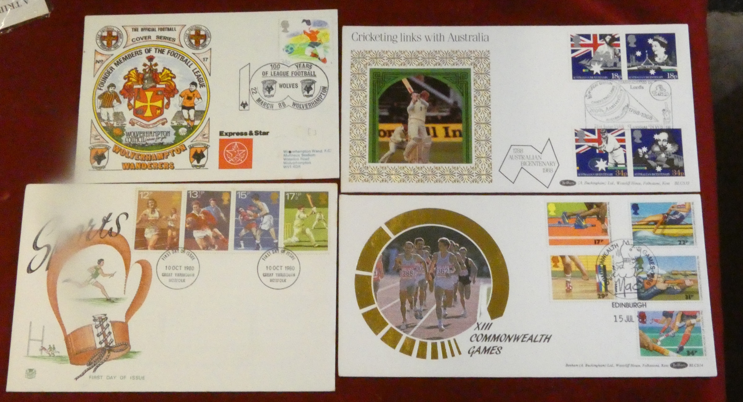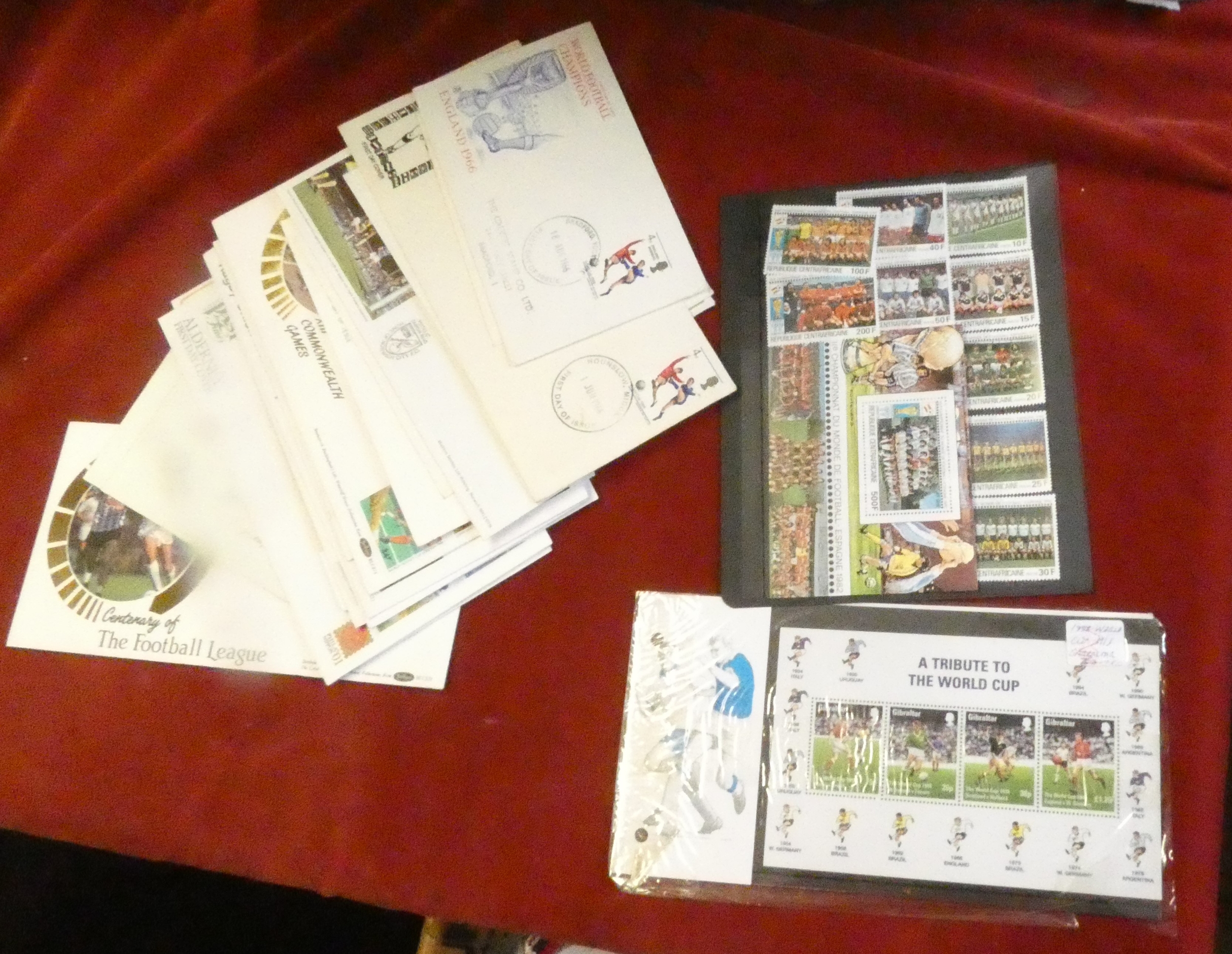 Great Britain 1966-2002 sports FDCs and commemmorative covers: football (10), general sports (4), cricket (2), tennis (3), rugby (1) plus Central African Republic world cup m/m set 1981.