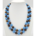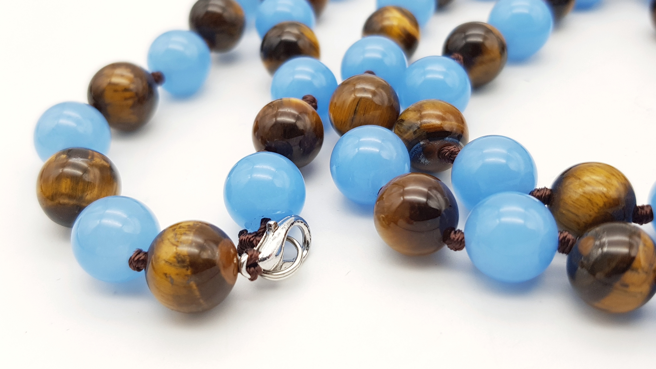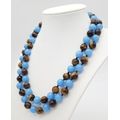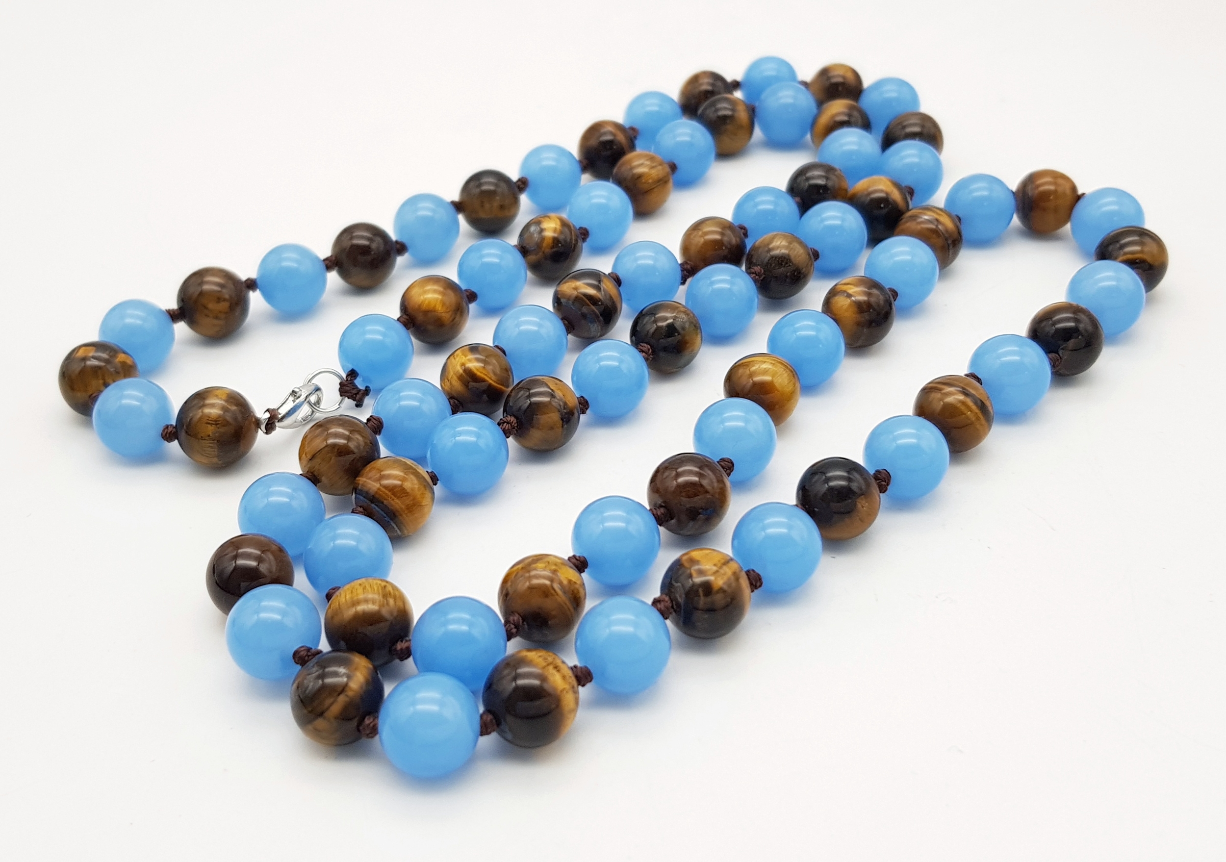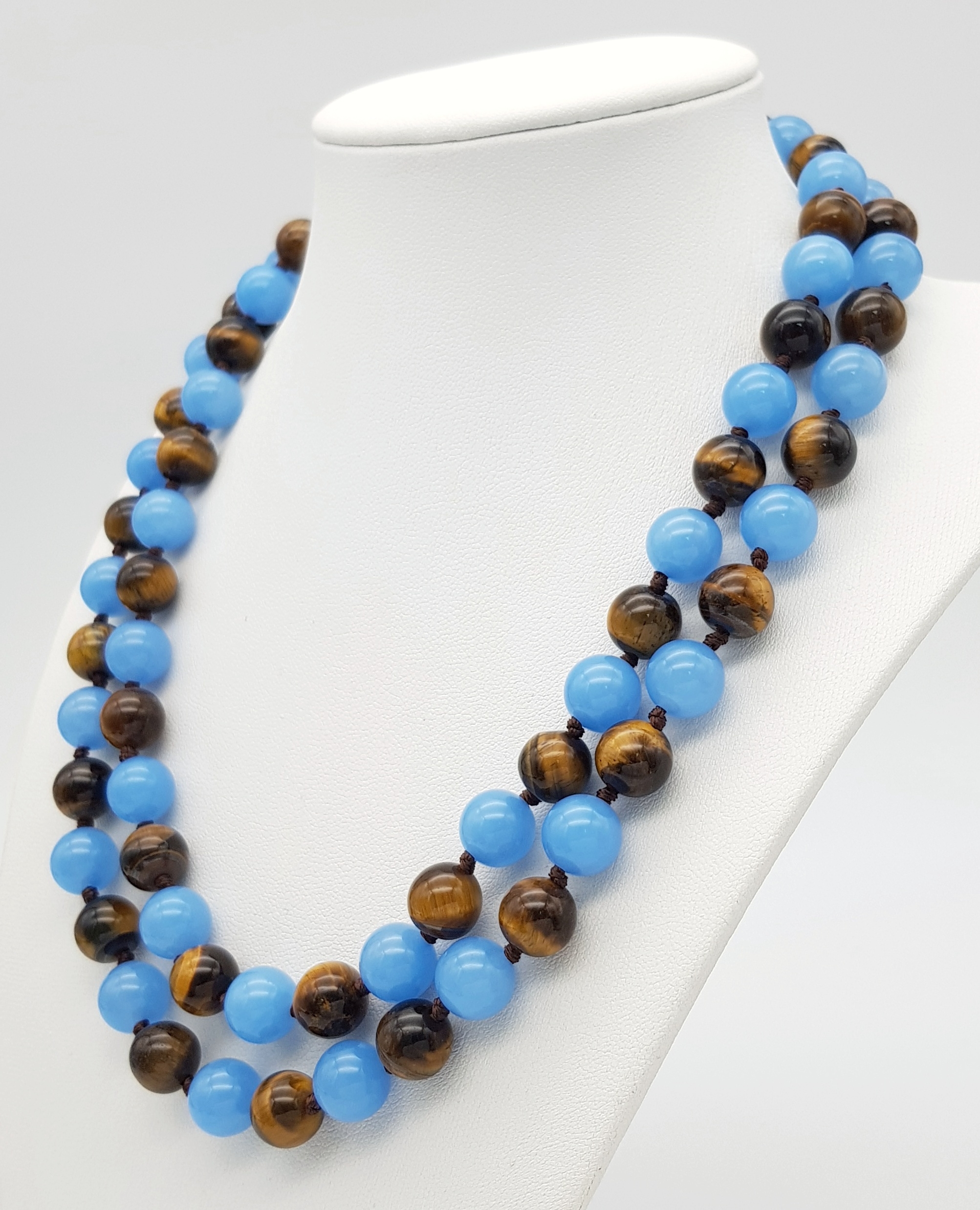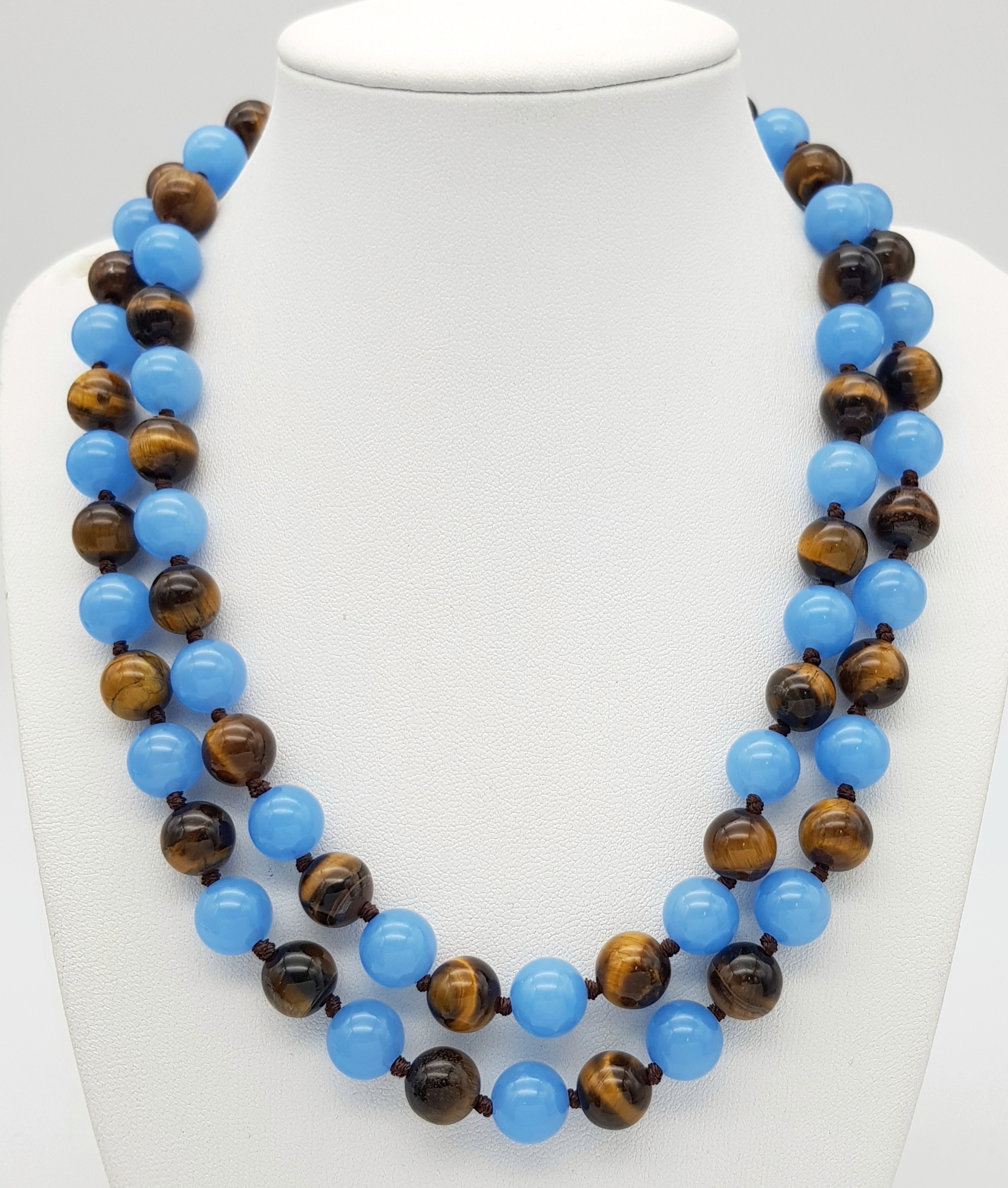 A Light Blue Jade and Tigers Eye Beaded Matinee Necklace. 10mm beads. 92cm necklace length.