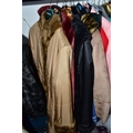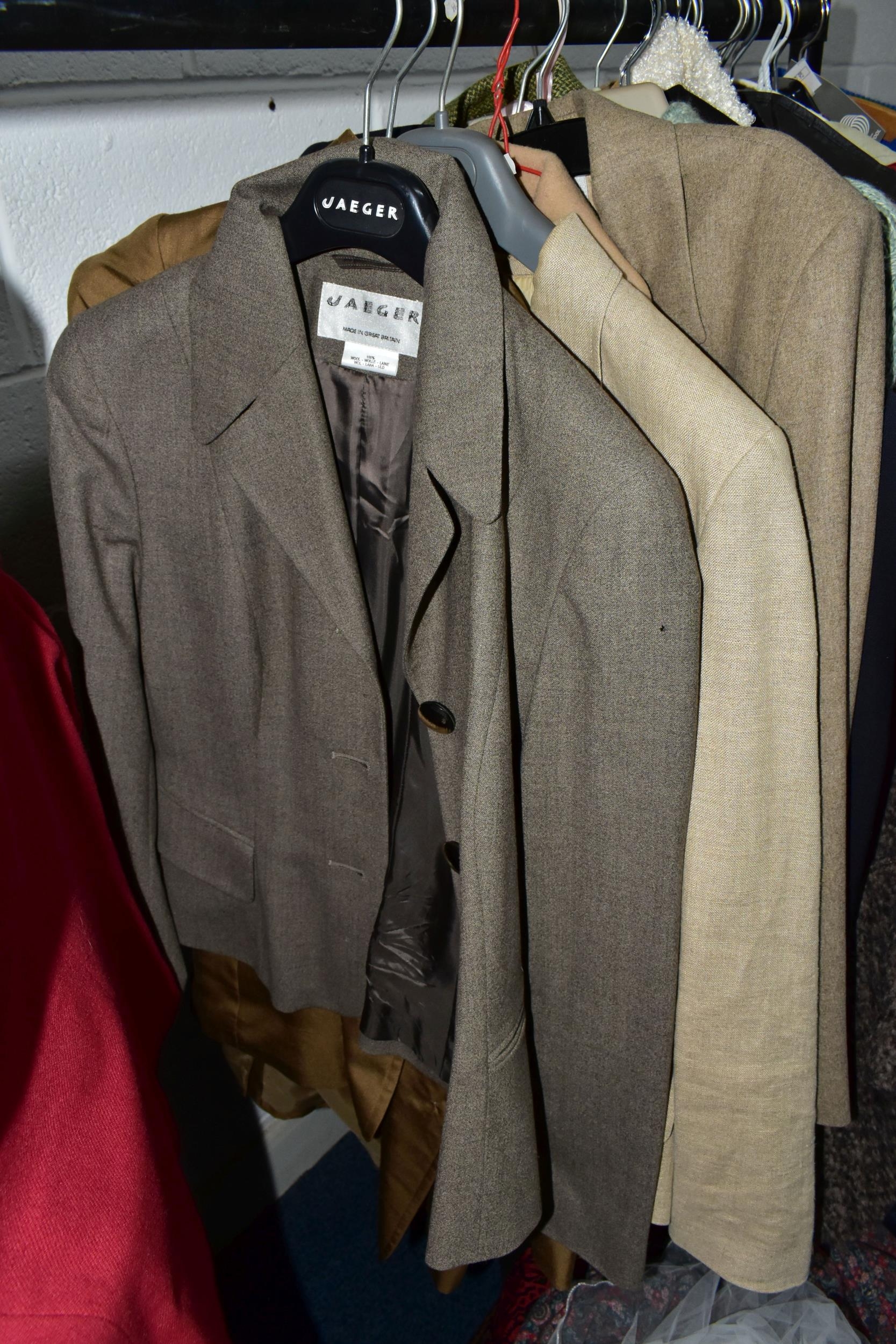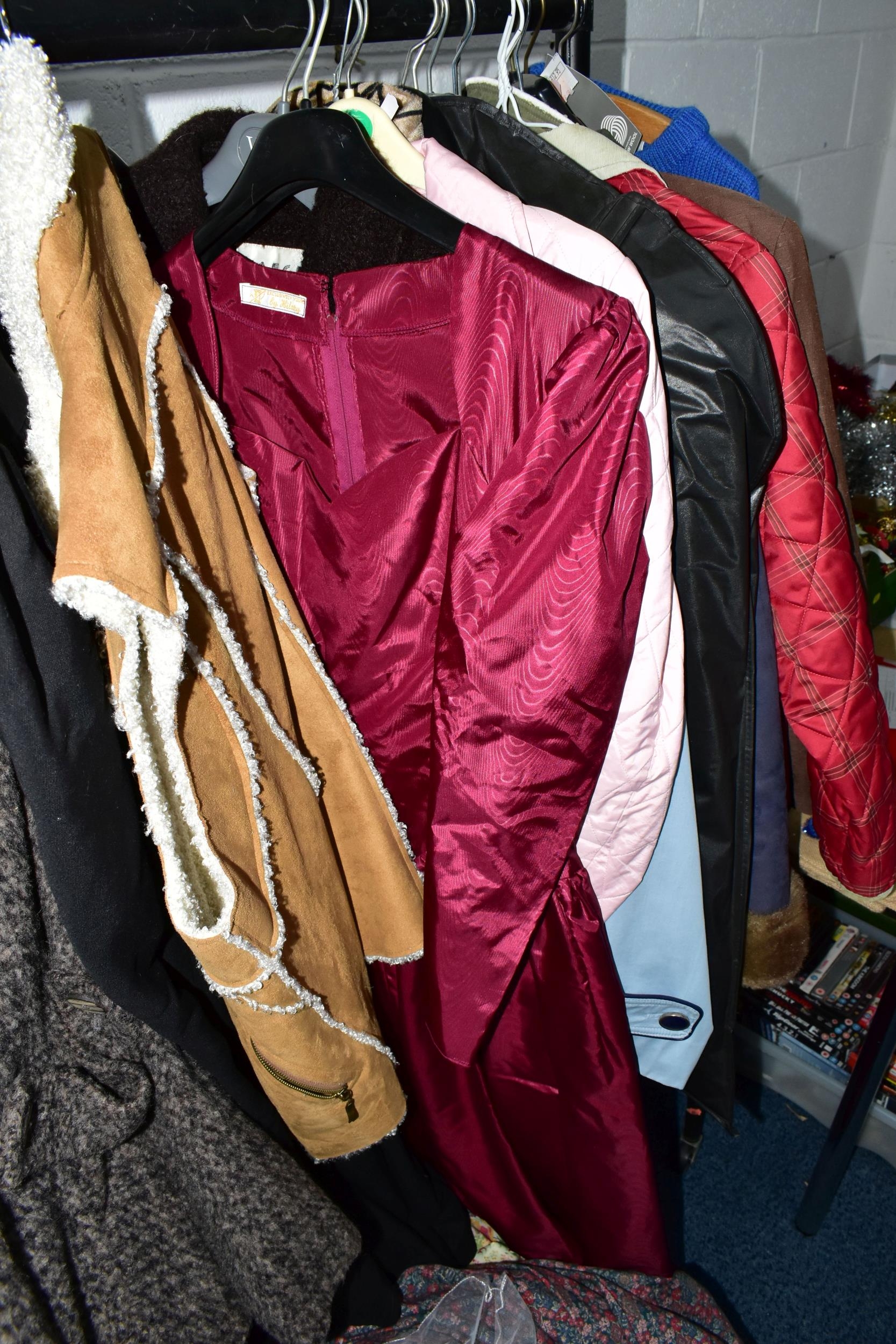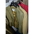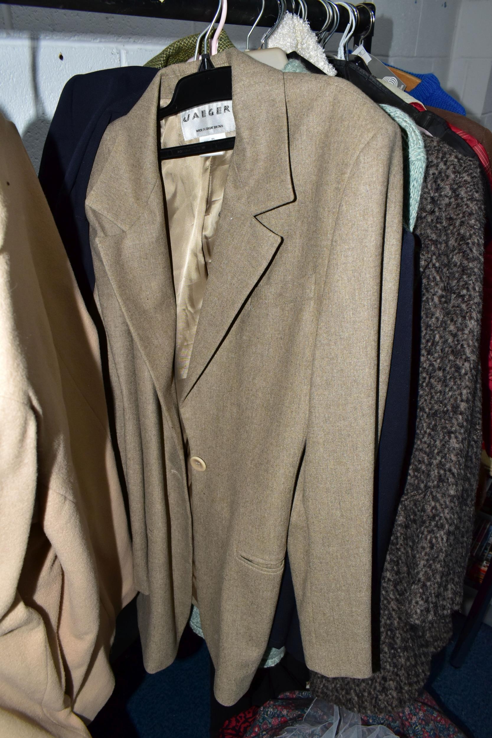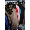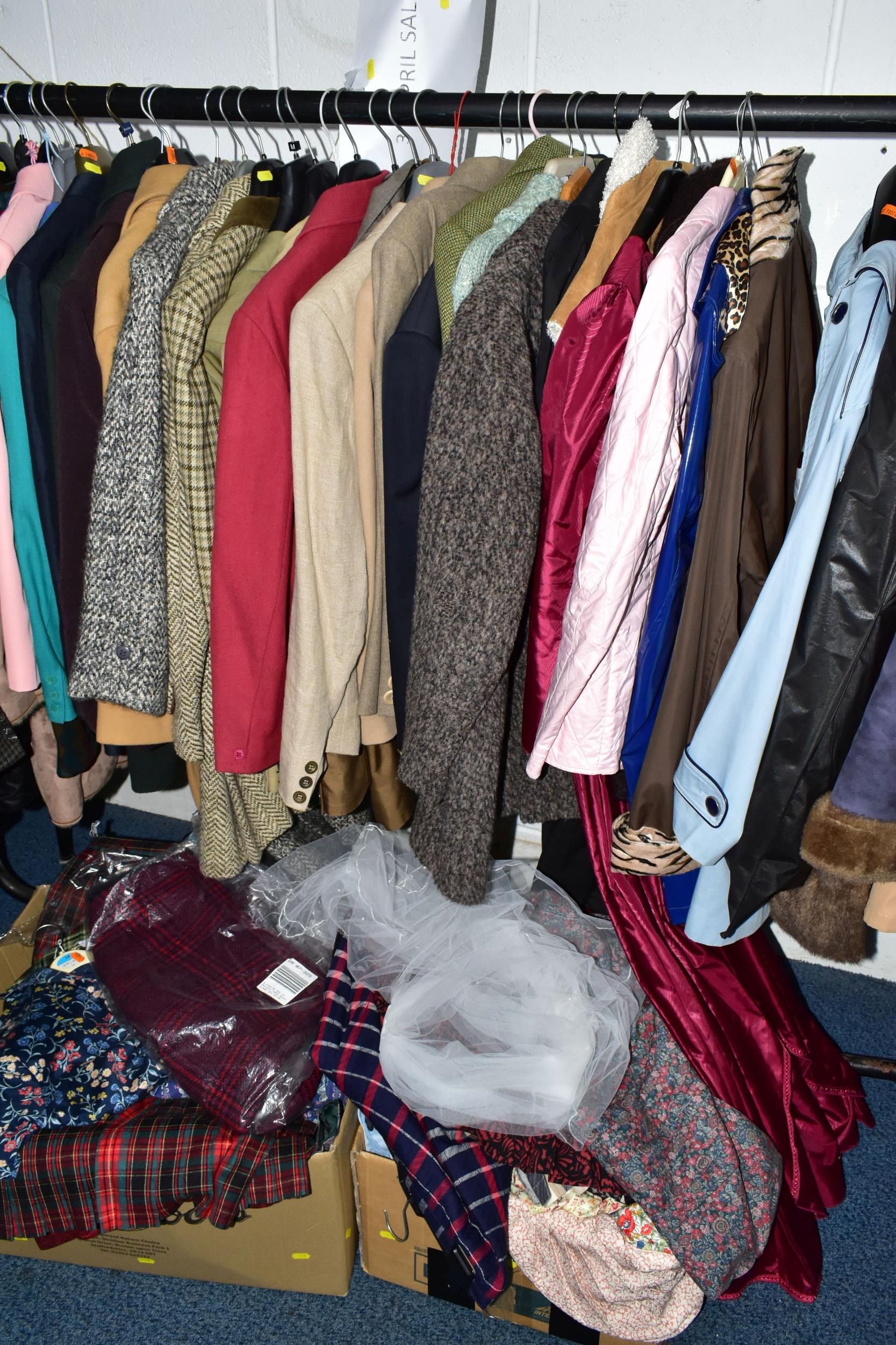 A RAIL AND TWO BOXES OF LADIES CLOTHING, to include coats, jackets, faux furs, sheepskins, skirts and sweaters, maker's names include Jaeger, Daks, Aquascutum, Eastex, etc. (one rail +2 boxes)