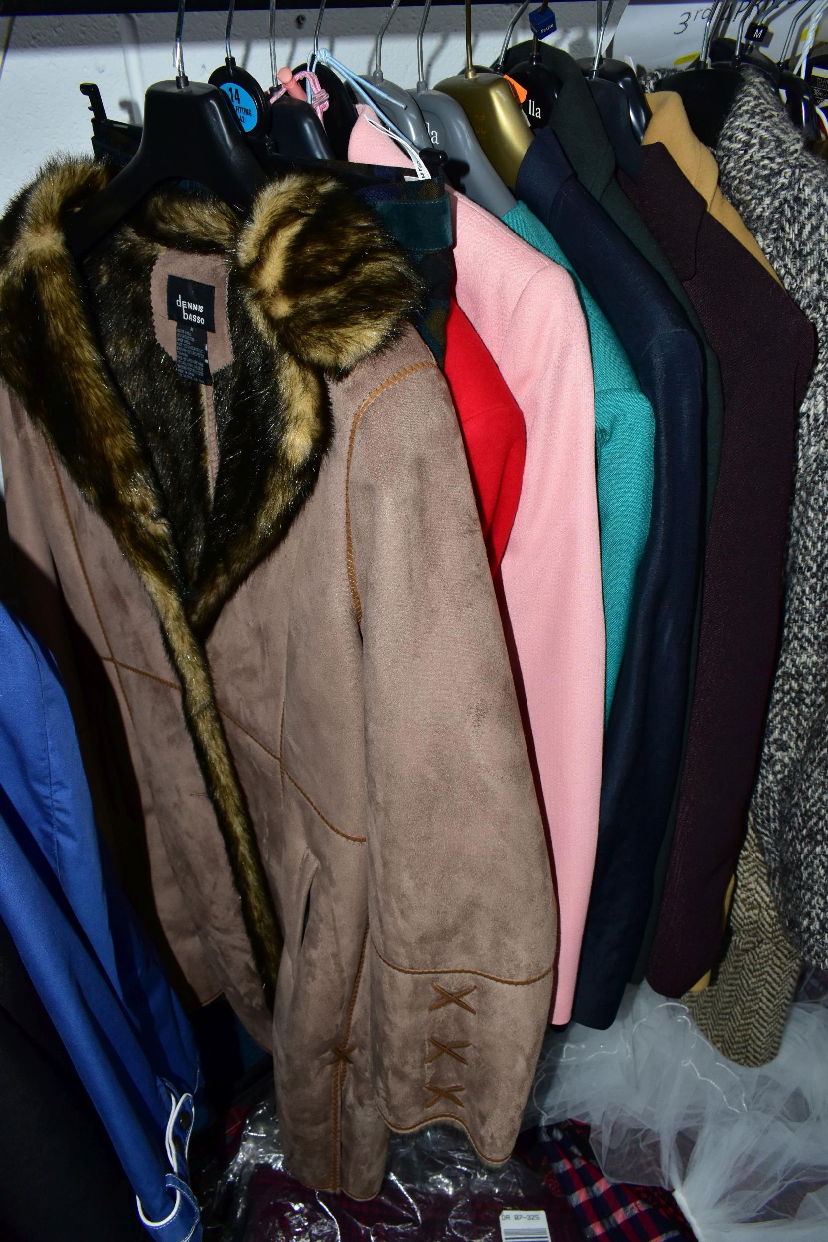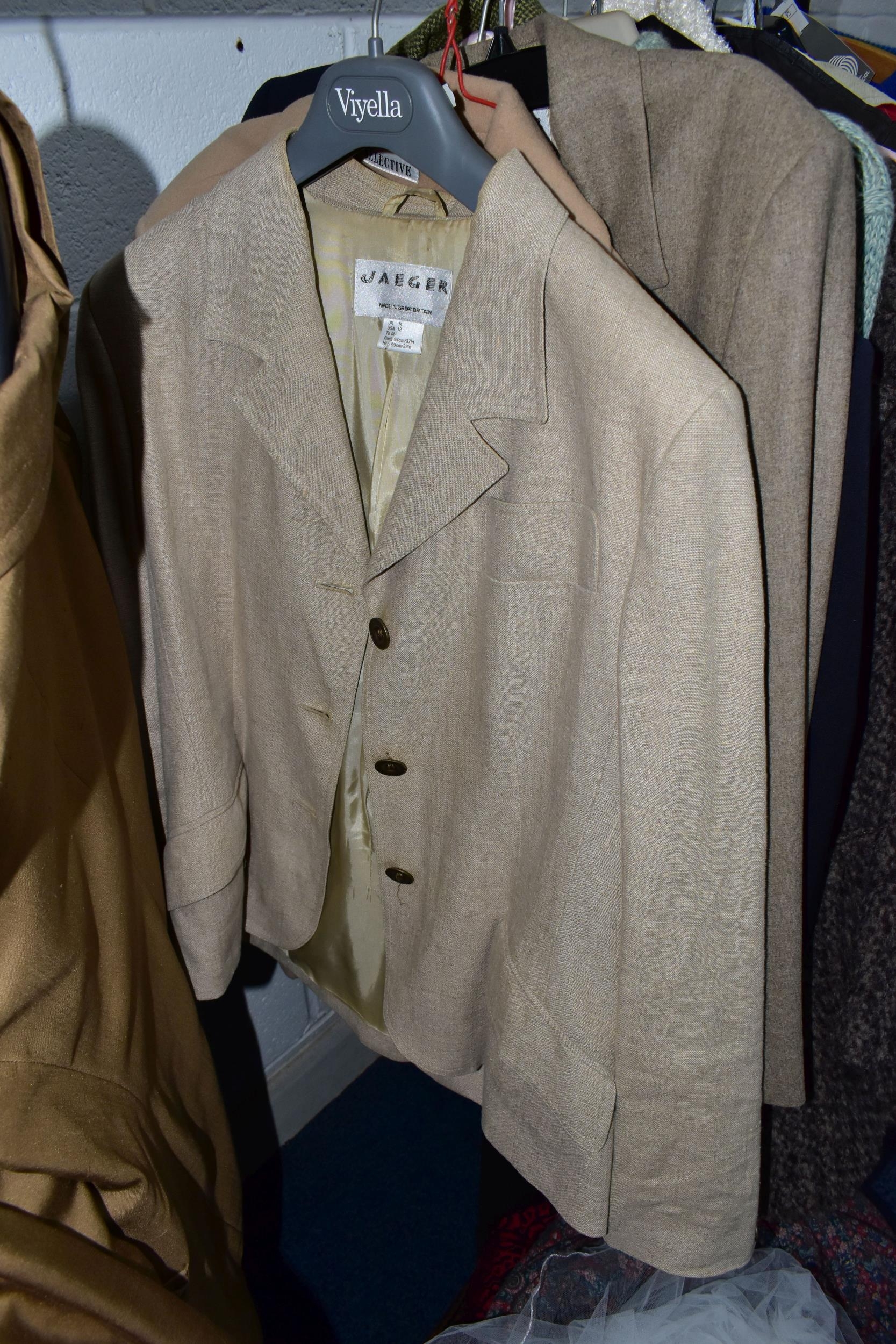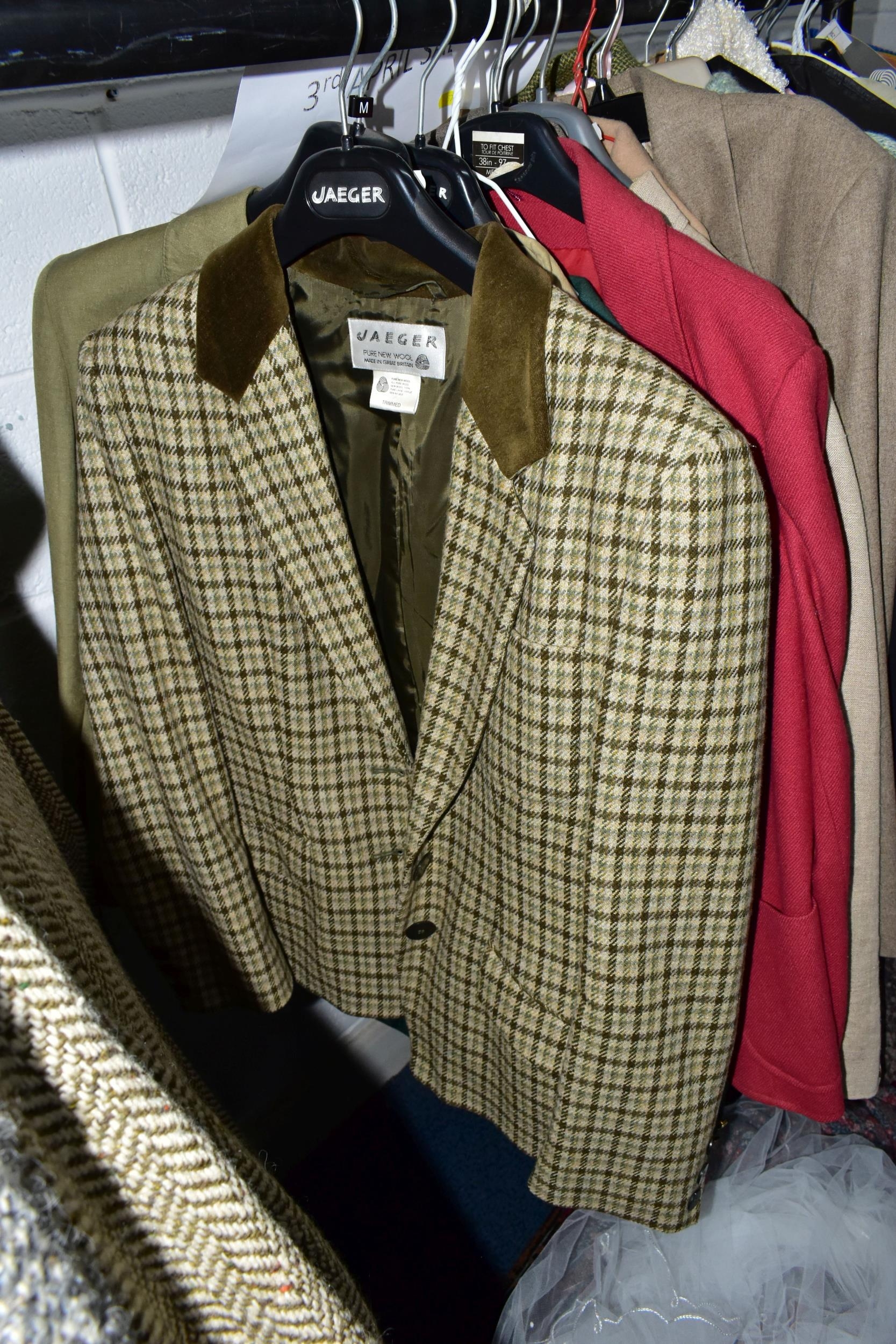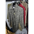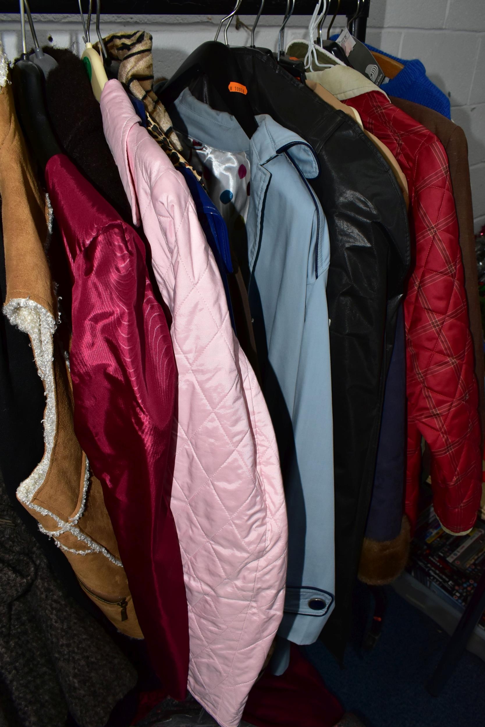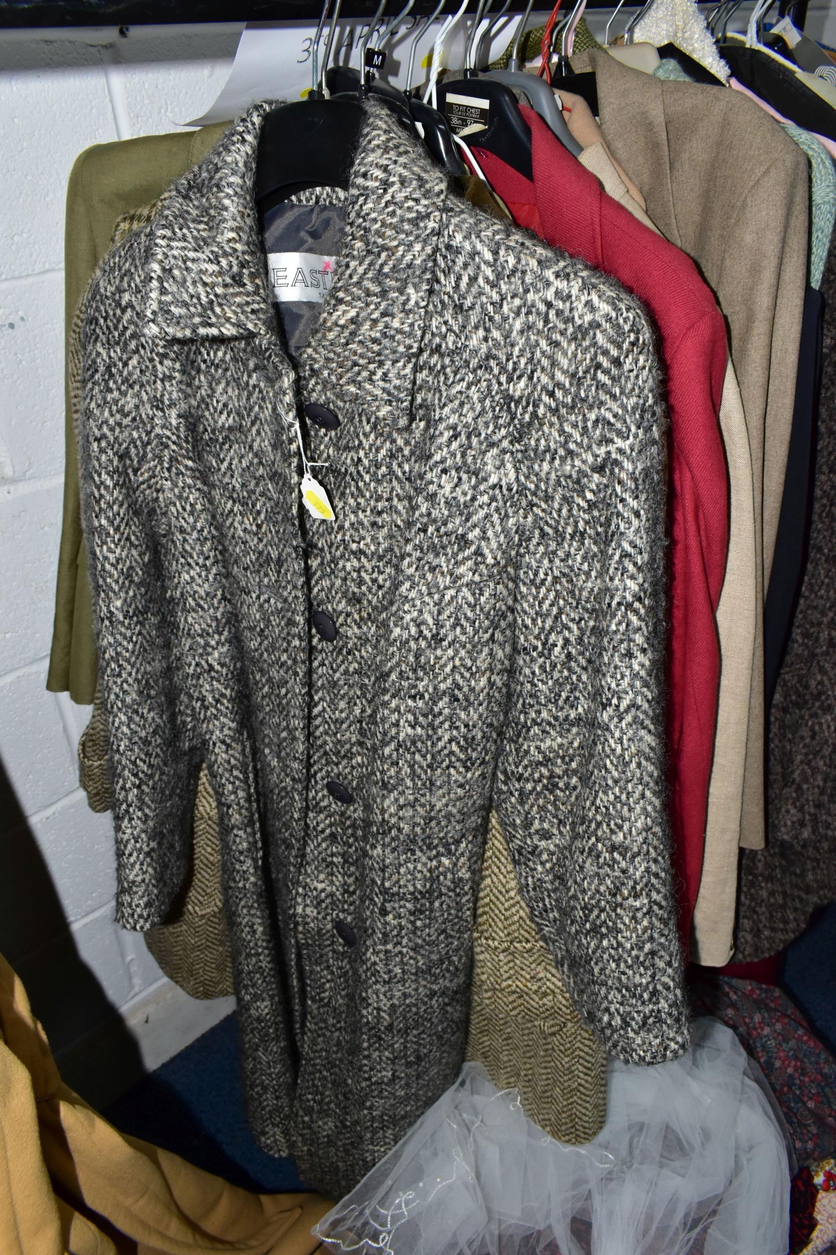 A RAIL AND TWO BOXES OF LADIES CLOTHING, to include coats, jackets, faux furs, sheepskins, skirts and sweaters, maker's names include Jaeger, Daks, Aquascutum, Eastex, etc. (one rail +2 boxes)