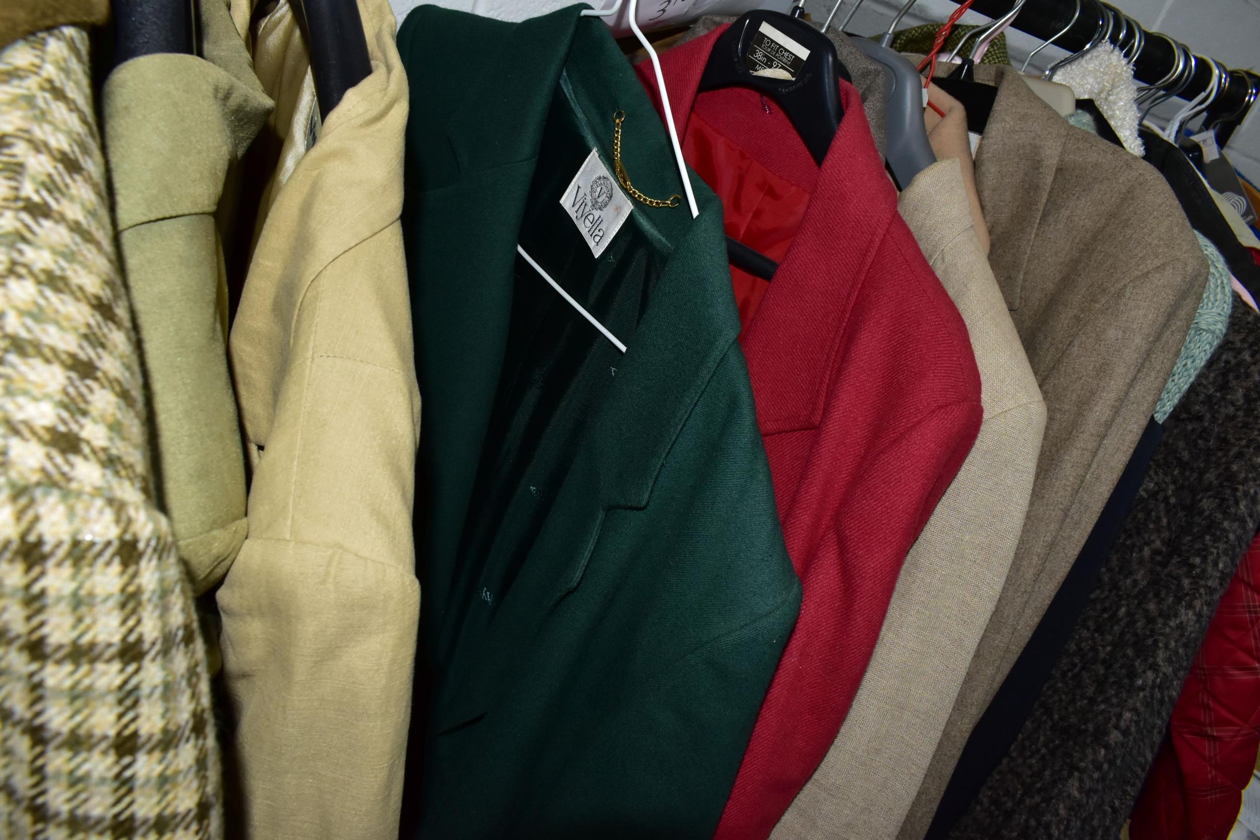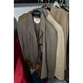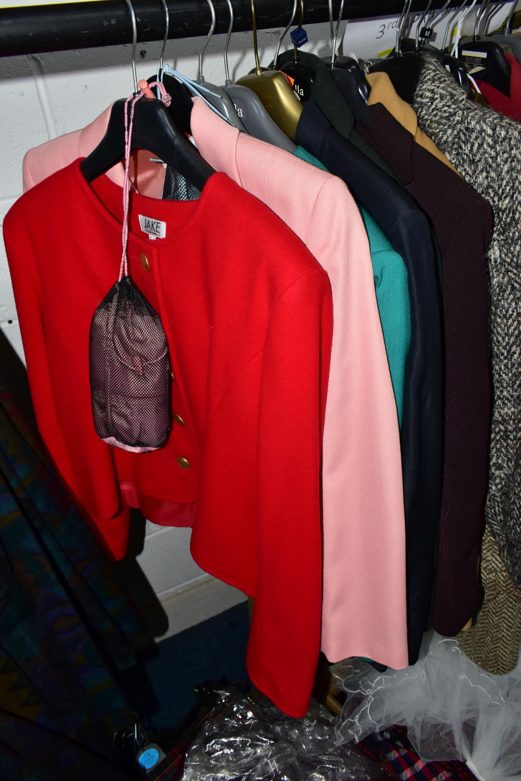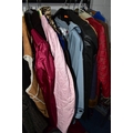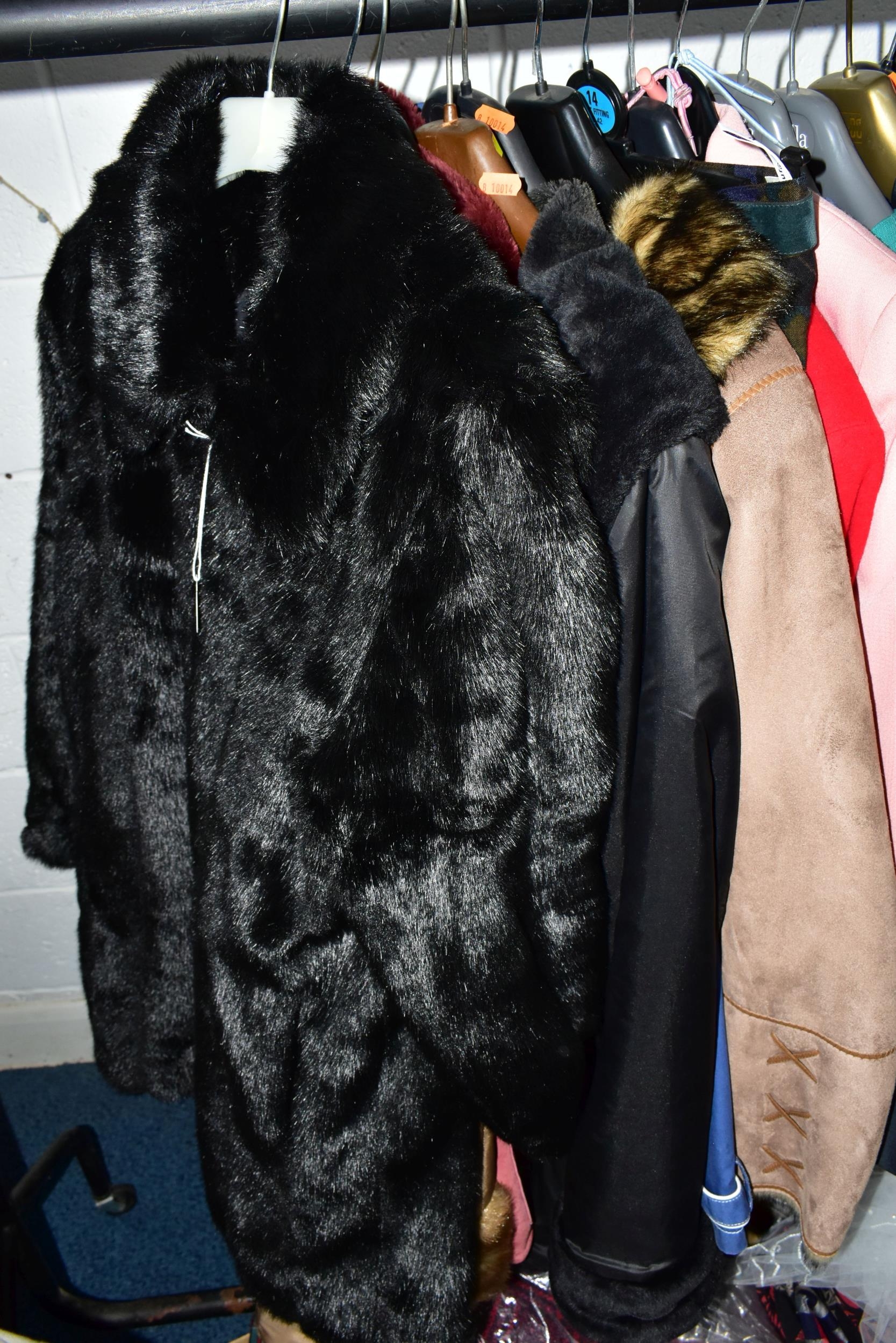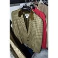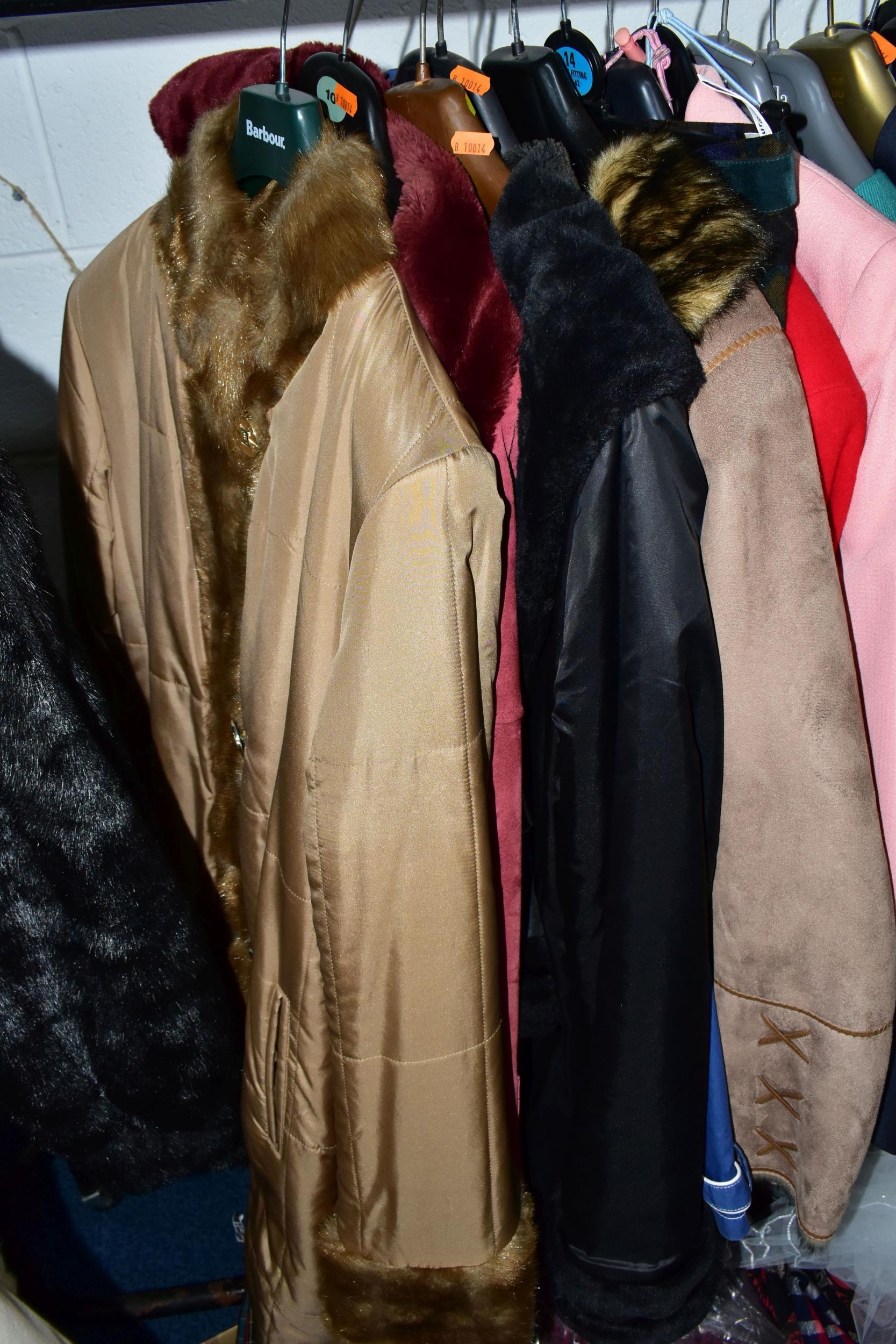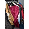 A RAIL AND TWO BOXES OF LADIES CLOTHING, to include coats, jackets, faux furs, sheepskins, skirts and sweaters, maker's names include Jaeger, Daks, Aquascutum, Eastex, etc. (one rail +2 boxes)