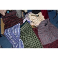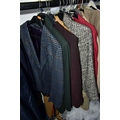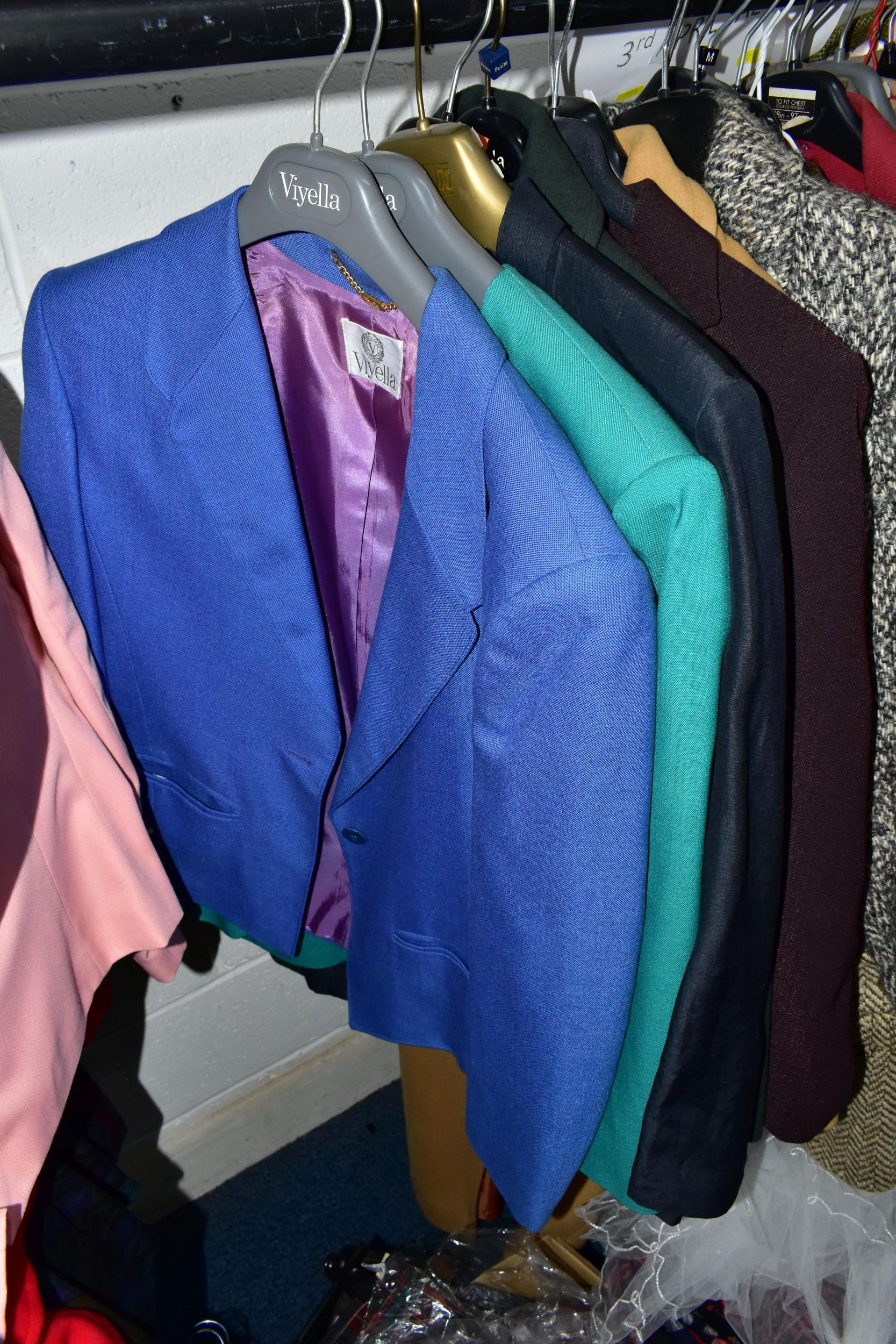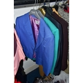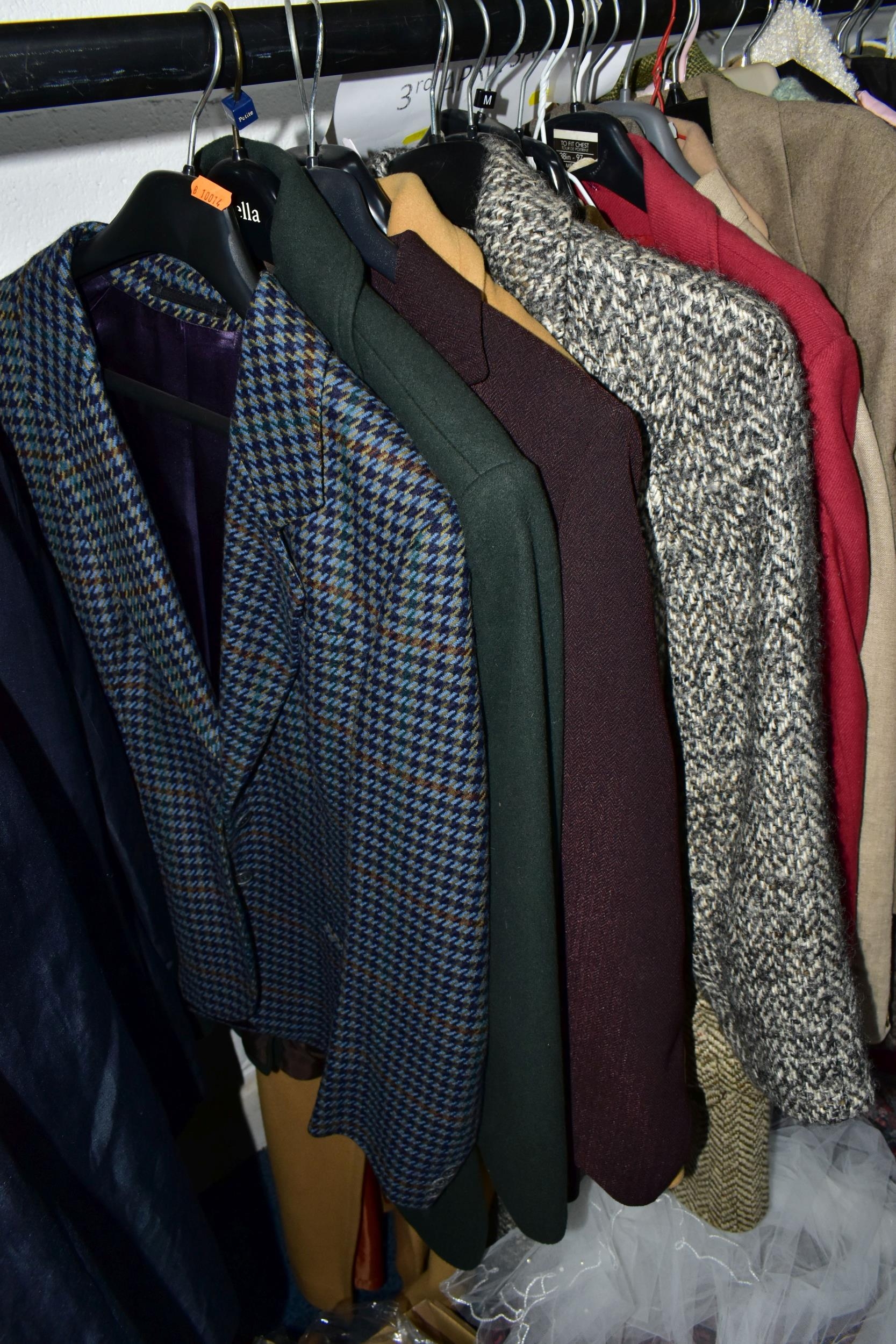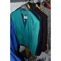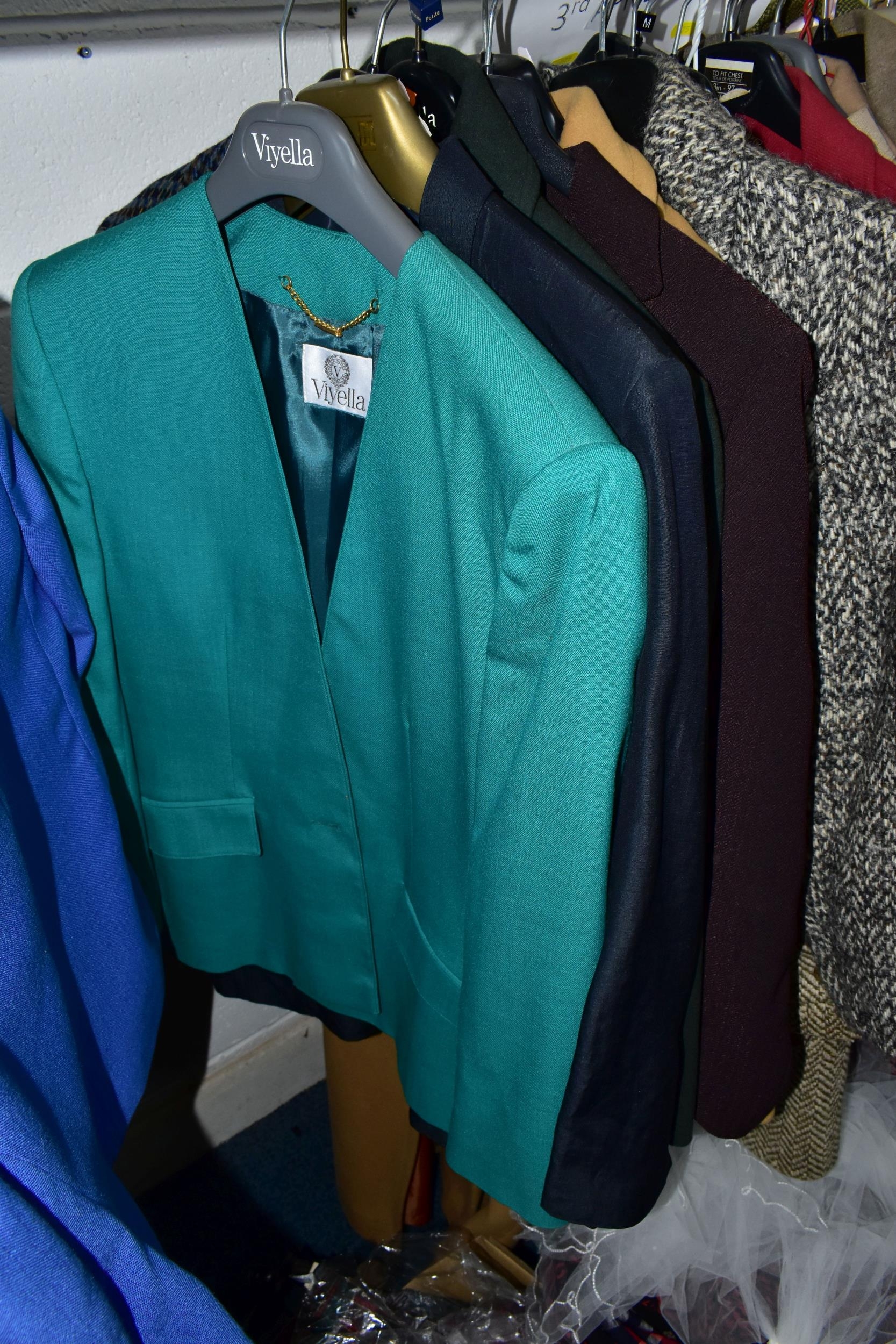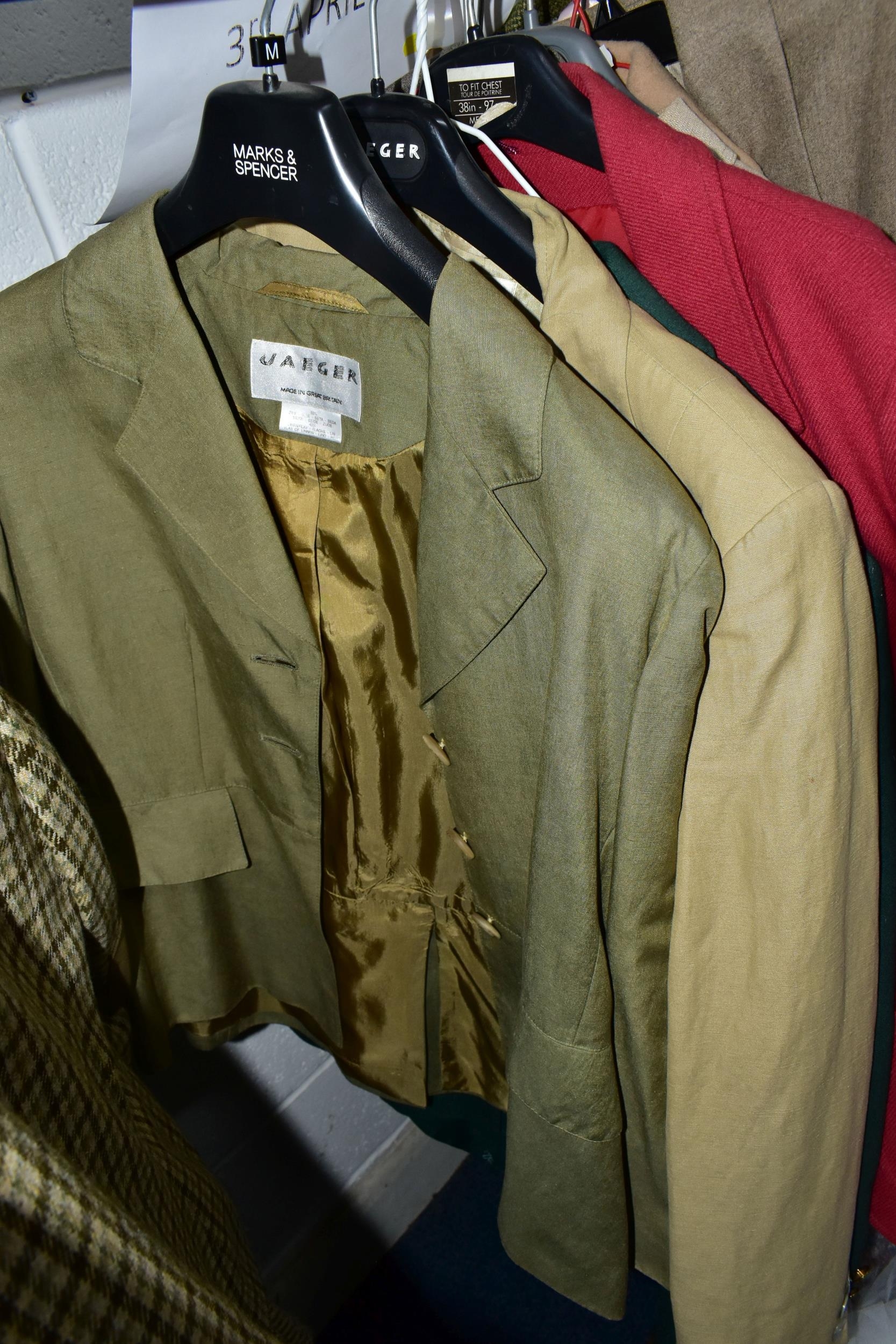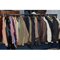 A RAIL AND TWO BOXES OF LADIES CLOTHING, to include coats, jackets, faux furs, sheepskins, skirts and sweaters, maker's names include Jaeger, Daks, Aquascutum, Eastex, etc. (one rail +2 boxes)