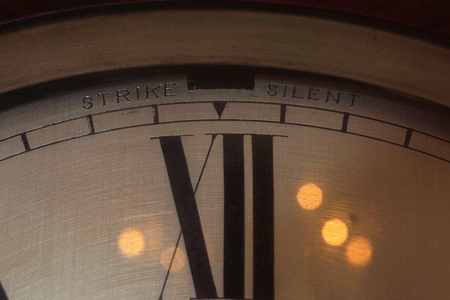 with circular enamelled dial, below a broken arched top, above a slim centre section with door, supported on a stepped plinth. Complete with brass weights and pendulum. 210 cm. high; 45 cm. wide; 25 cm. deep