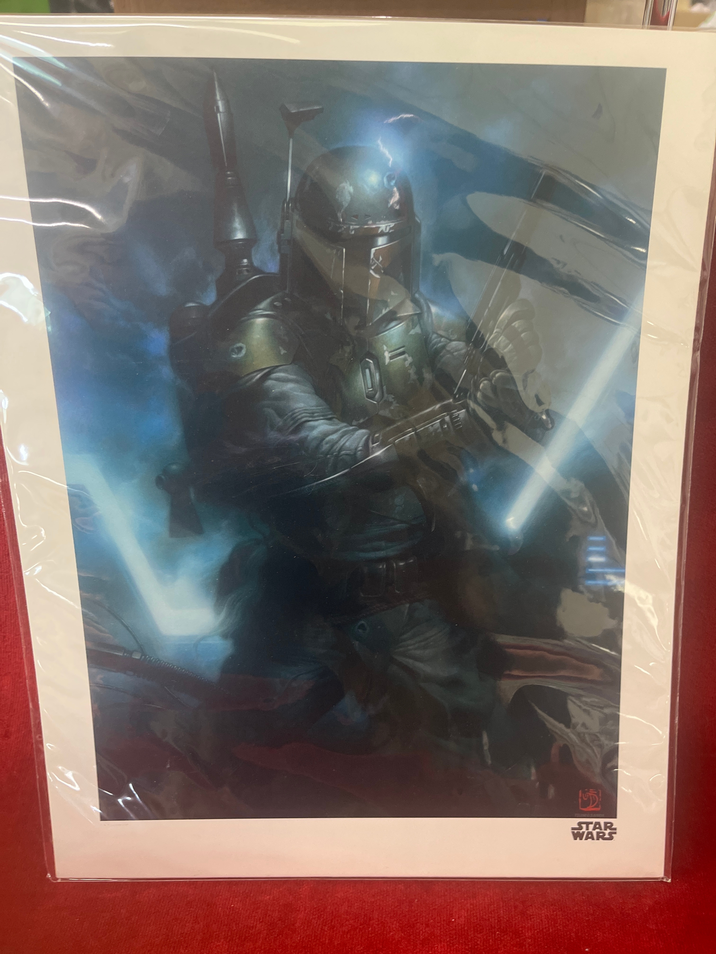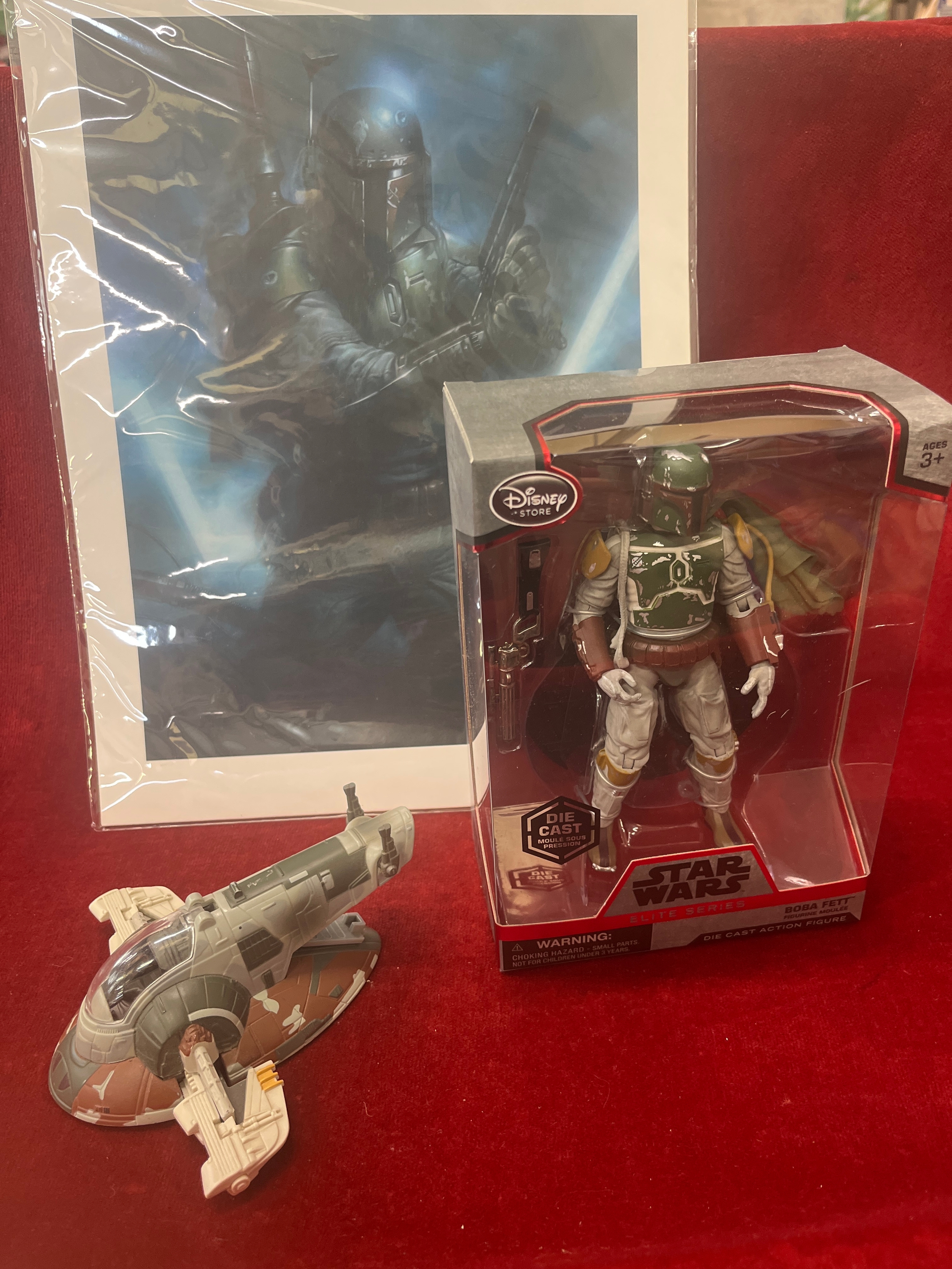 Star Wars boba fett print with certificate of authenticity, a loose ship and an elite Boba Fett figure new boxed