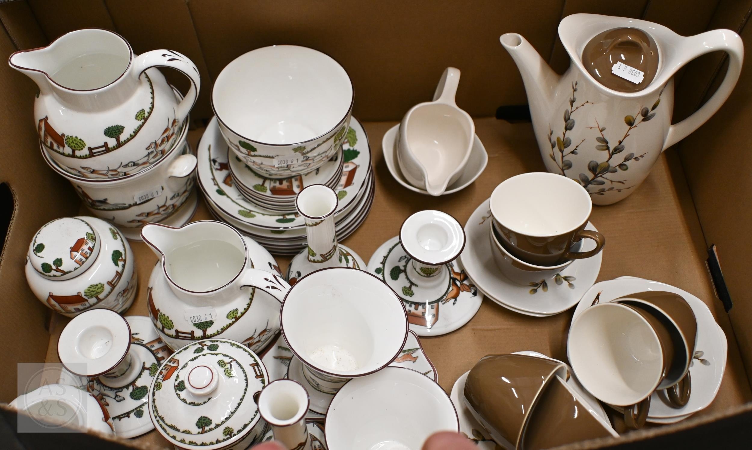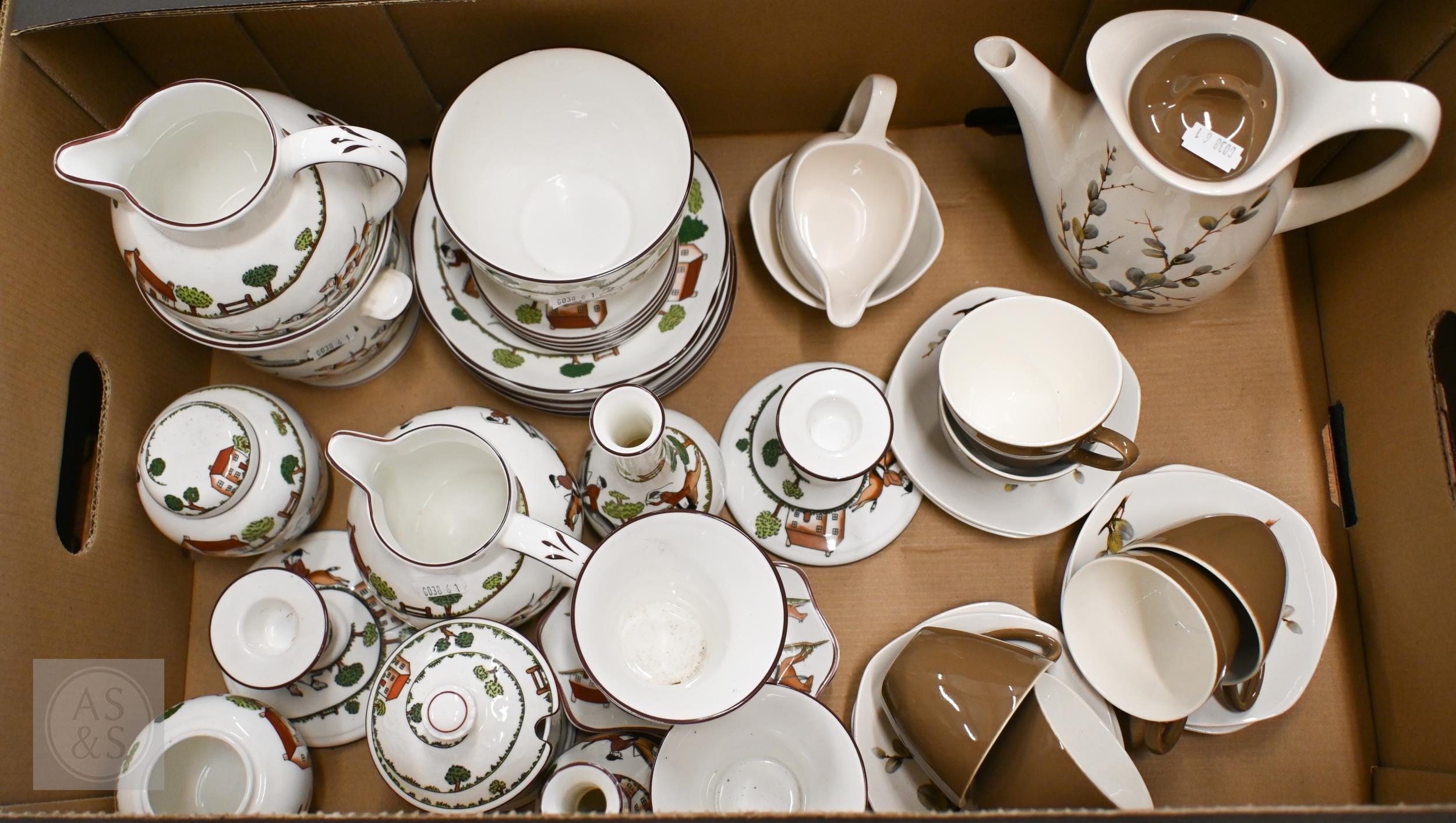 A selection of Coalport 'Hunting Scene' tableware to/w a Midwinter 'Fashion Shape' coffee service, printed with pussy willow (box)
