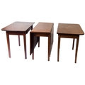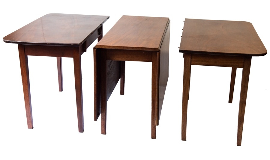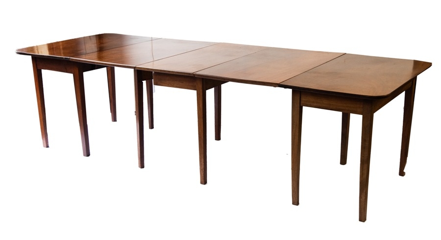 LATE GEORGIAN MAHOGANY EXTENDING DINING TABLE, comprising: PAIR OF TABLE PATTERN END SUPPORTS and a CONFORMING DROP LEAF CENTRE SECTION, all with square legs, 27 ¾” (70.5cm) high, 38 ¼” (97.2cm) wide, 101 ½” (257.8cm) long