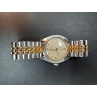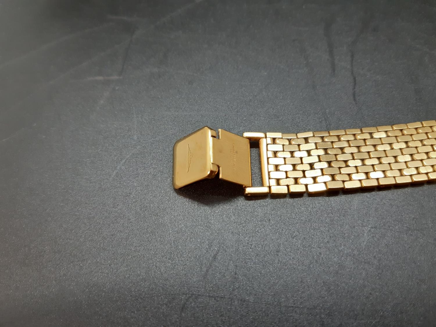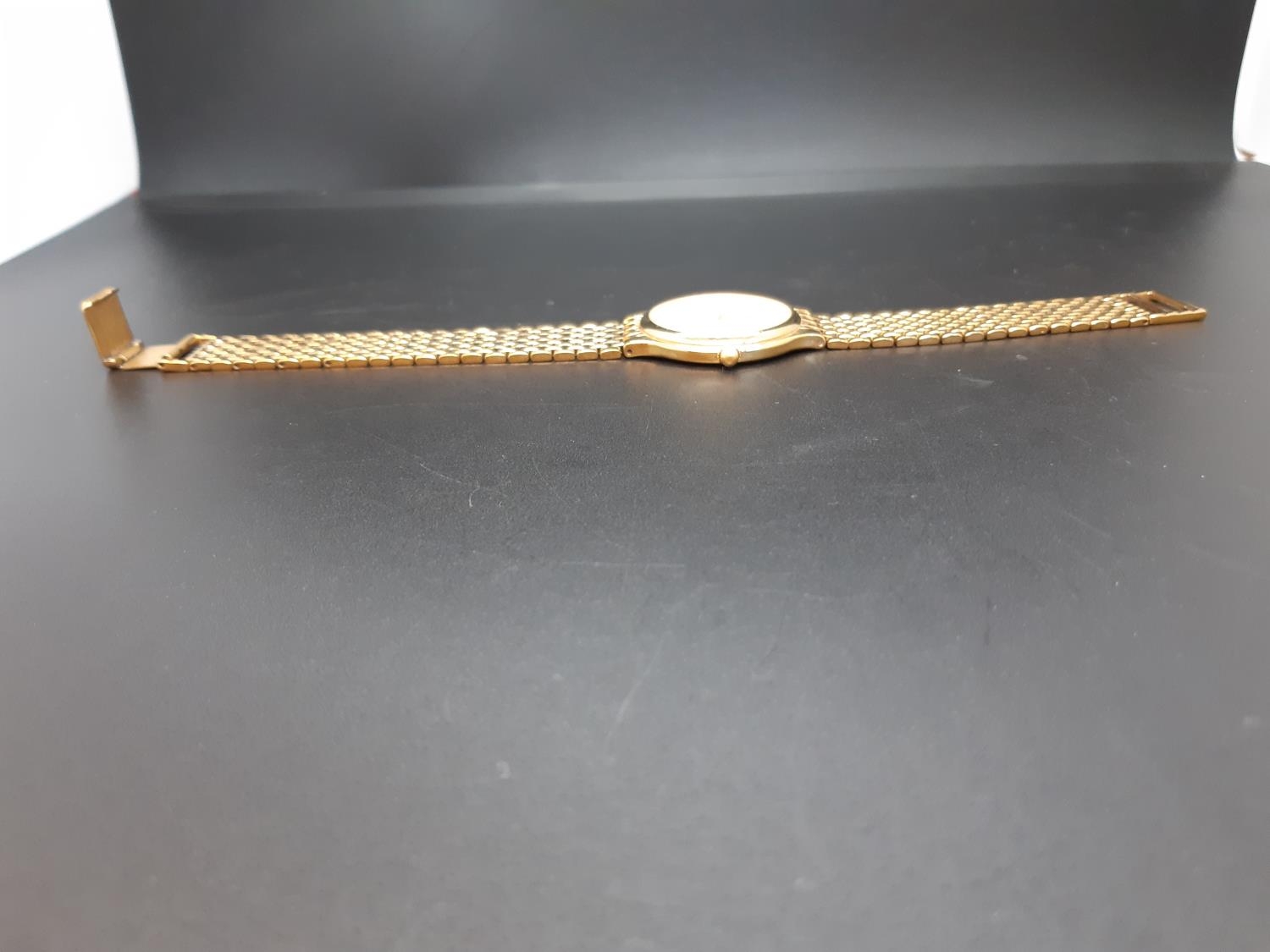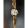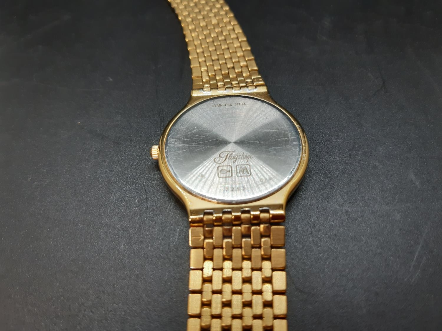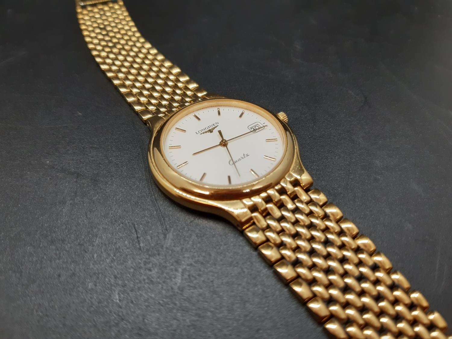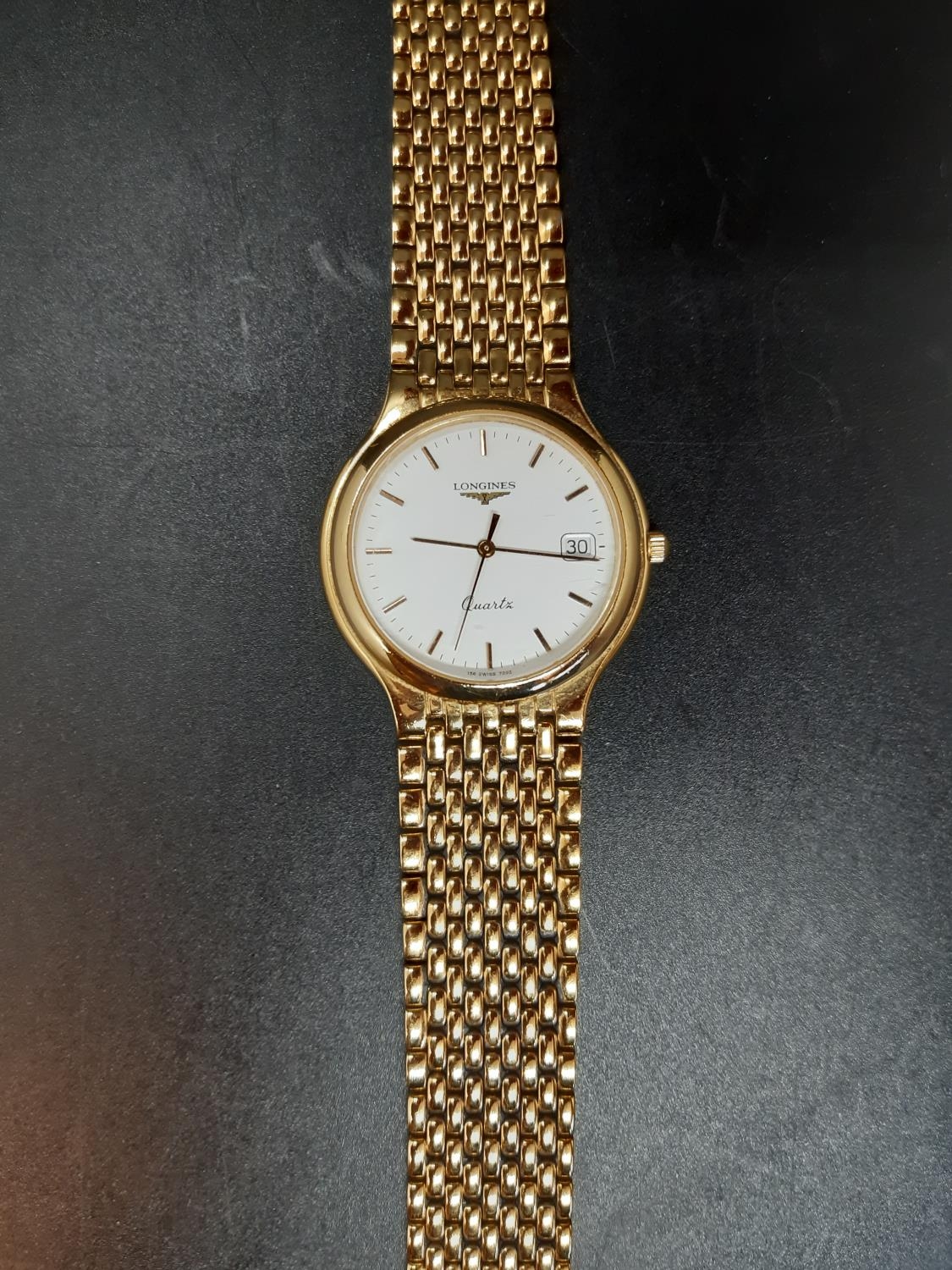 A gents Longines Quartz Flagship 7292 wristwatch with white dial, gold tone hourly batons, the date aperture towards 3 o’clock and a gold plated brick linked strap - numbered 25593116