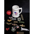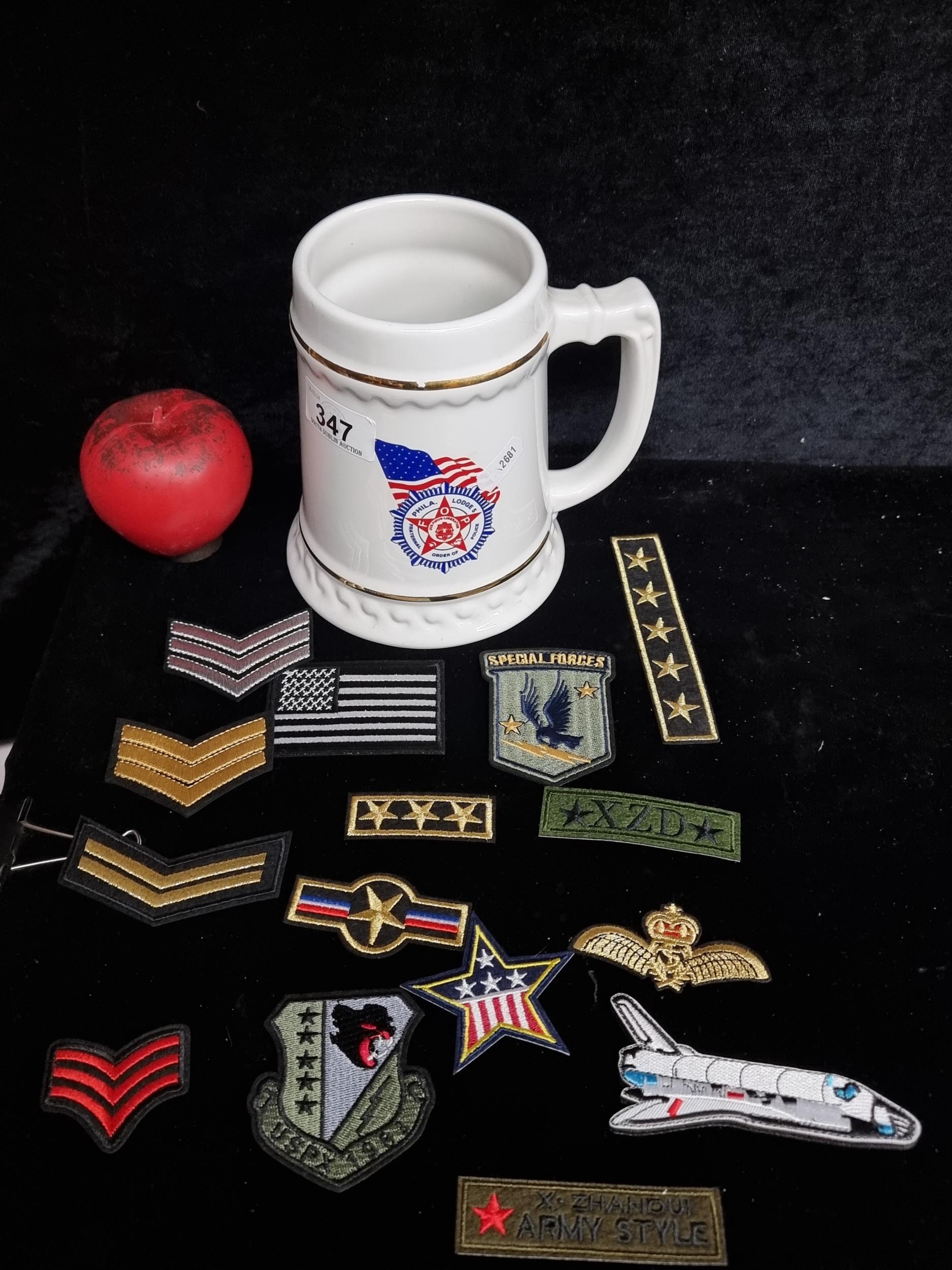 A lot of American Forces interest including 15 sew on patches / badges and a ceramic tankard for the Philadelphia Police Force.