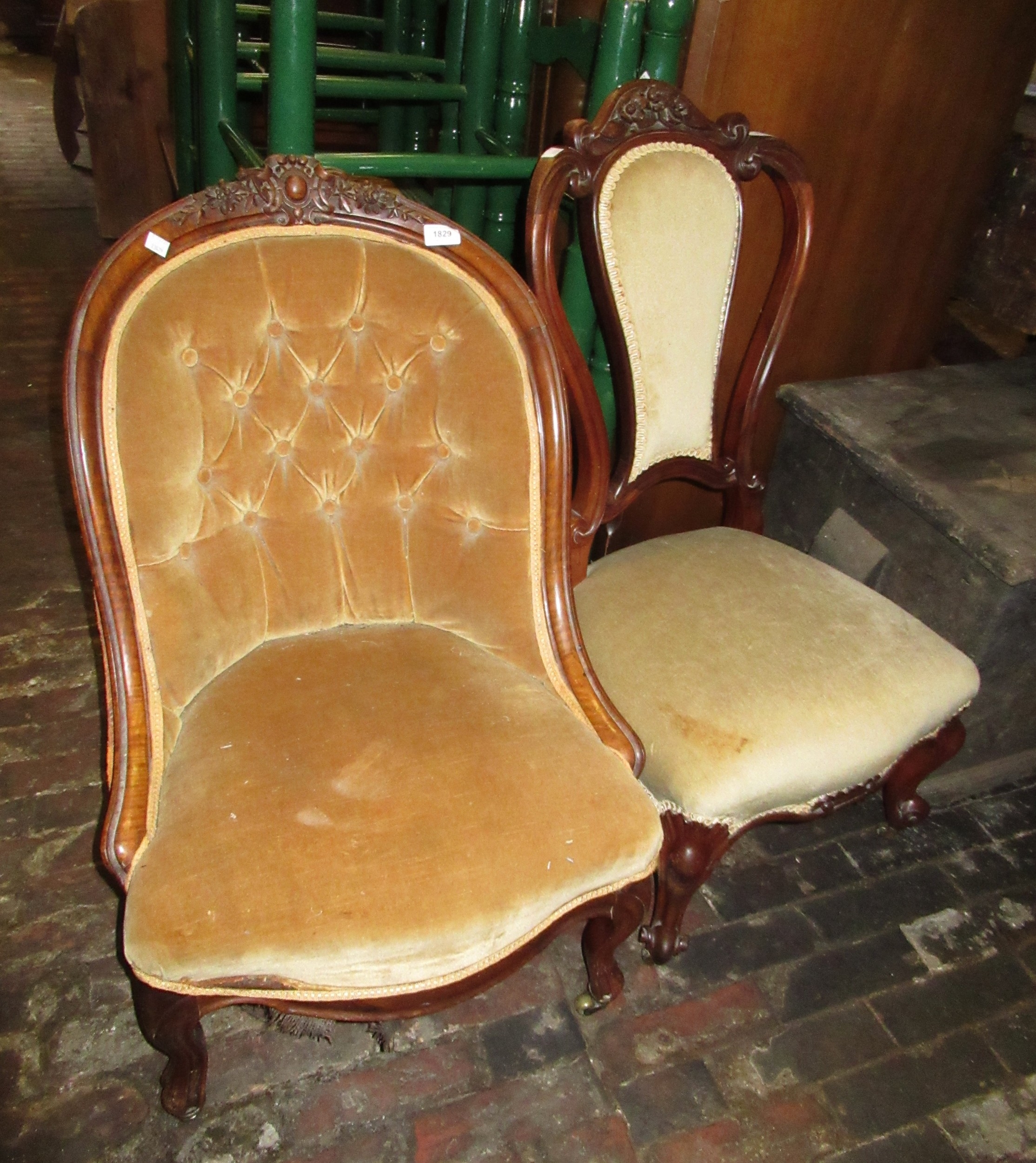 Victorian button upholstered low seat nursing chair, together with another similar chair