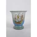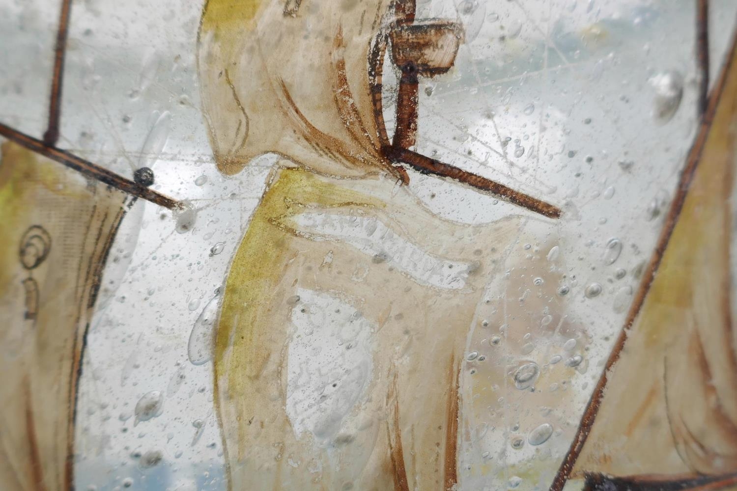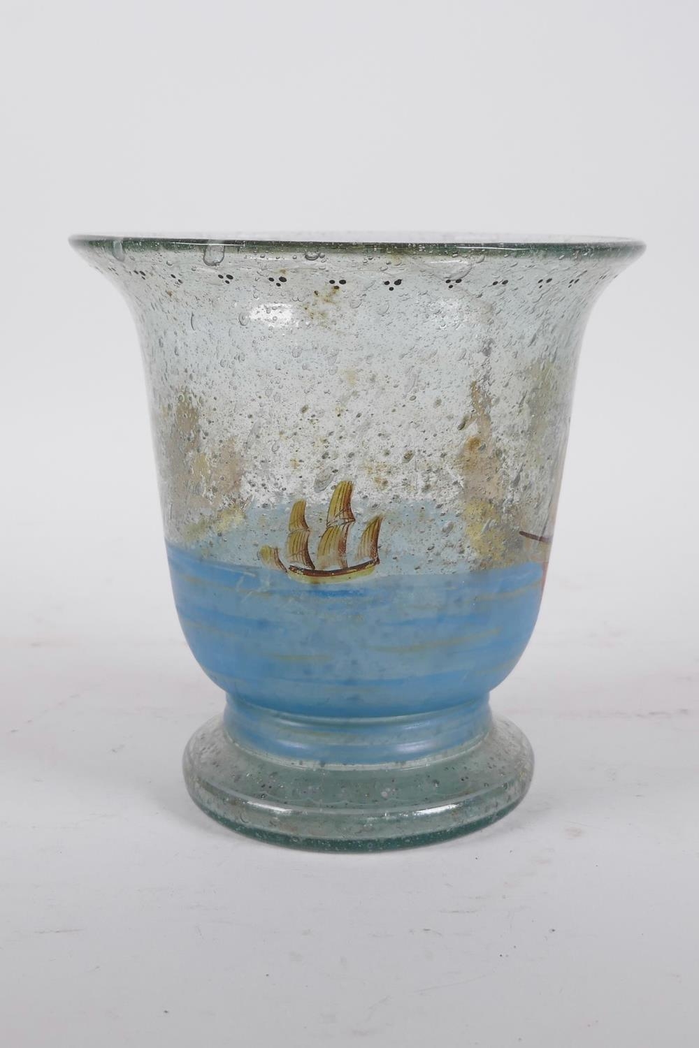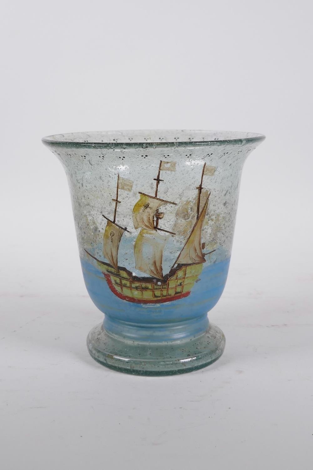 An early C20th American tavern glass vase decorated with the Santa Maria, Pinta and Nina, probably Pairpoint glass, 6" high