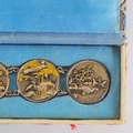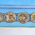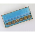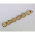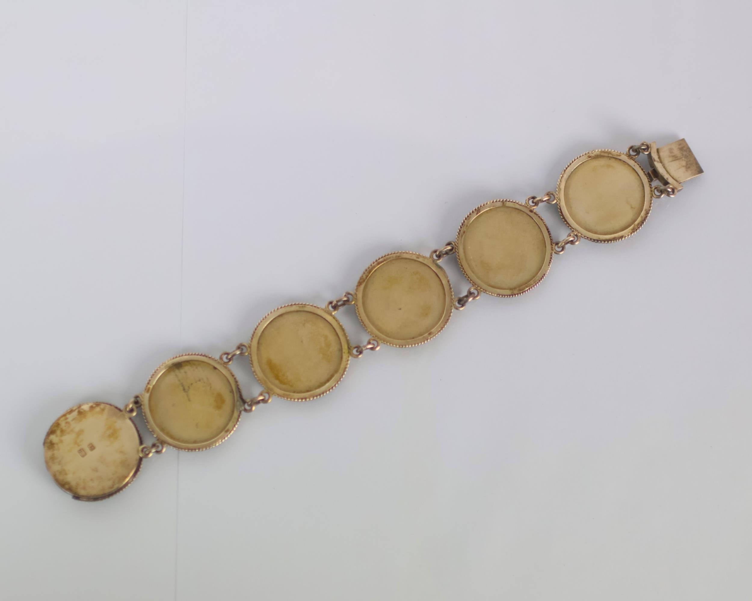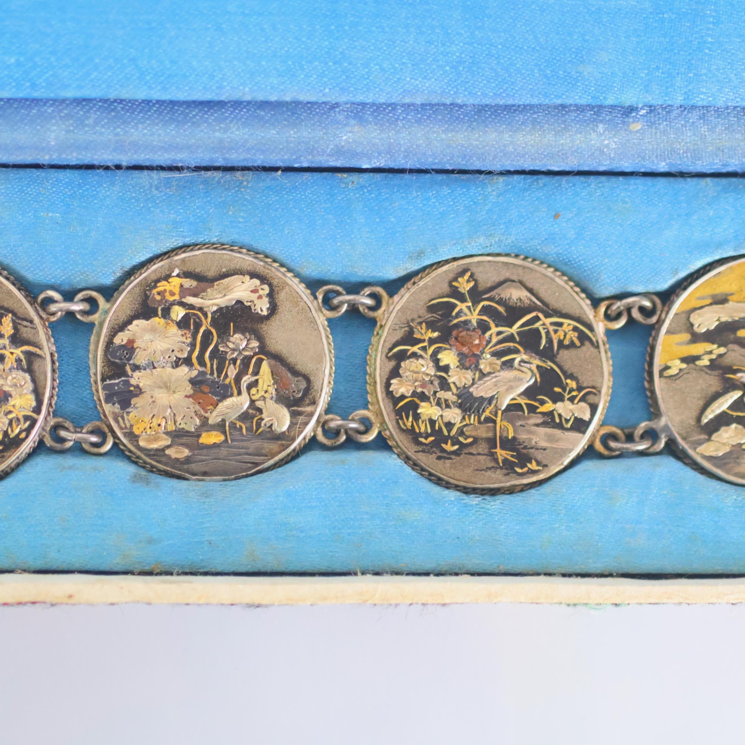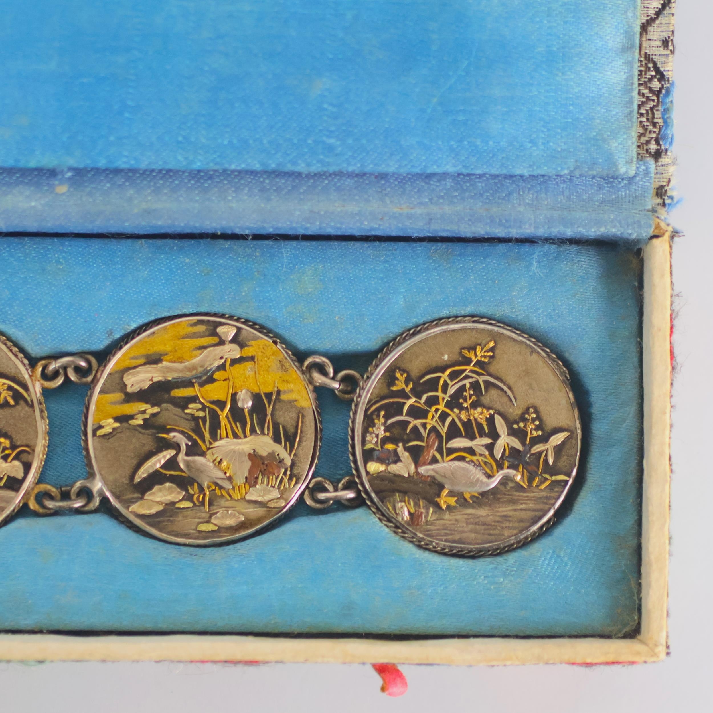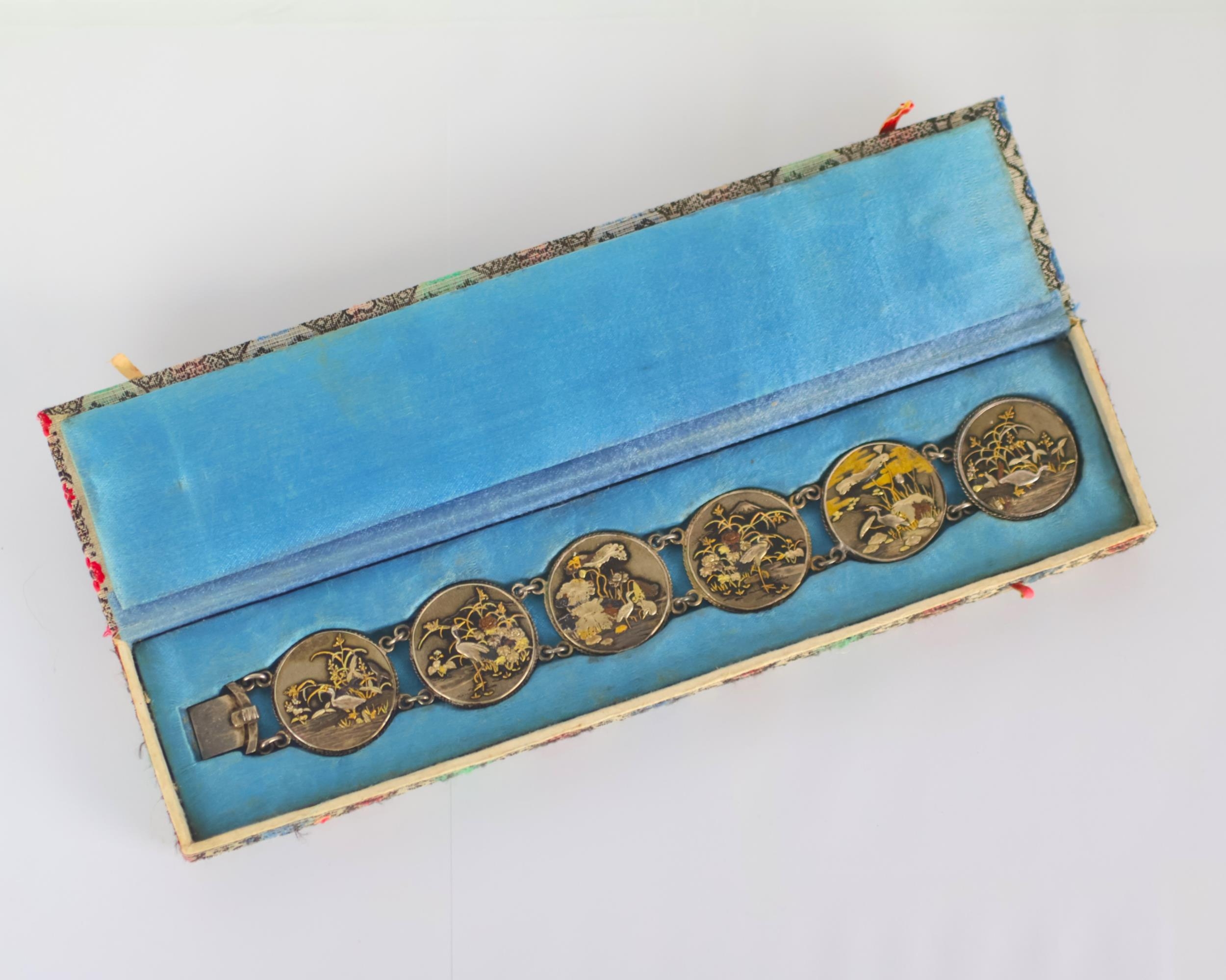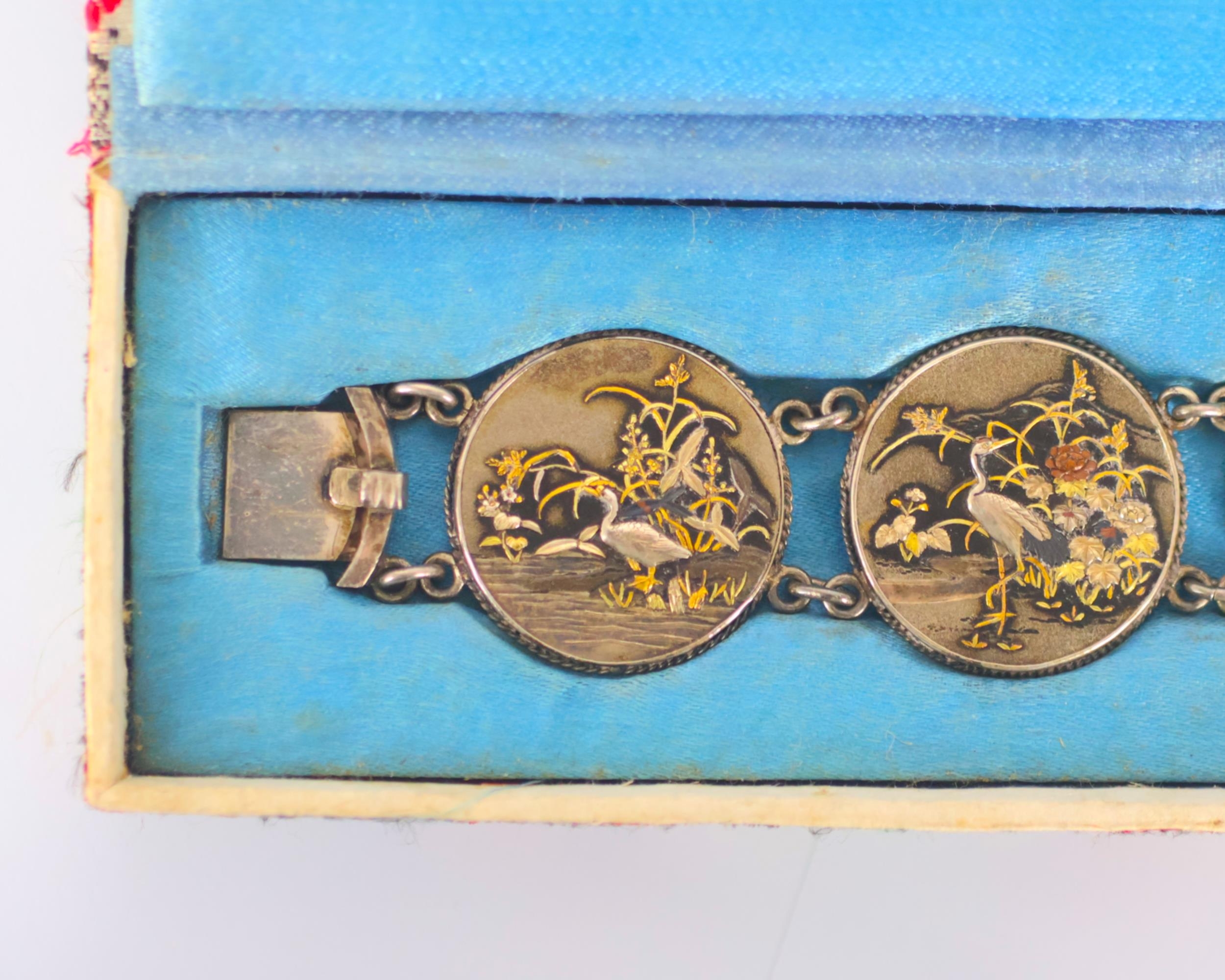 A mid 20th century Japanese Shakudo bracelet, the six circular panels depicting scenes of cranes amongst foliage, highlighted with yellow metal detail, one panel stamped to reverse with character marks and 'YS' with tongue and box fastener, 20cm long, 64gms, within fitted box