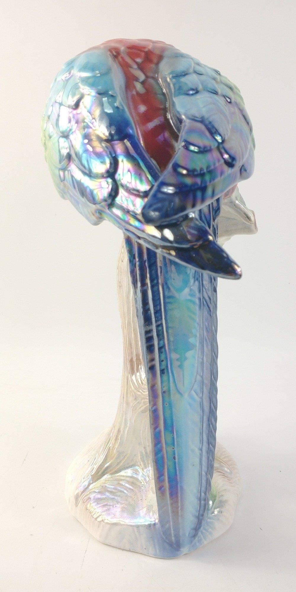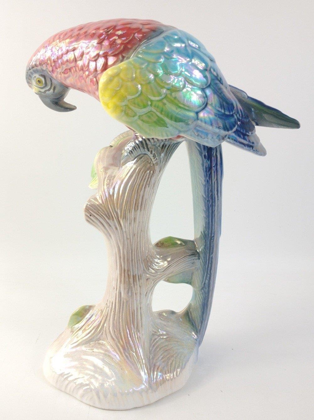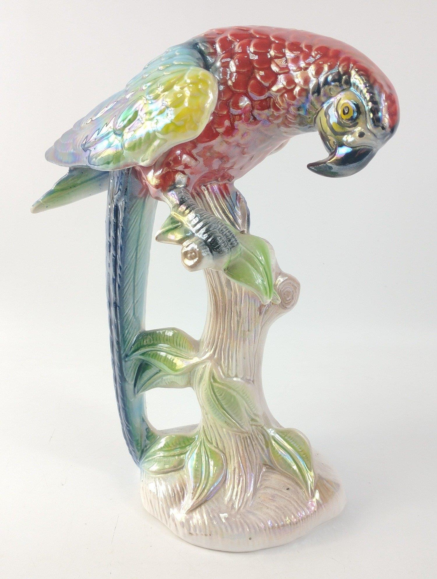 A luminously and richly coloured "Jema" (Holland) Lustre ceramic perching parrot. Approx. 29cm in height.