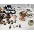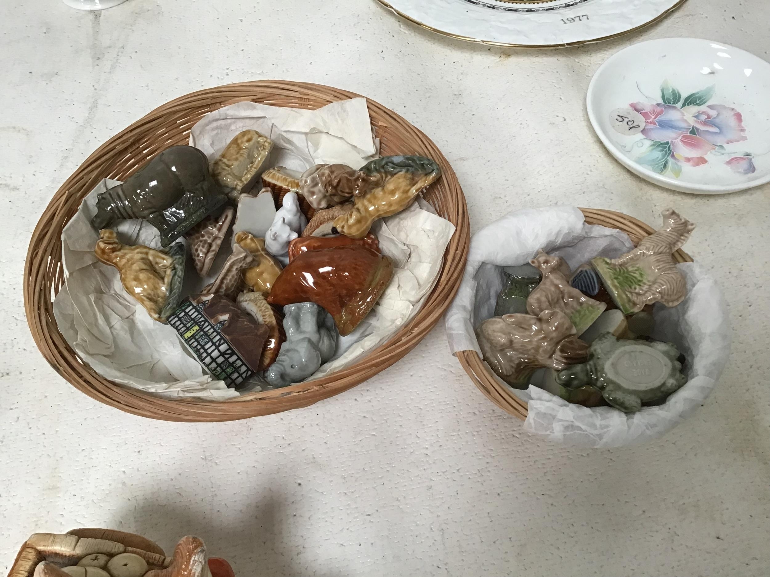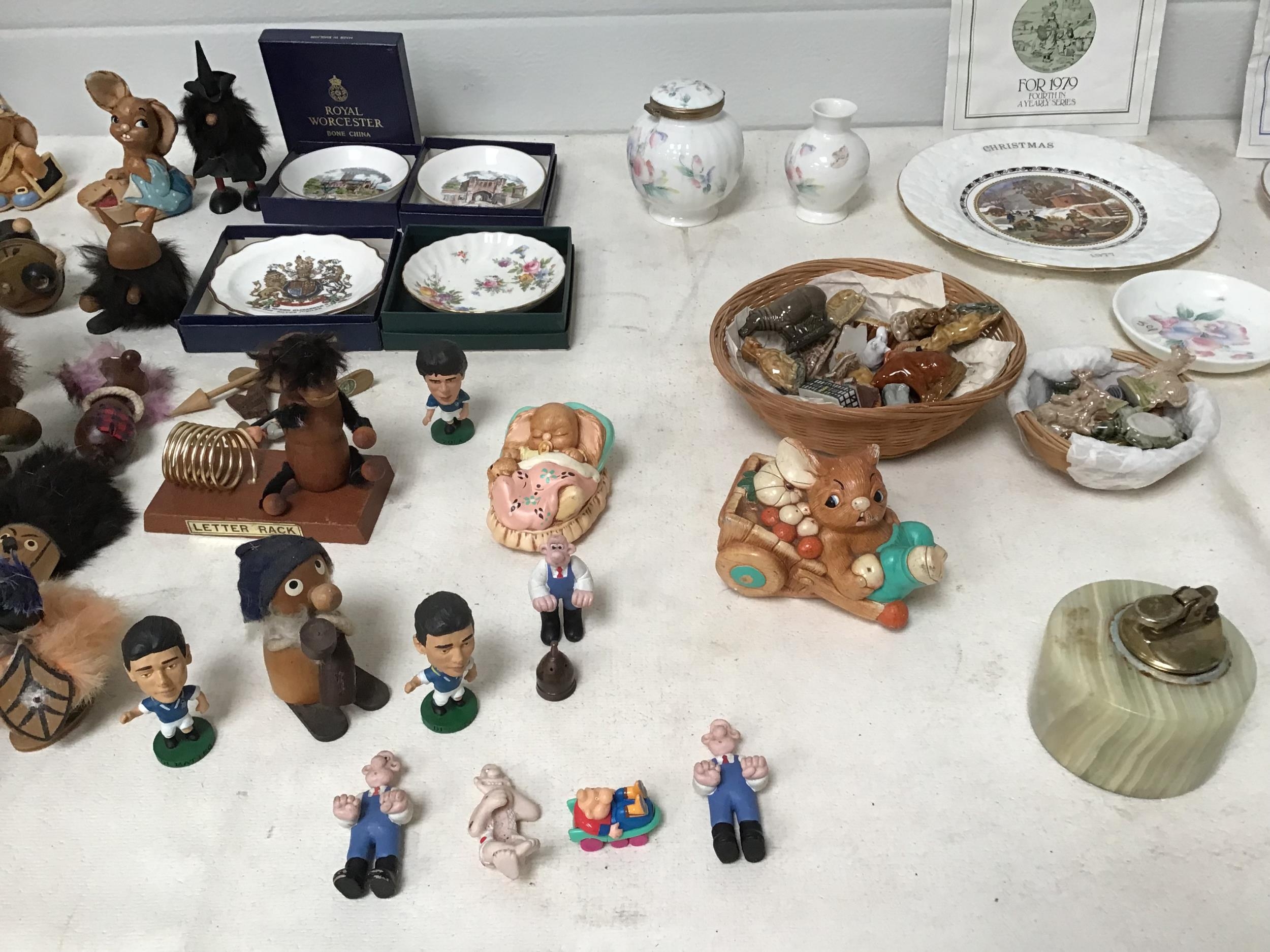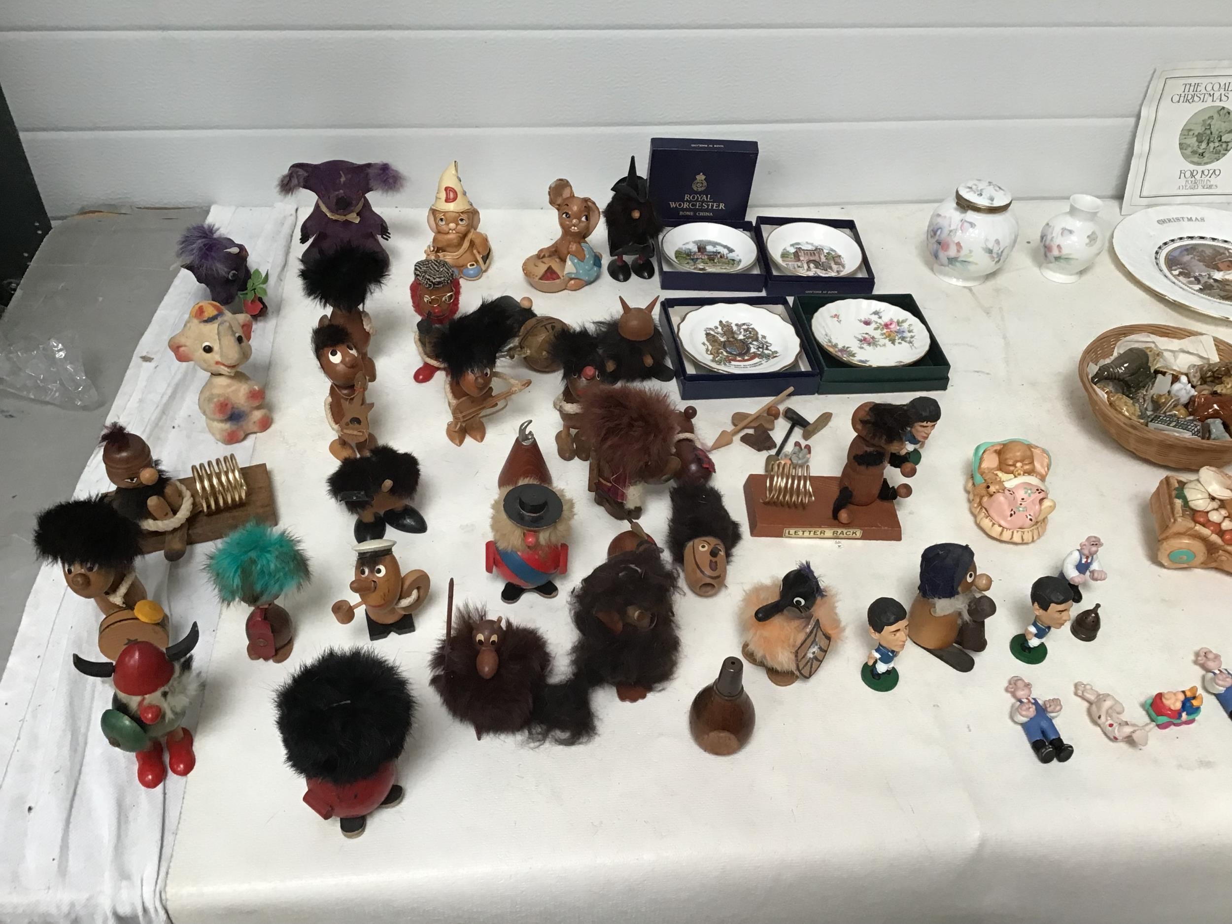 BOX OF COLLECTABLES TO INC WADE WHIMSIES AYNSLEY PENDELFIN FIGURES WOODEN FIGURES ETC