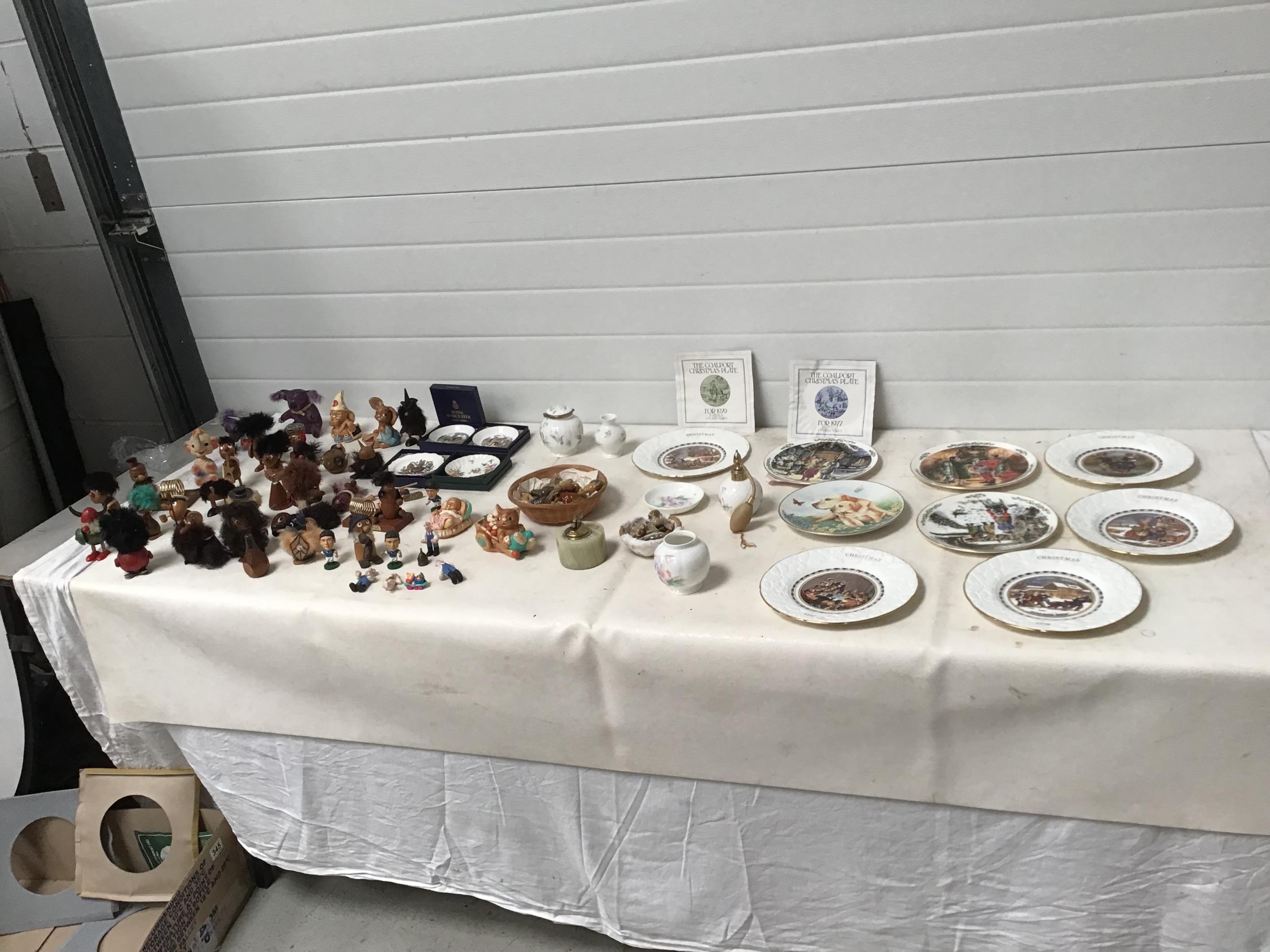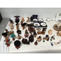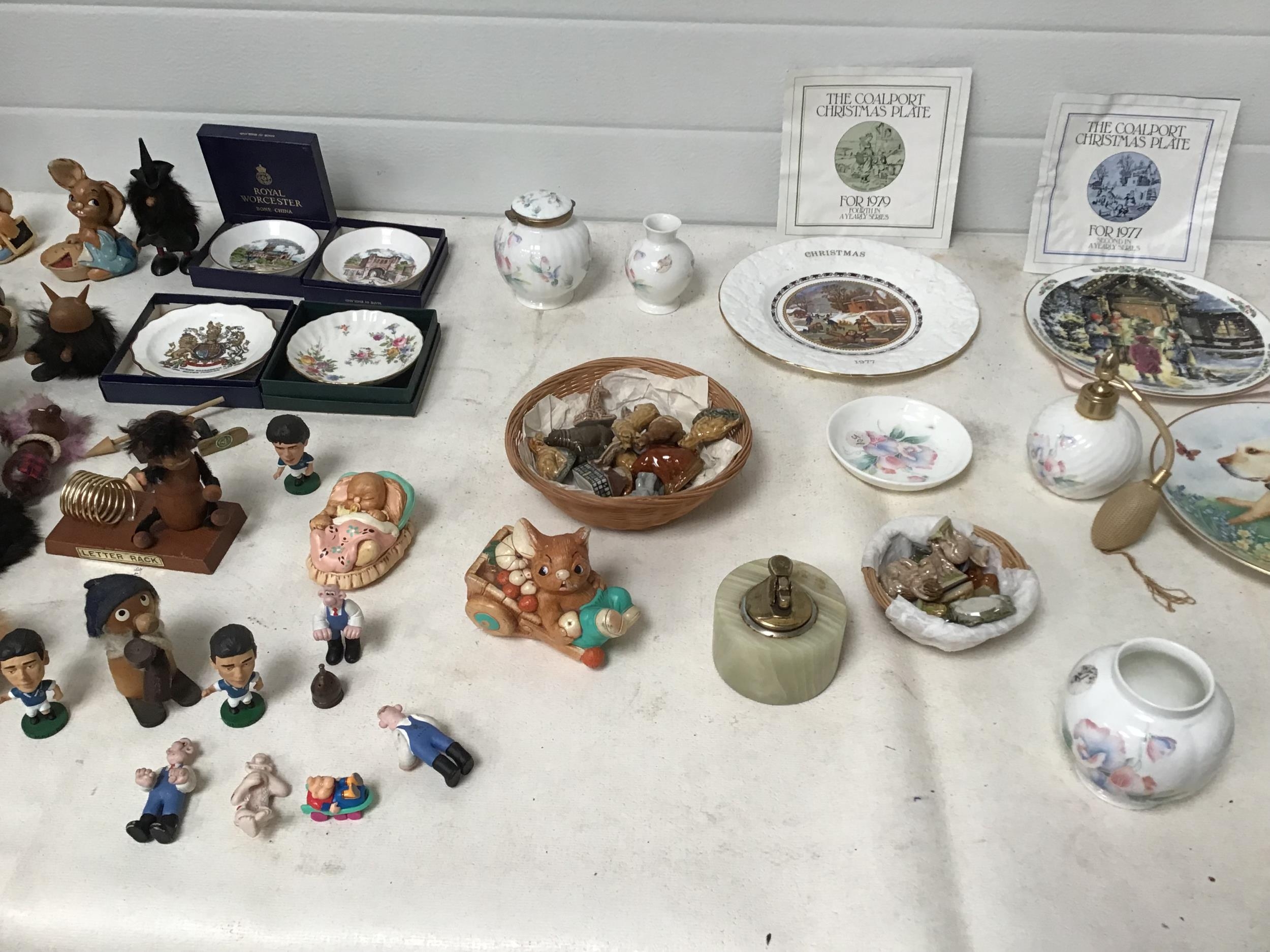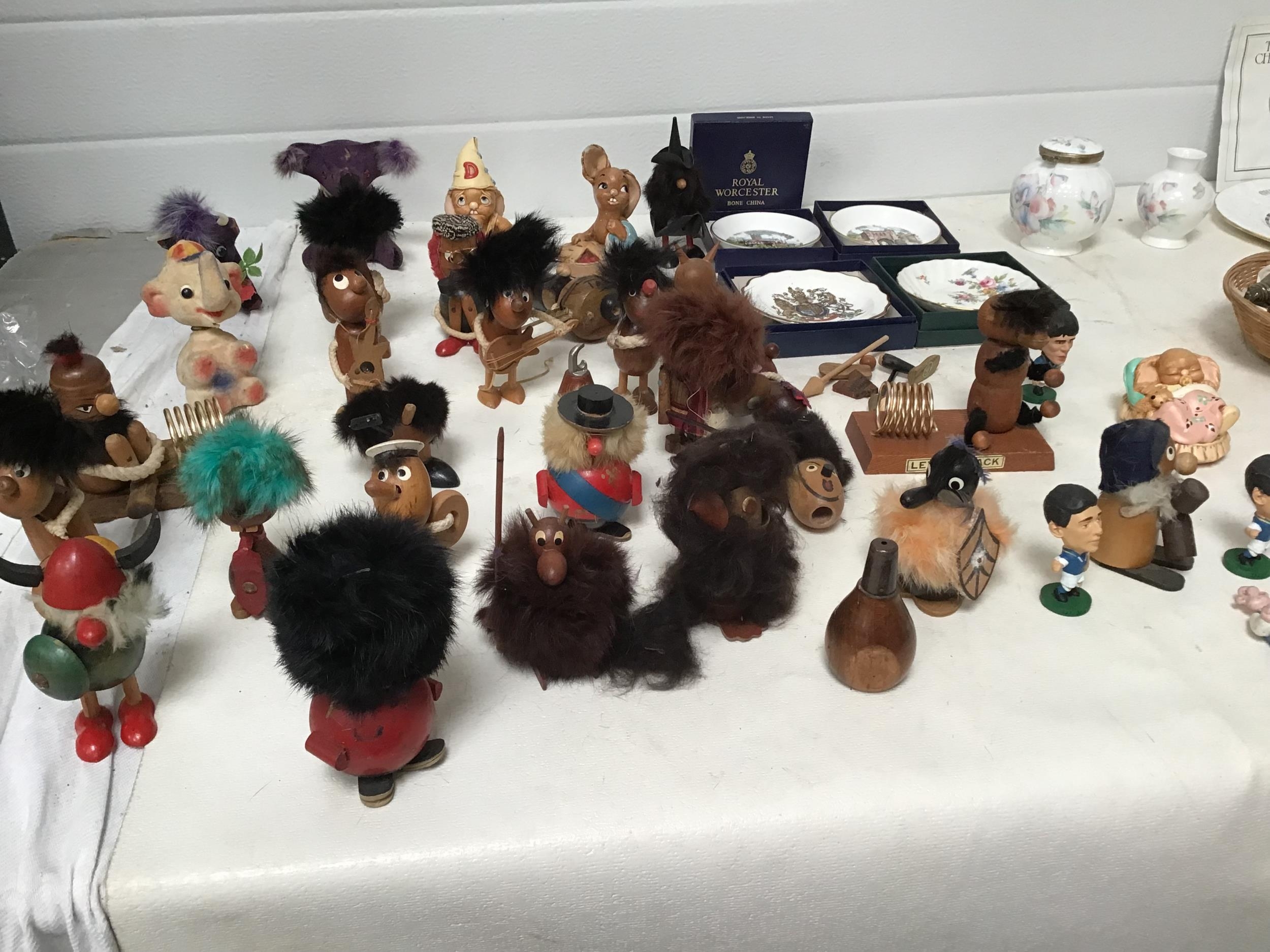 BOX OF COLLECTABLES TO INC WADE WHIMSIES AYNSLEY PENDELFIN FIGURES WOODEN FIGURES ETC