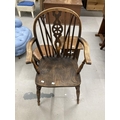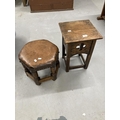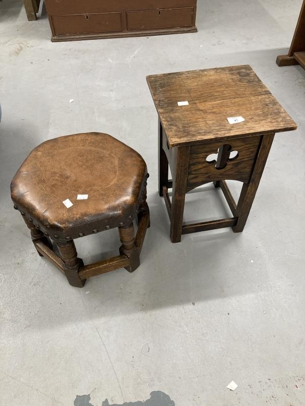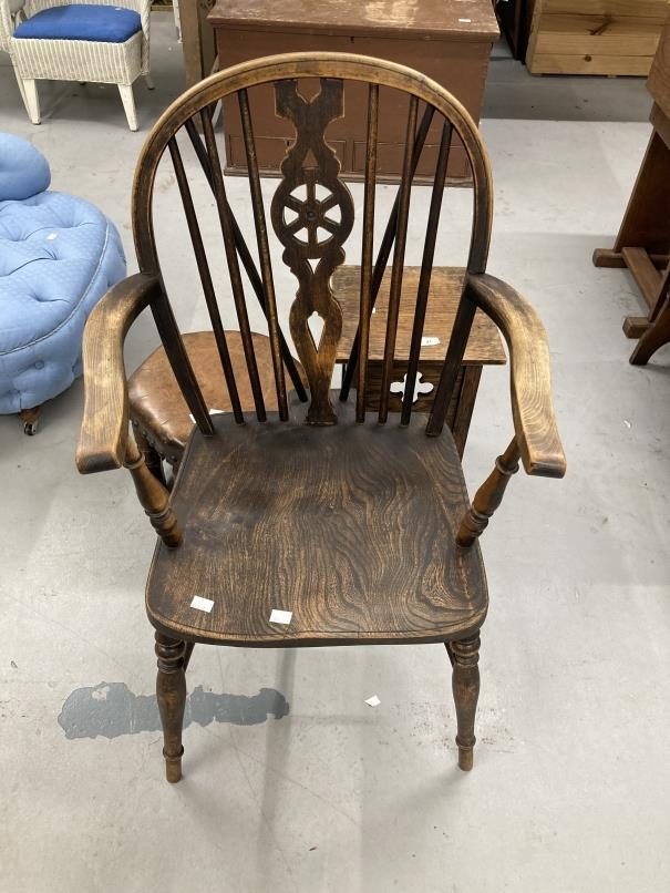 20th cent. Elm and beech wheel back carver, leather topped hexagonal stool plus small oak side table.