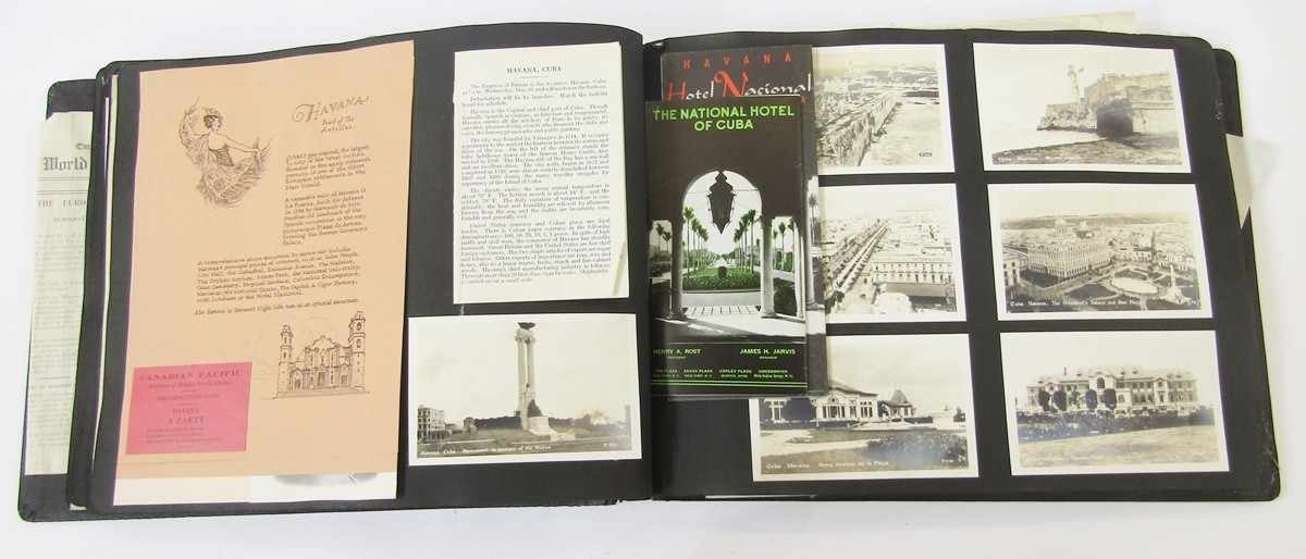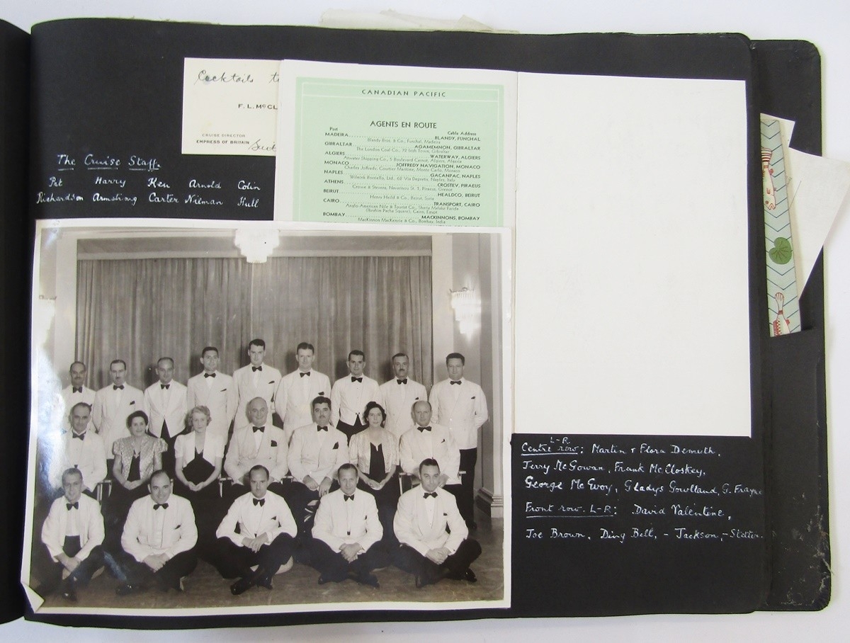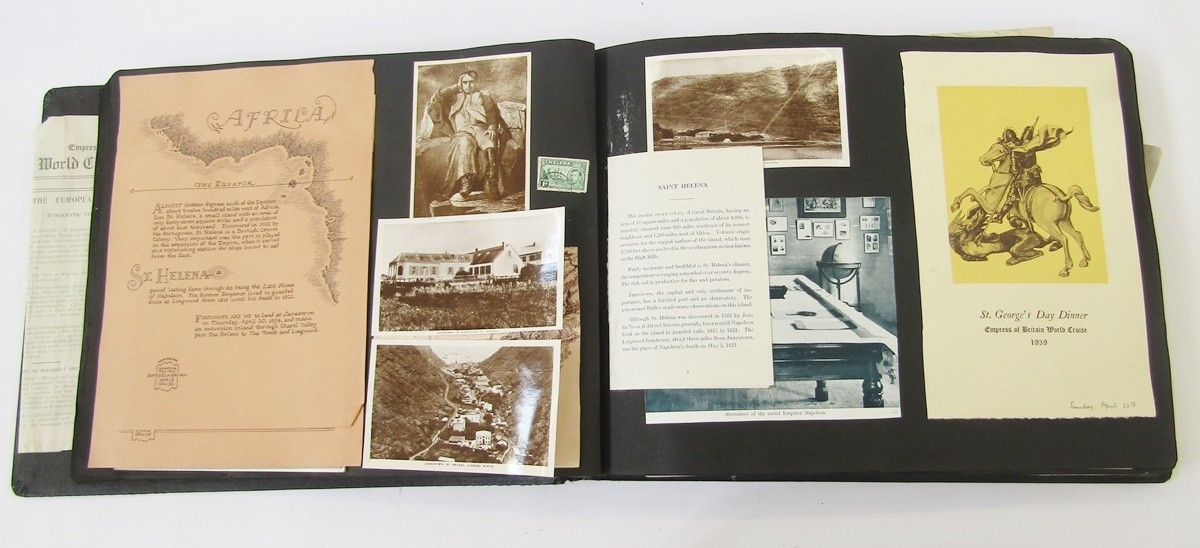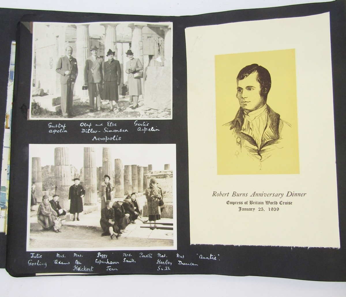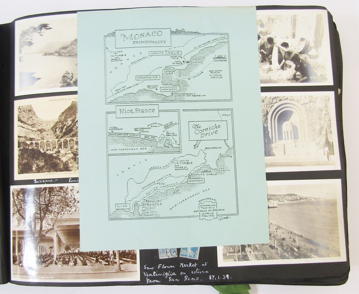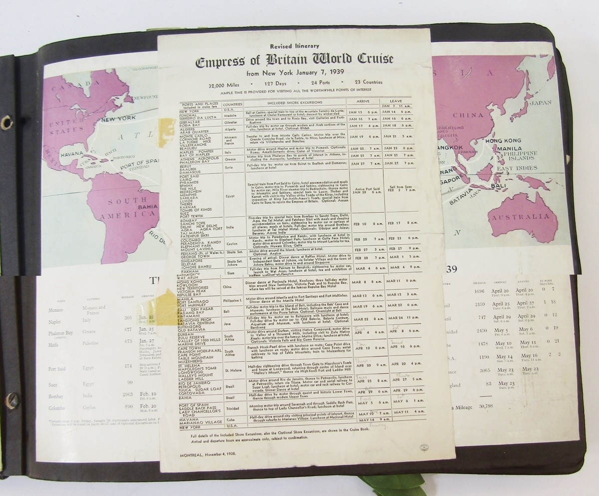 Photographic and written archive relating to Kathleen Grey circa 1939, in two albums and a folder, depicting her journey on The Empress of Britain World Cruise, starting in Monaco via Europe, Africa, Asia, South and North America, including Monaco, Hong Kong, Batavia, Durban, Rio de Janeiro and New York, containing photographs and other related ephemera from her journey and a separate folder containing letters to her parents from 1939