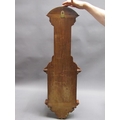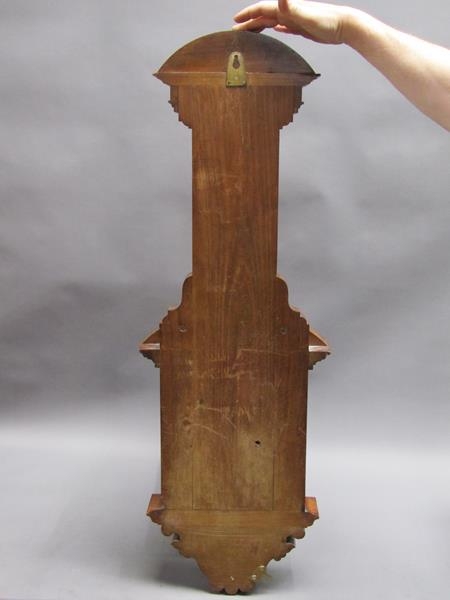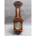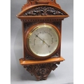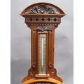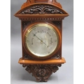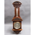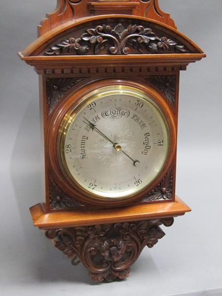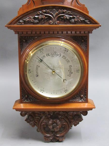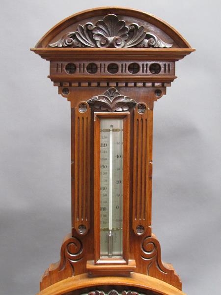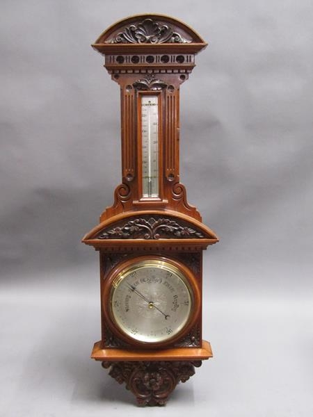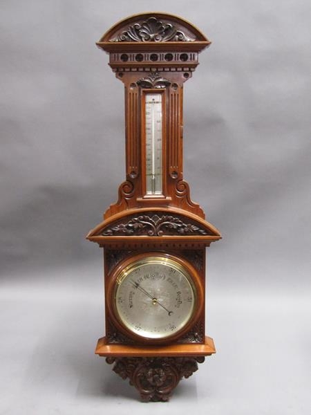 An early 20c aneroid wall barometer, with 20cm diam. silvered dial set into a large heavily carved walnut case with carved base, arched and carved pediment over the dial and with a fluted super structure above, containing a Fahrenheit thermometer. The case is surmounted by another arched and carved pediment and stand 102cm tall overall.