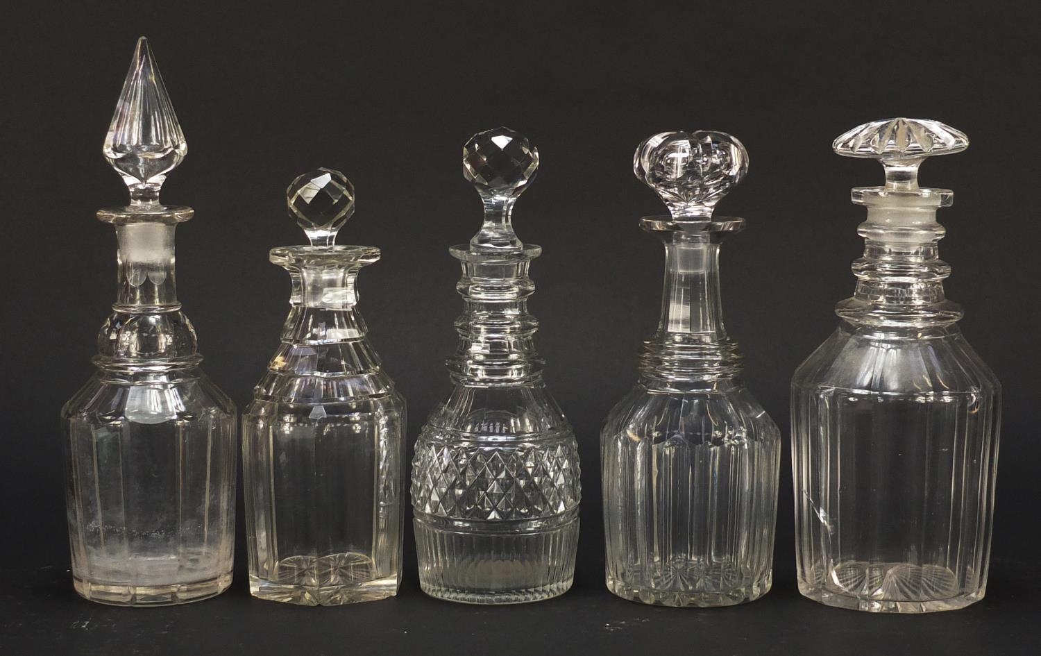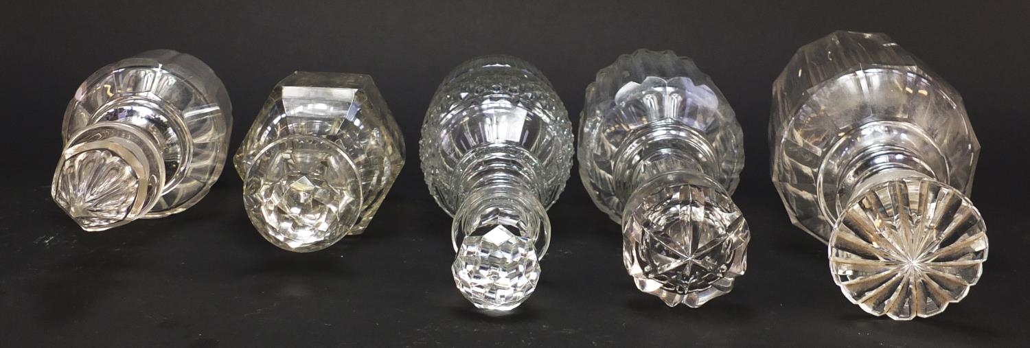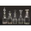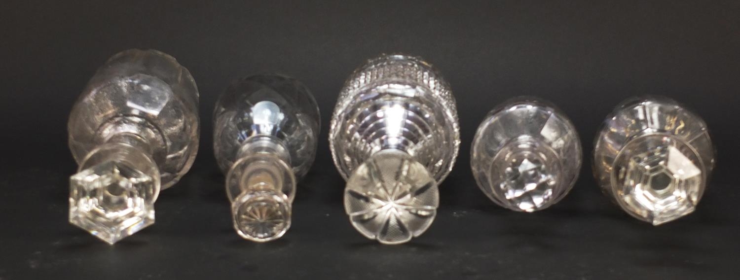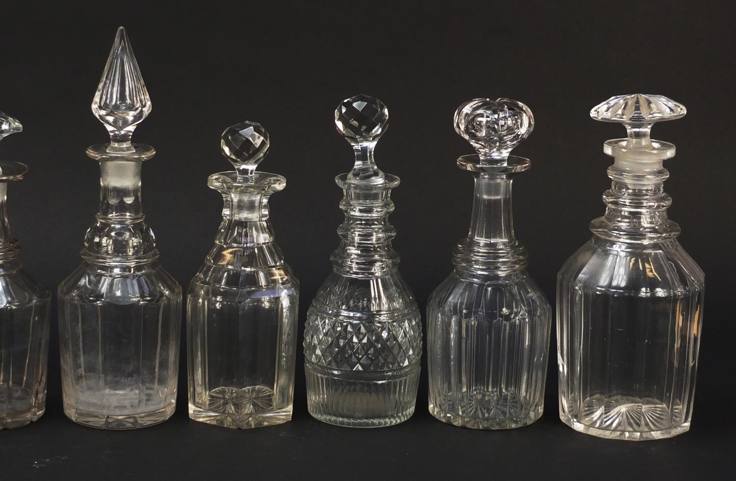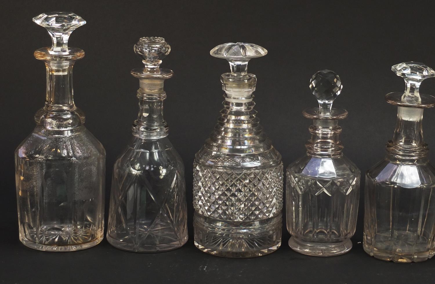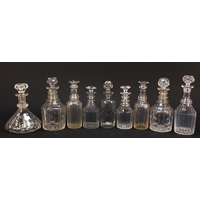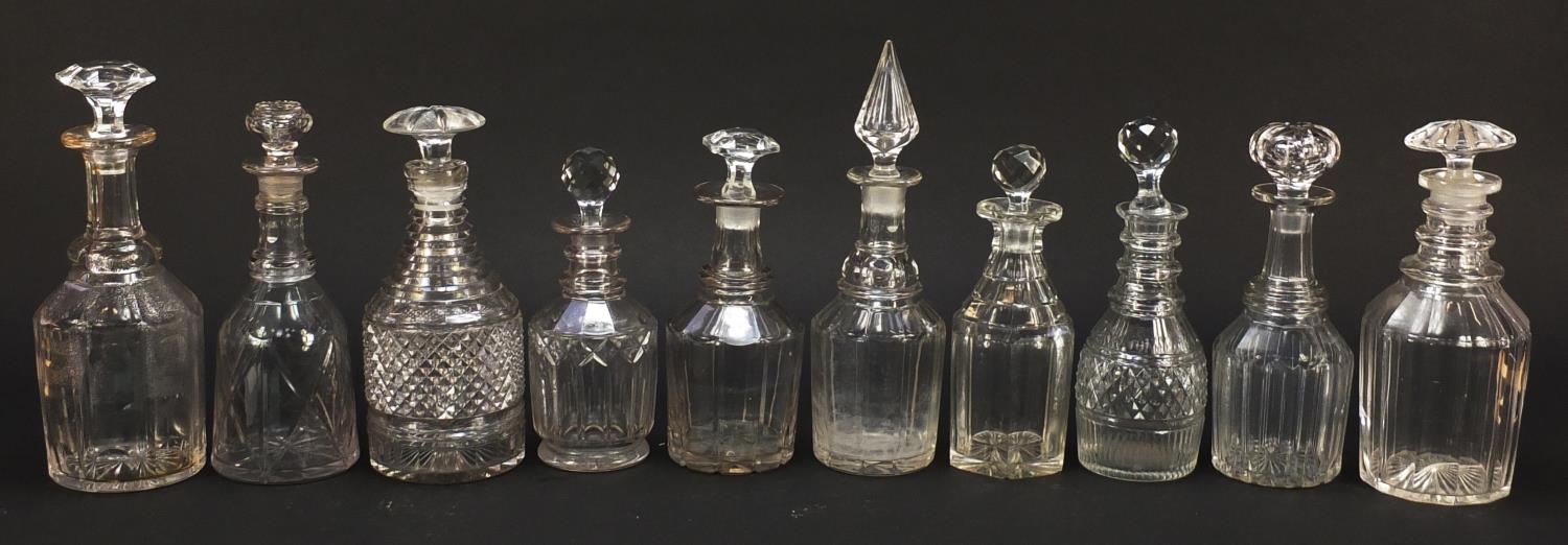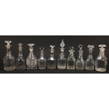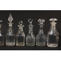 Ten Georgian cut glass decanters including two with mushroom stoppers, the largest 28cm high