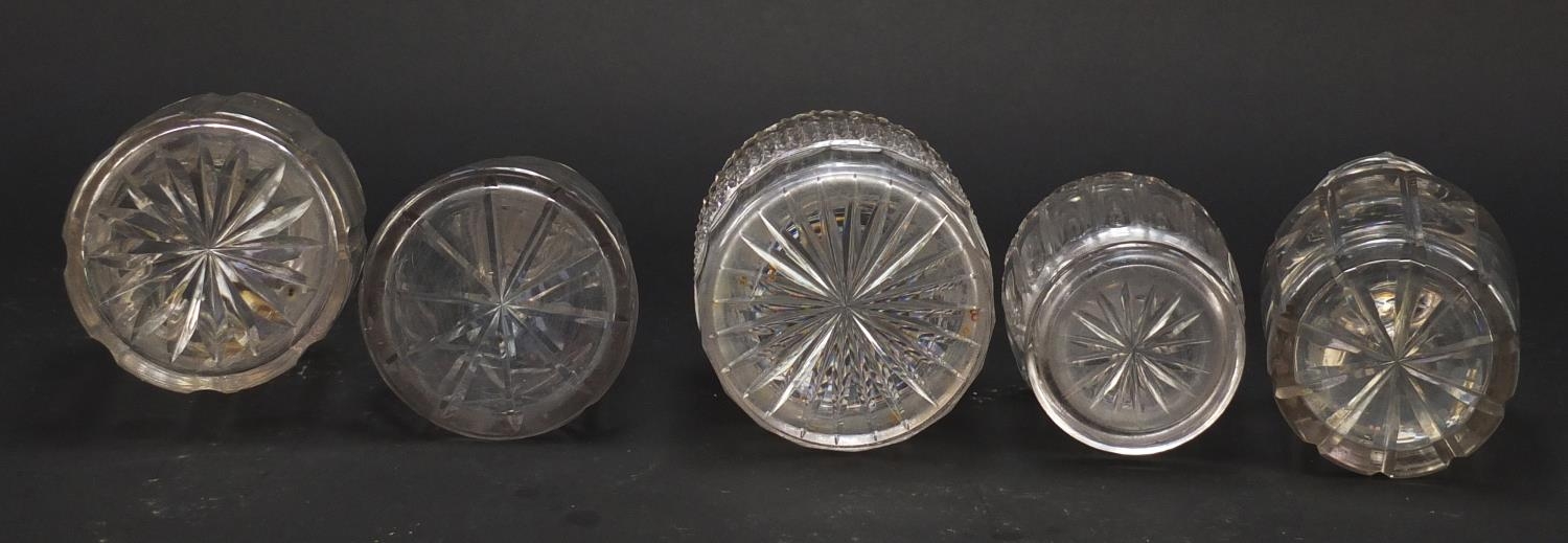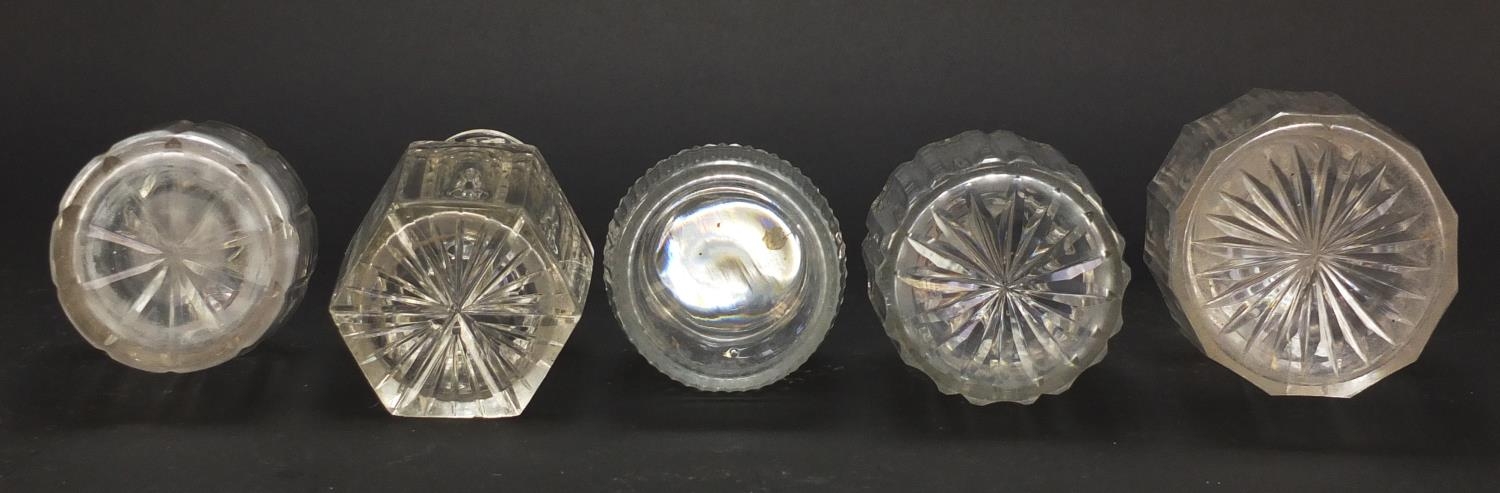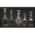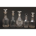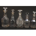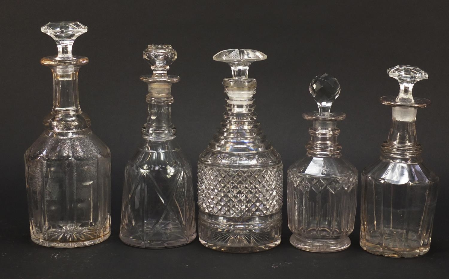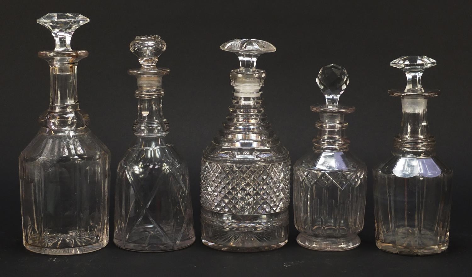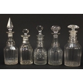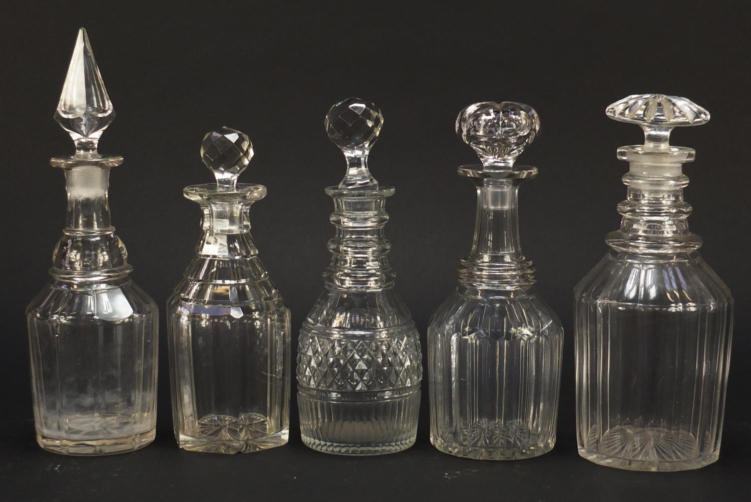 Ten Georgian cut glass decanters including two with mushroom stoppers, the largest 28cm high