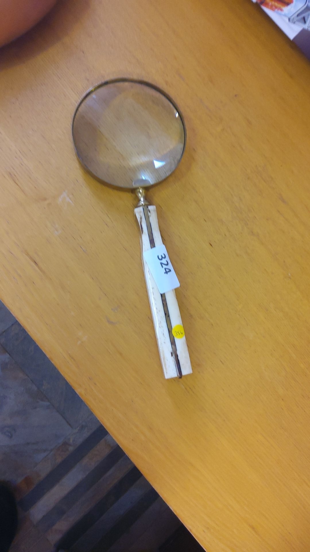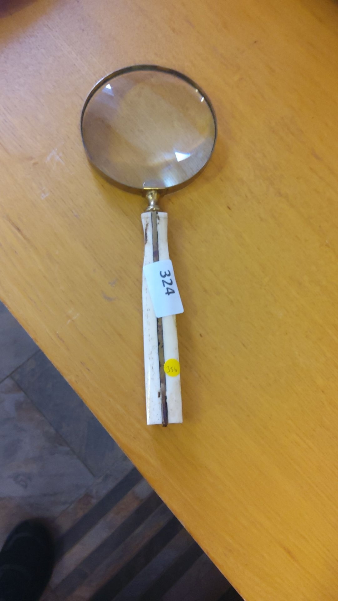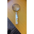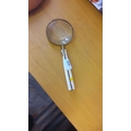 Vintage Handheld magnifying glass with large glass lens and a polished handle.