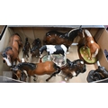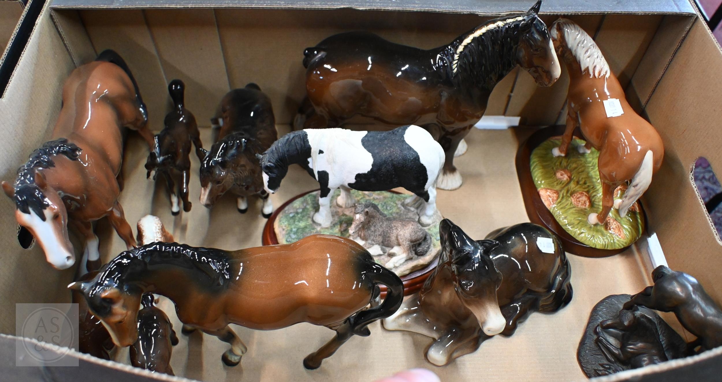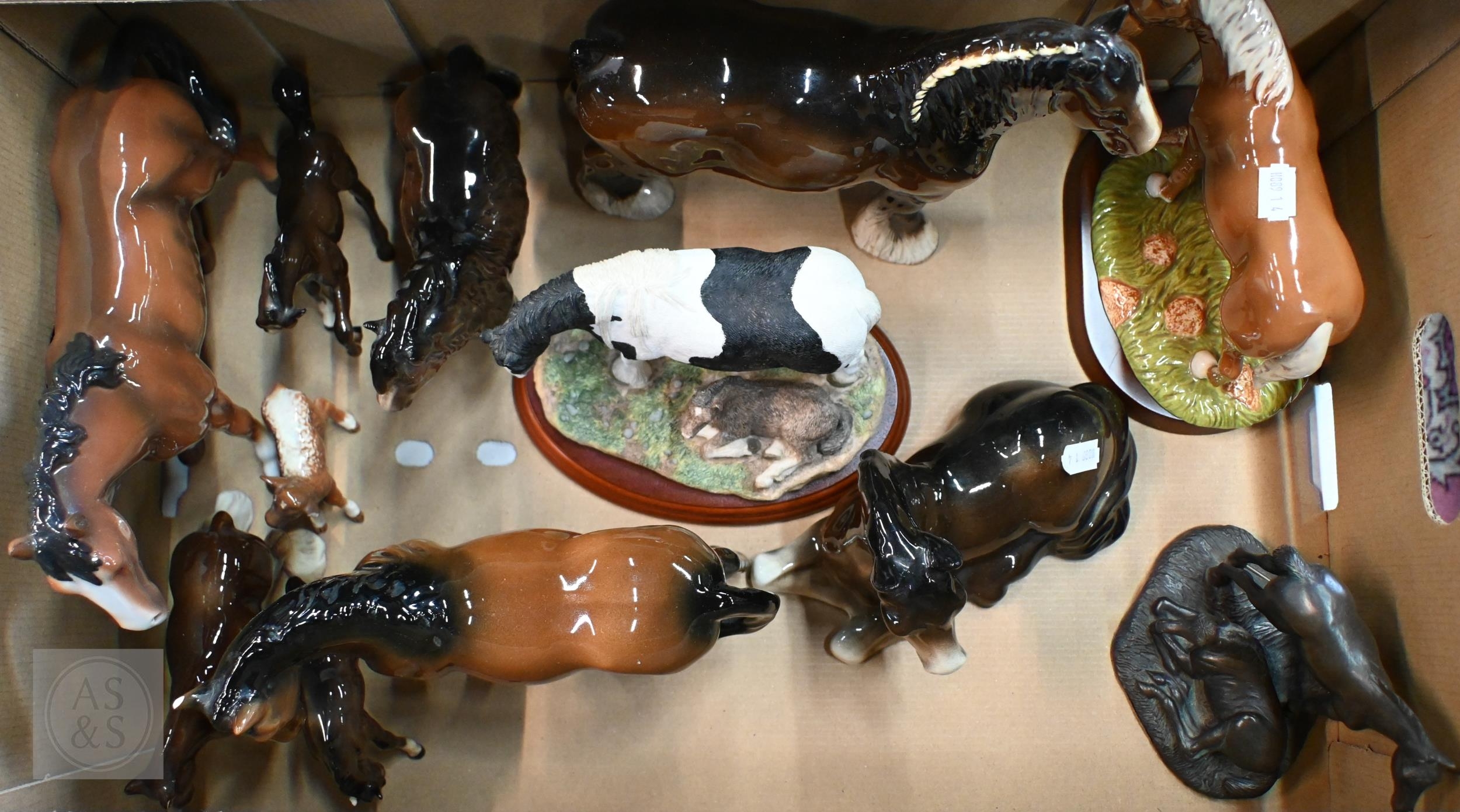Two Royal Doulton ponies and a Beswick shire horse, to/w other ceramic and resin horses etc (box)
