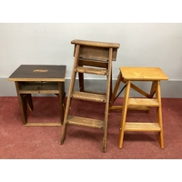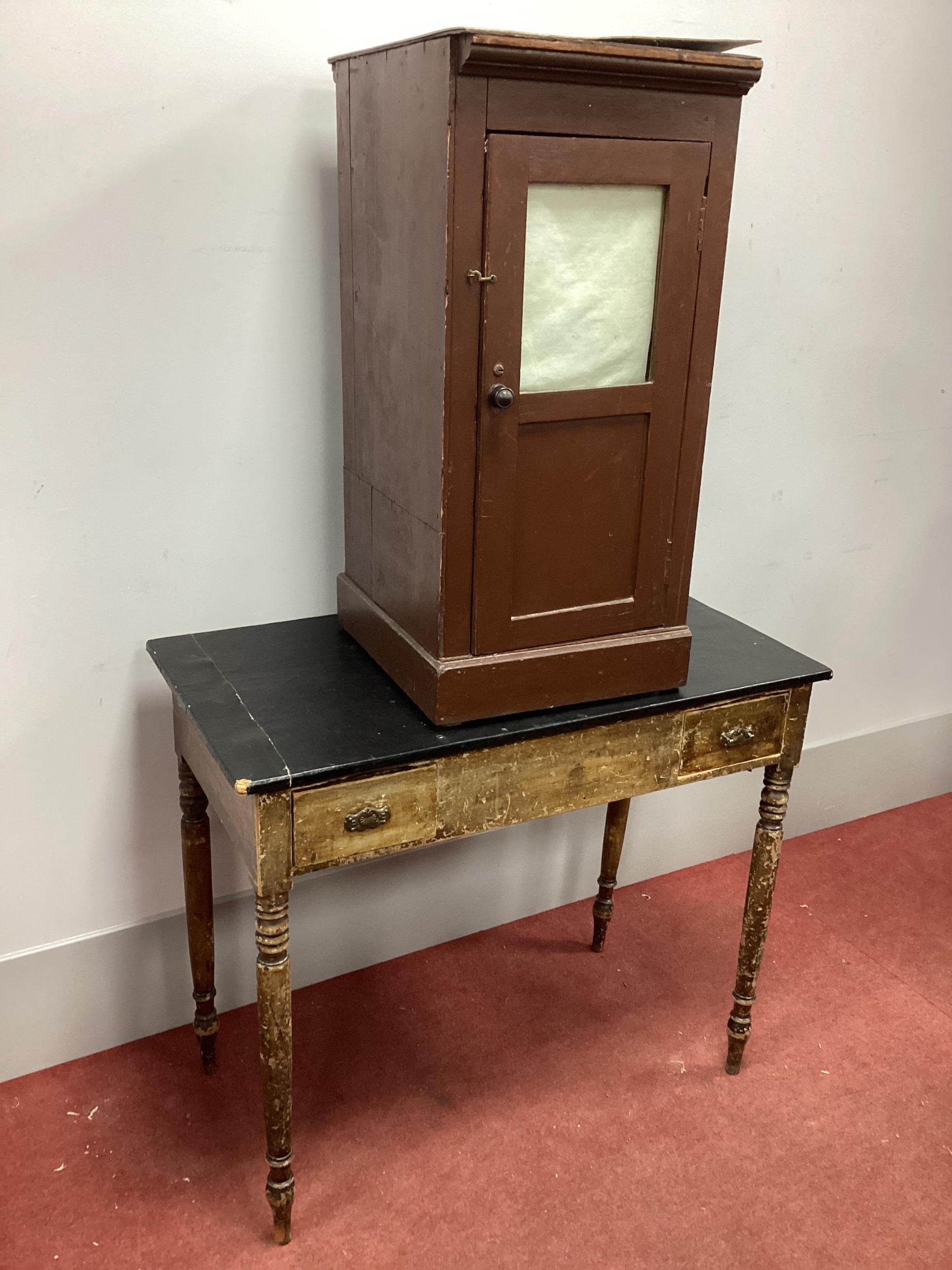 A Pine Cupboard, with a glazed and panelled door; together with a pine side table. (2)