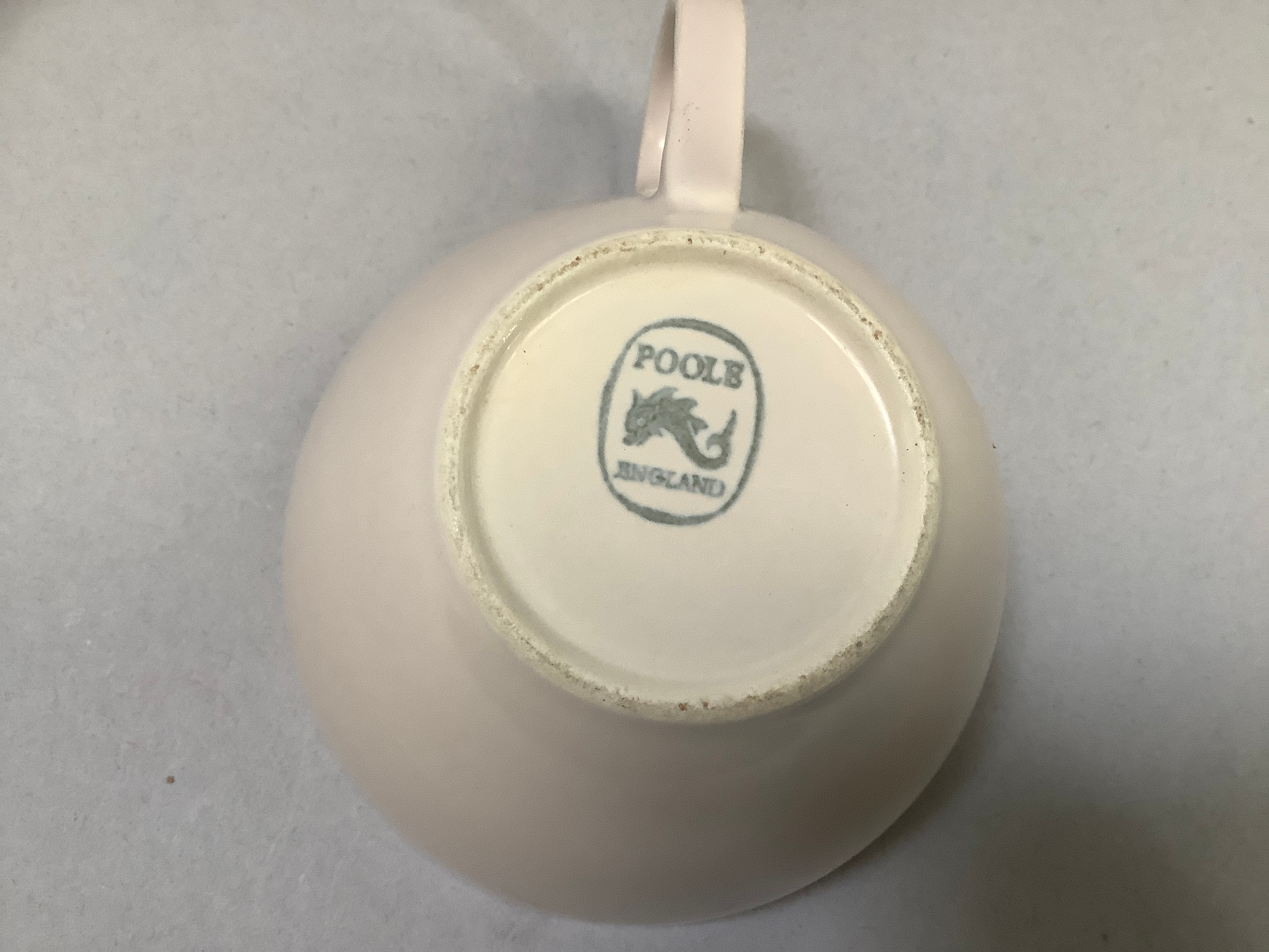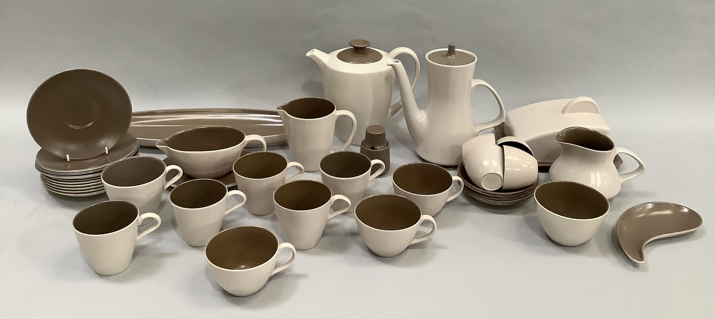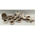 A Poole pottery two-tone coffee ware including coffee pot, four coffee cups and five saucers, milk jug and sugar bowl together with similar two tone tea ware including tea pot, milk jug, three tea cups and saucers, five coffee cups and saucers, one slightly larger cup with saucer, leaf shaped dish, sauce boat and stand, mustard pot and a small shaped dish