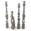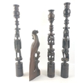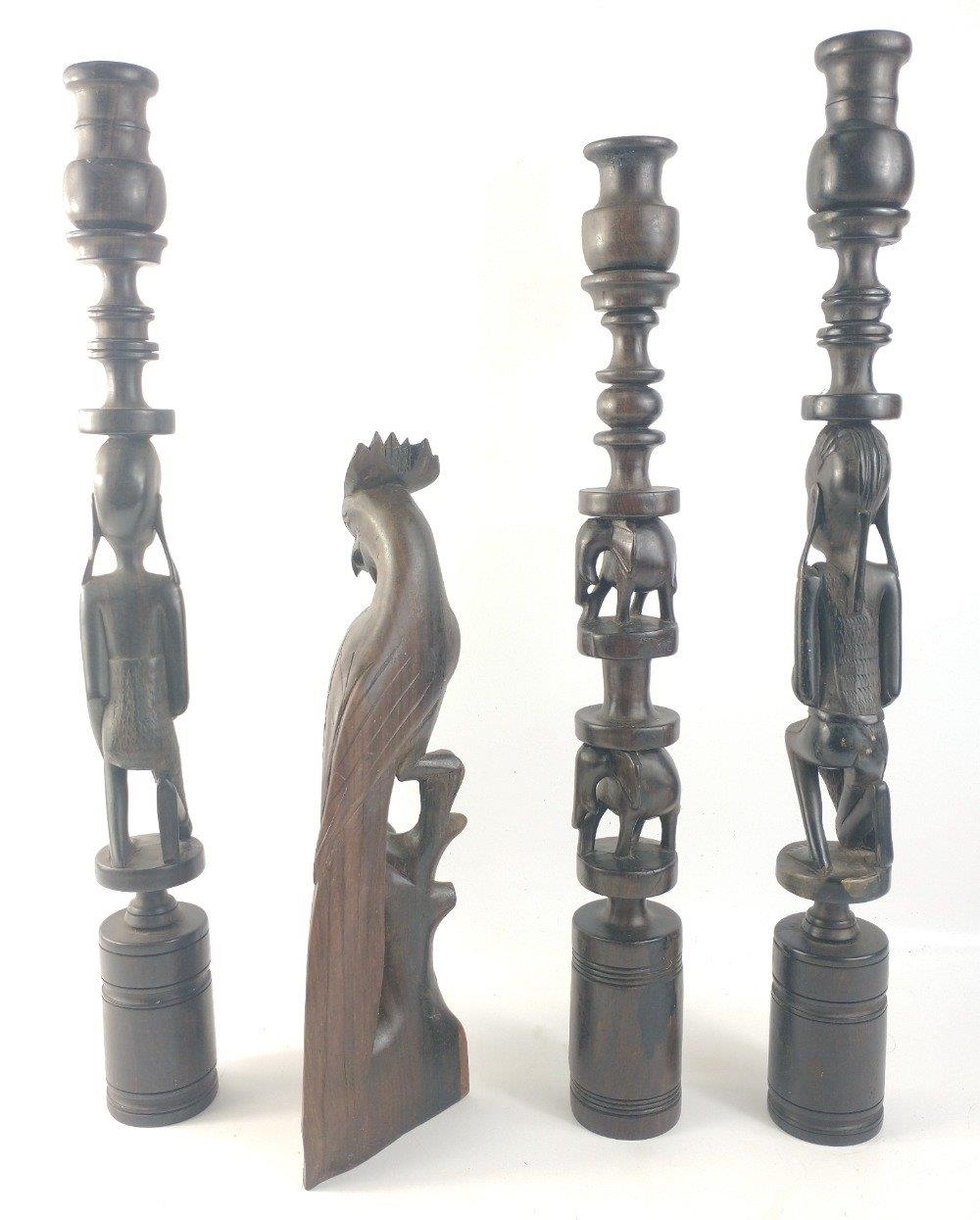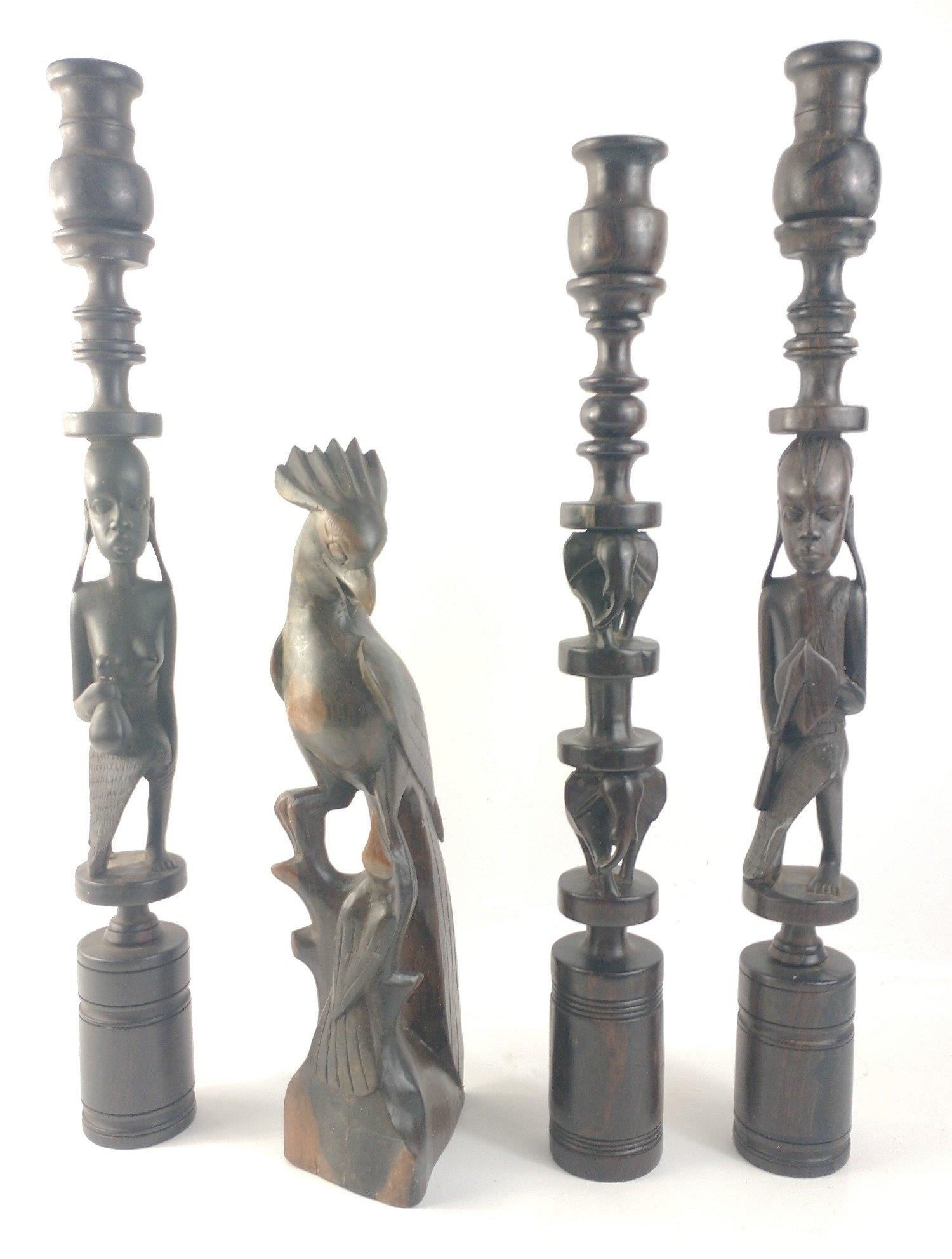 Tribal ware consisting of 1x bird, and 3 tall candlesticks tallest approx 51cm tall