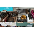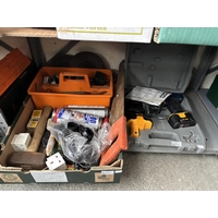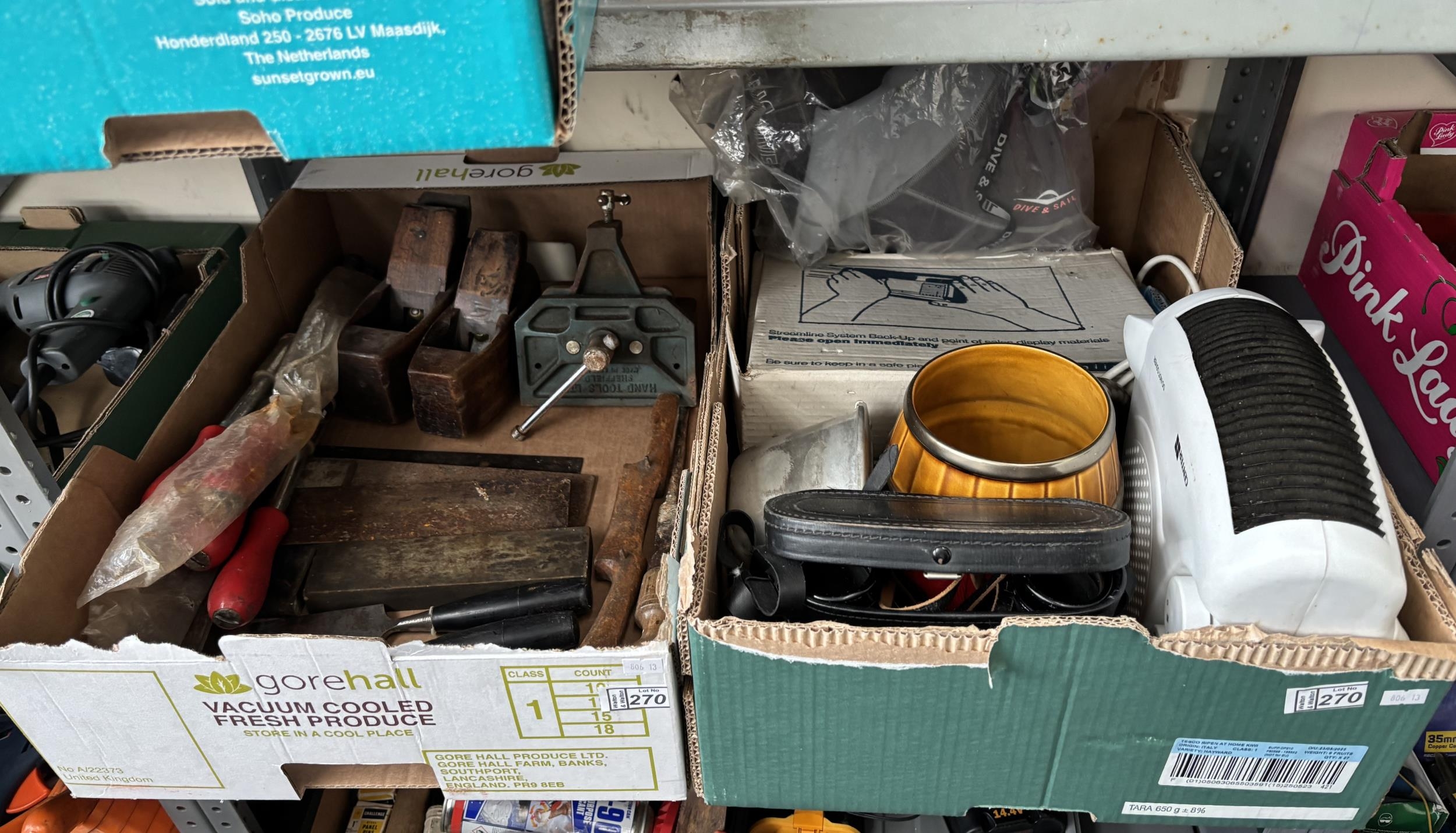 2 Boxes containing woodworking tools, a heater, binoculars etc