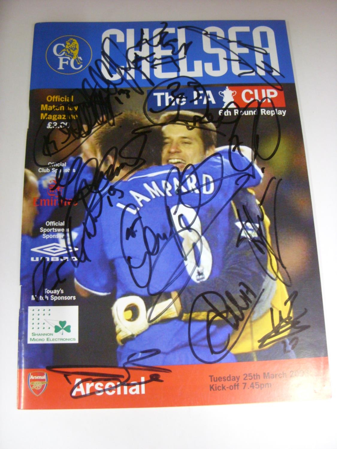 AUTOGRAPHED PROGRAMME, 2002/2003, Chelsea v Arsenal [FA Cup Replay], a programme for the fixture 25/03/2003, the programme is Hand Signed by approx 13 Arsenal Players to the front cover, the Signatures Include Sol Campbell, Edu, Robert Pires, Gilberton Silva, Stuart Taylor, Pascal Cygan, Patrick Vieira etc. Estimate: £14/£16 - Opening Bid: £12