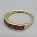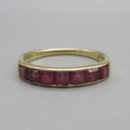 18ct yellow gold seven stone ruby ring, stamped 18ct, size O, 2.46g