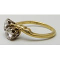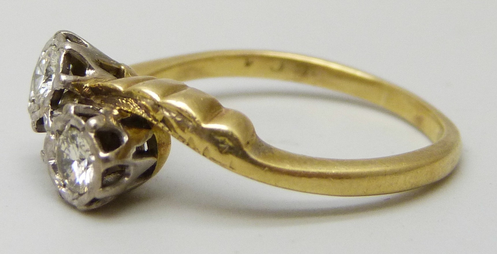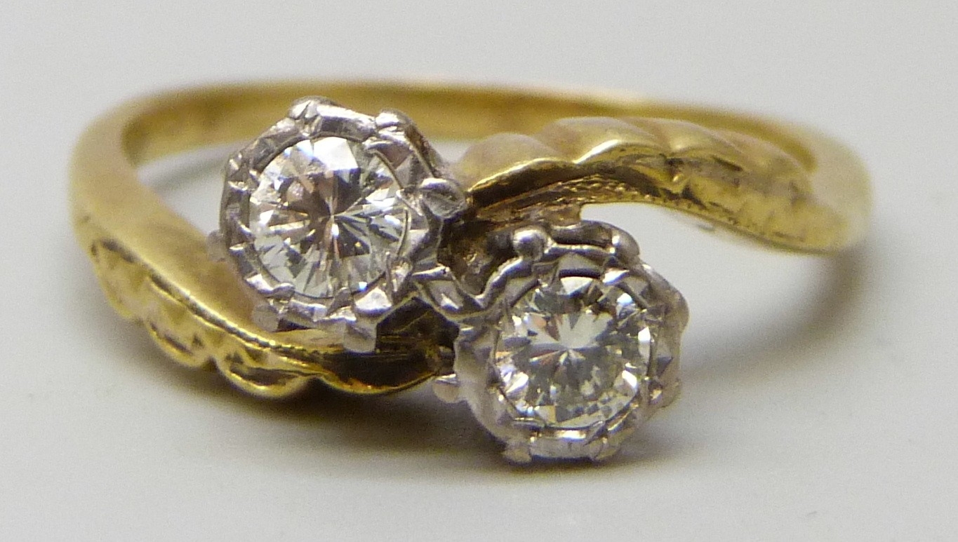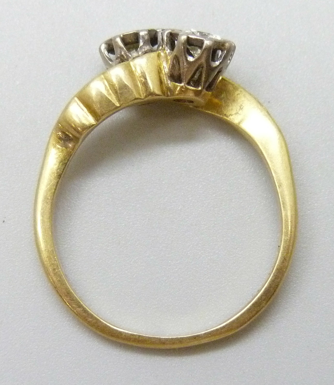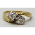 An 18ct gold and and platinum two stone diamond crossover ring, 4.2g, O
