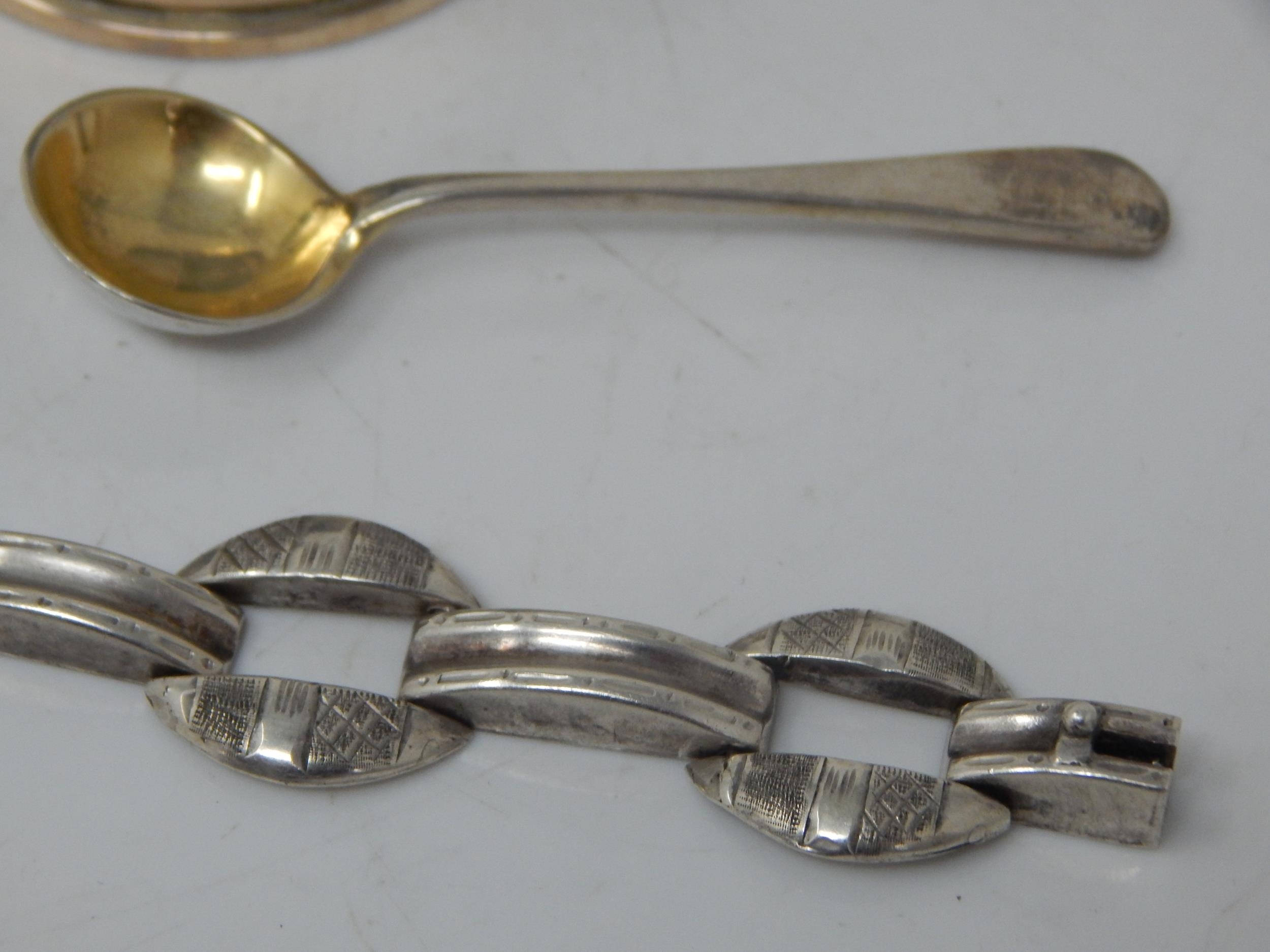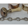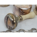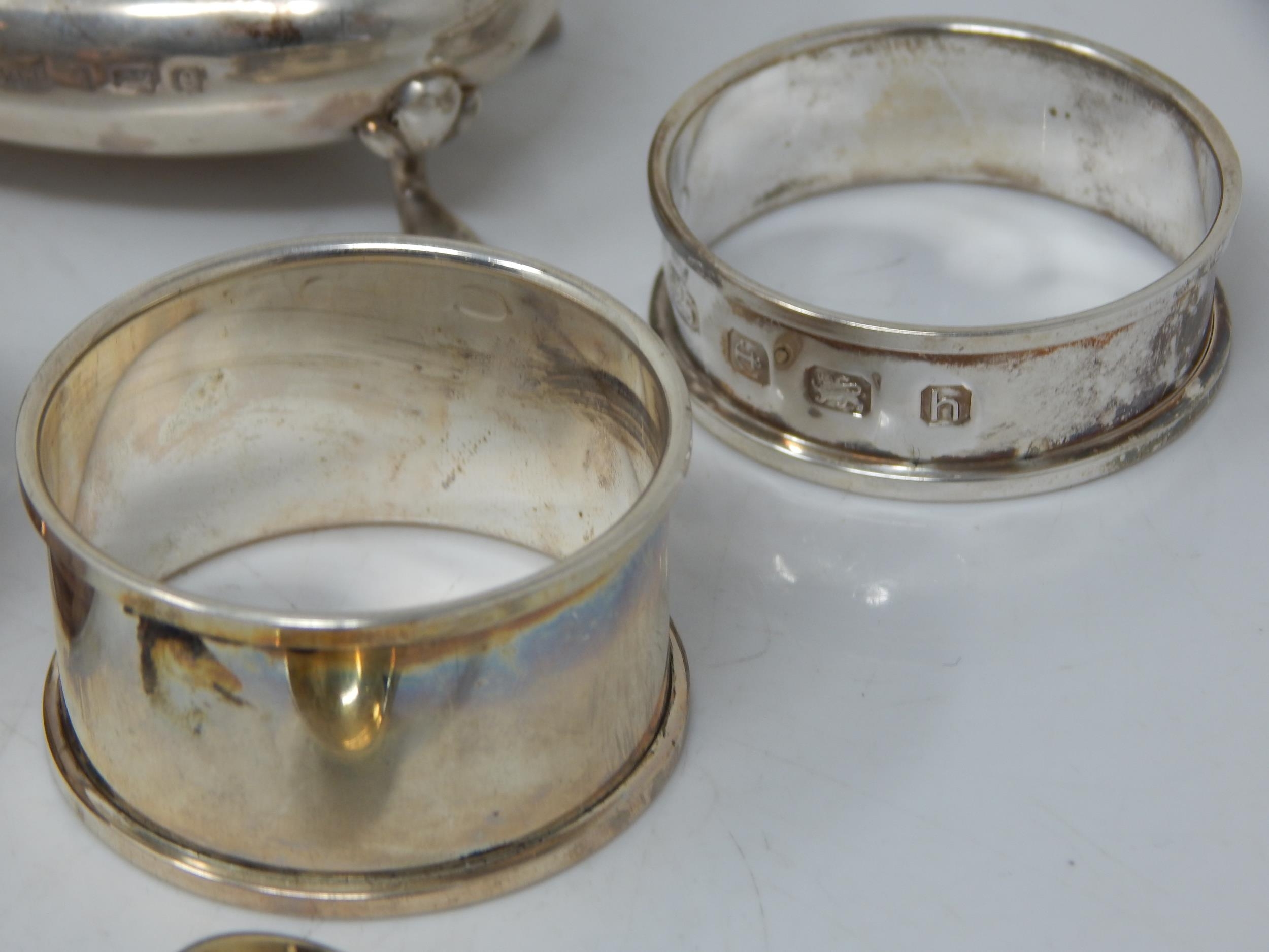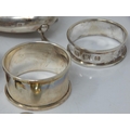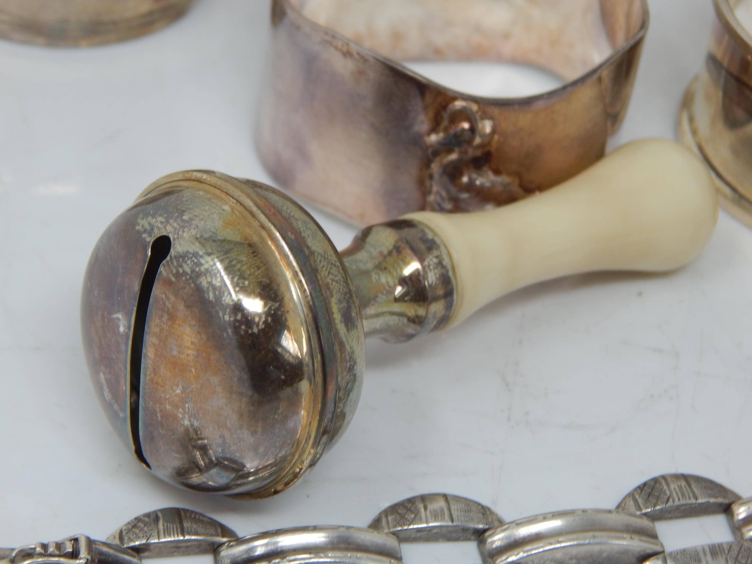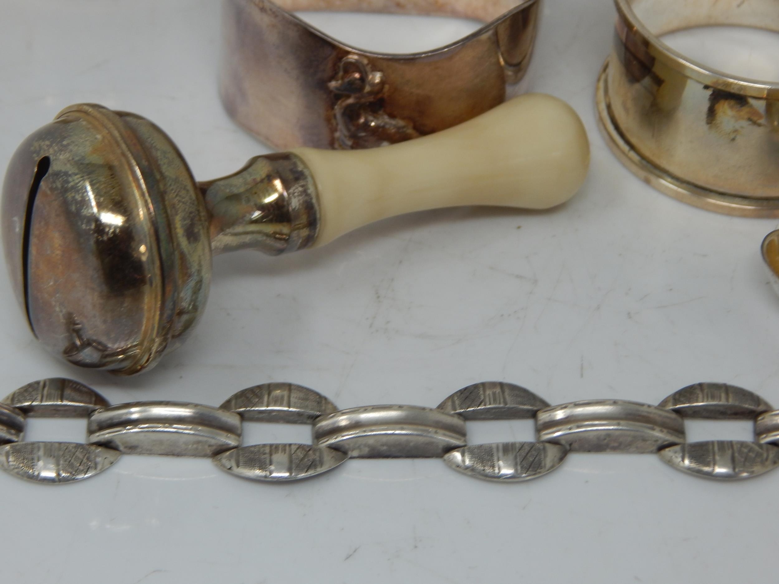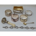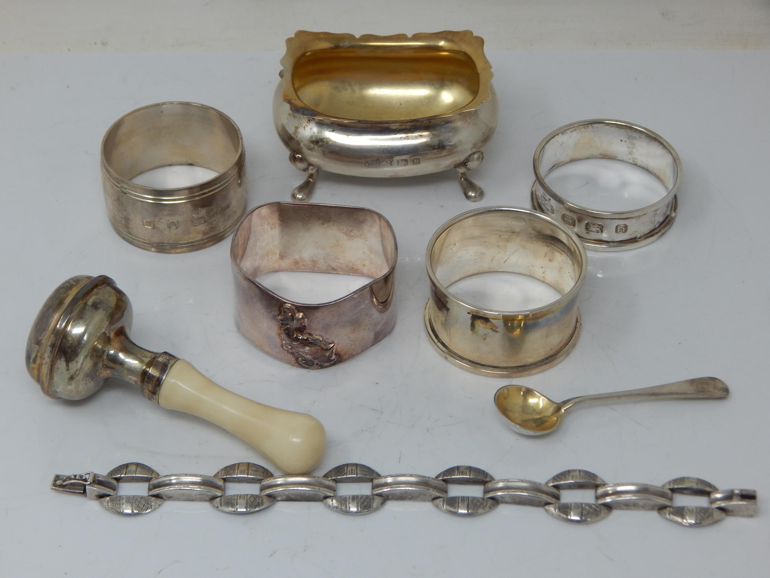 A children's silver rattle, group of hallmarked Silver napkin rings, etc total weight 189.43g.