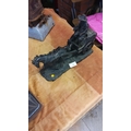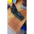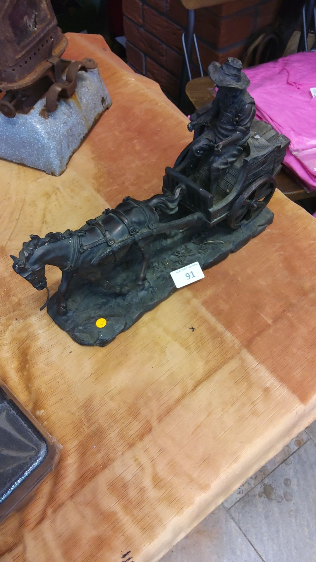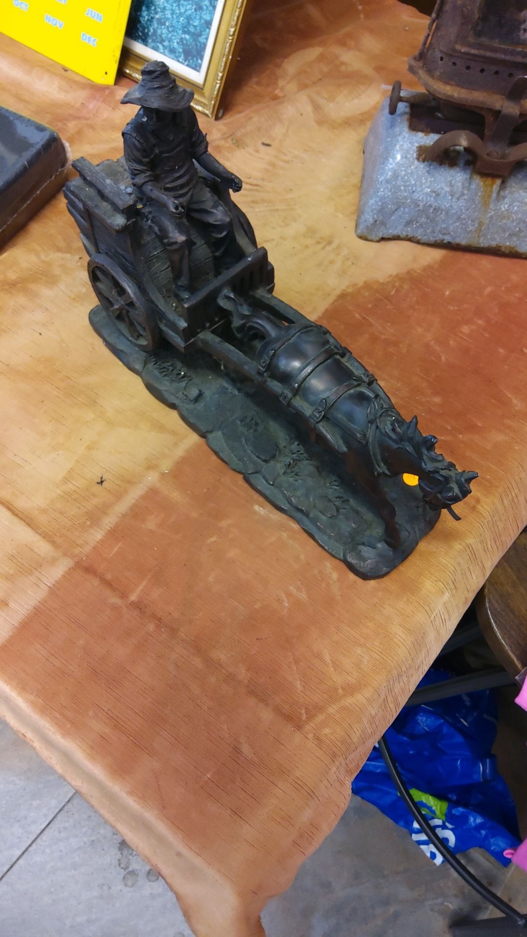 Patinated cast resin sculpture of a horse-drawn cart with seated farmer, naturalistic base, early 20th-century rustic style.