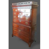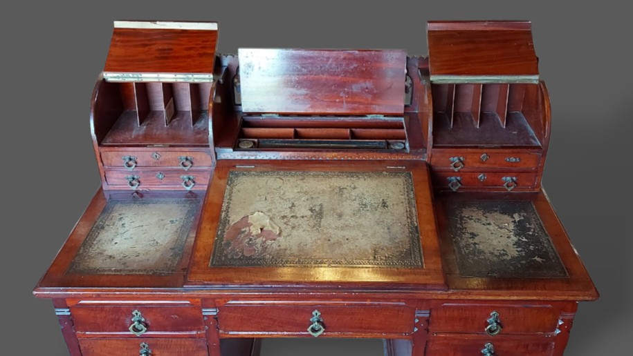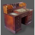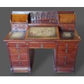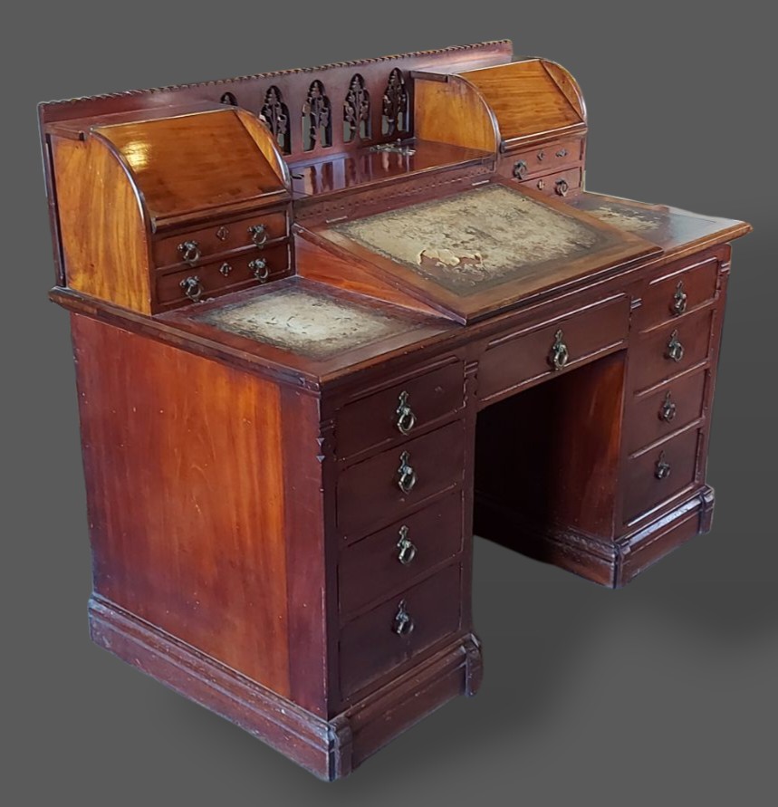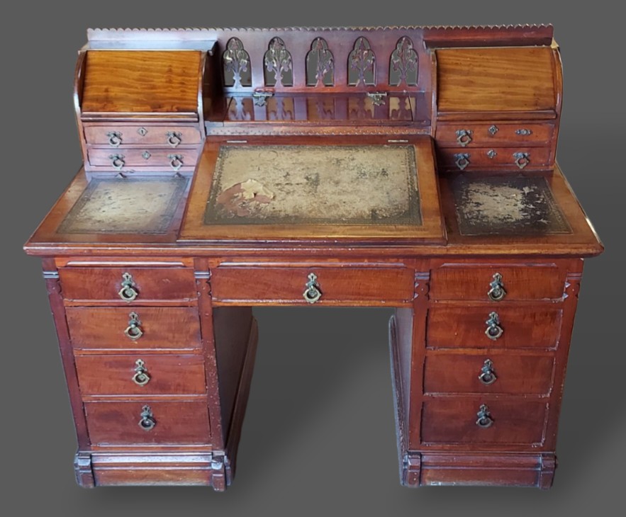 A 19th century mahogany twin pedestal desk, the superstructure with gothic tracery and four small drawers above a sloping writing surface and nine drawers with brass handles, 134cms wide, 71cms deep and 108cms tall