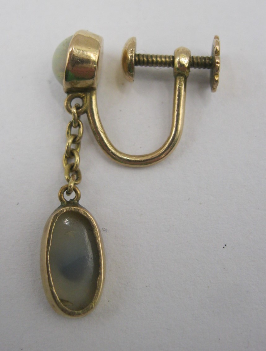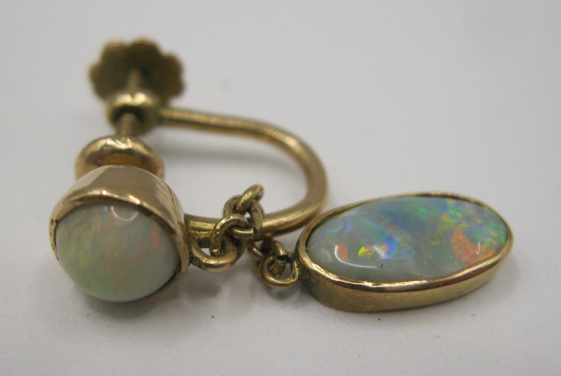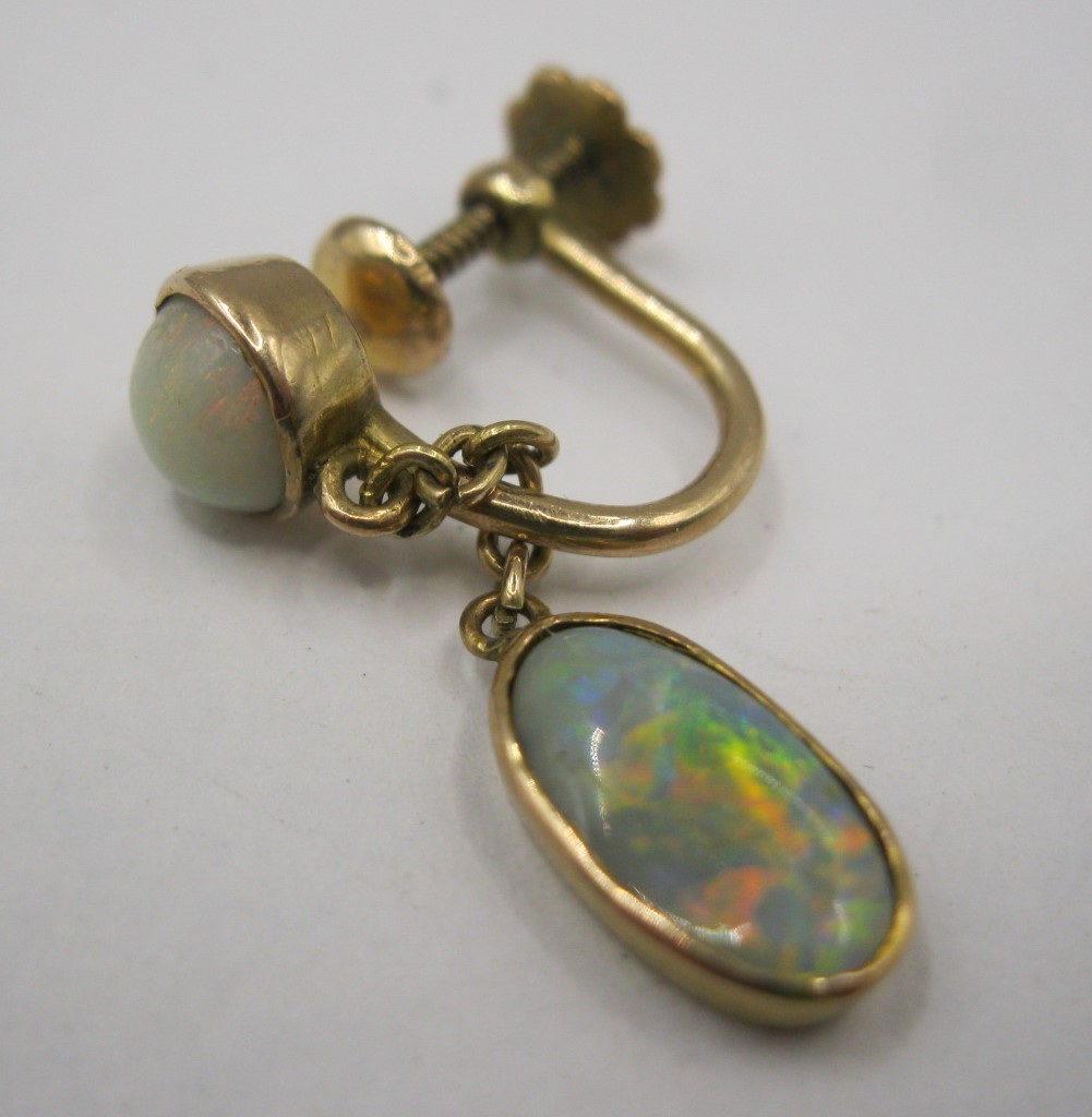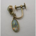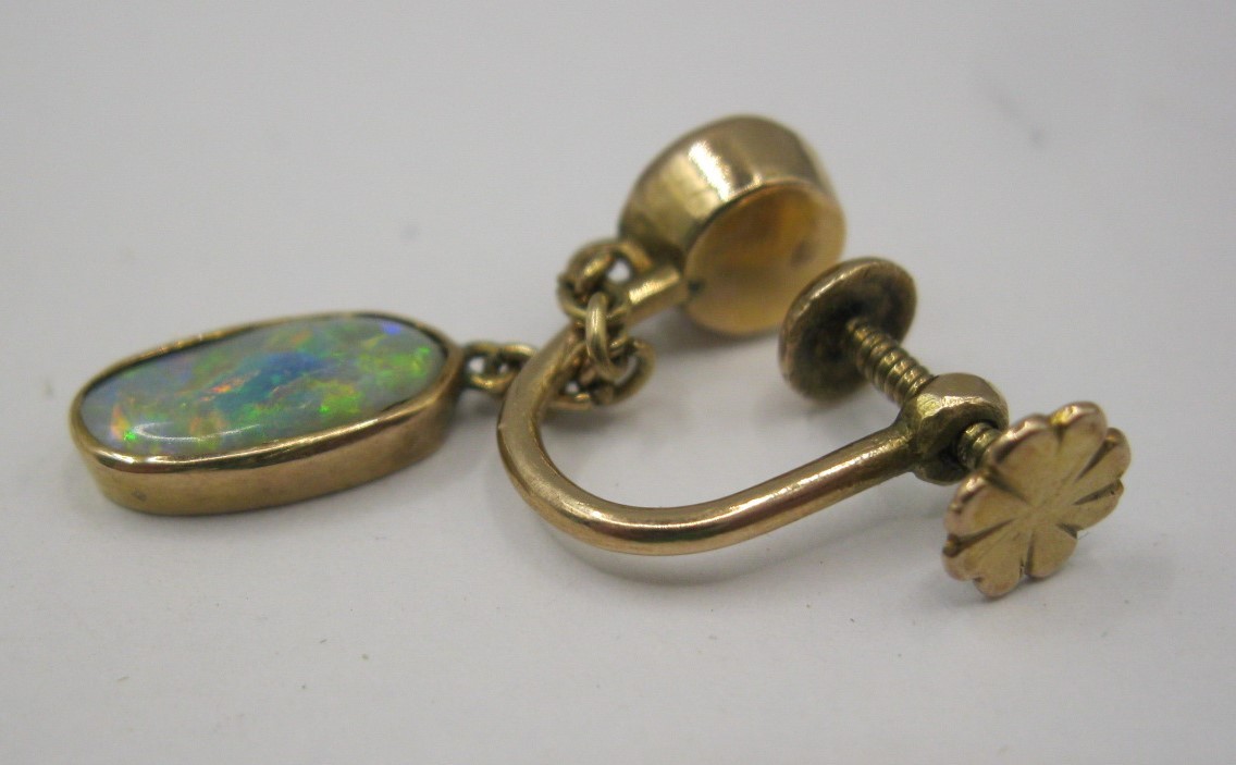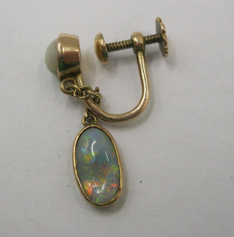 One gold and opal screw-fasten pendant earring, gross approx. 1.9g, acid test positive for 9 carat gold