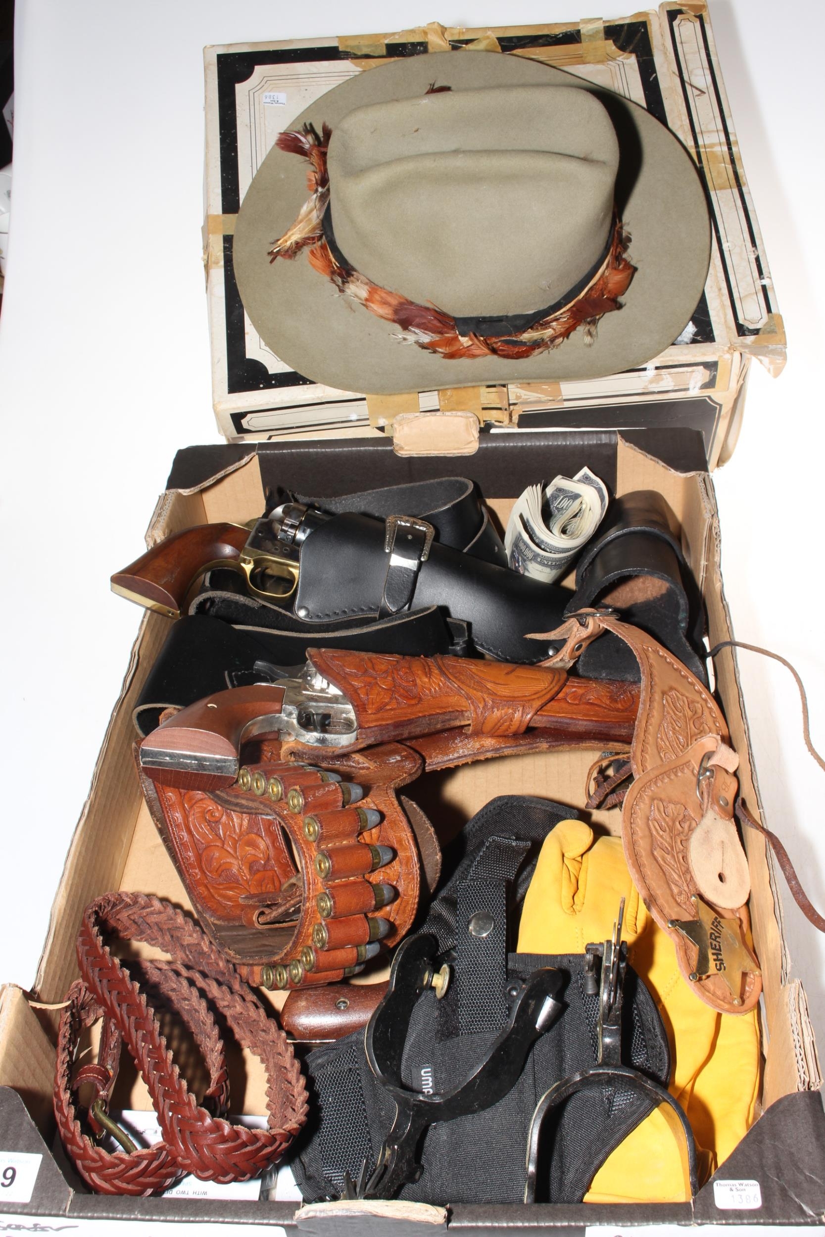 Cowboy accessories including boxed Stetson, gun belts and holsters, replica guns, etc.