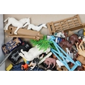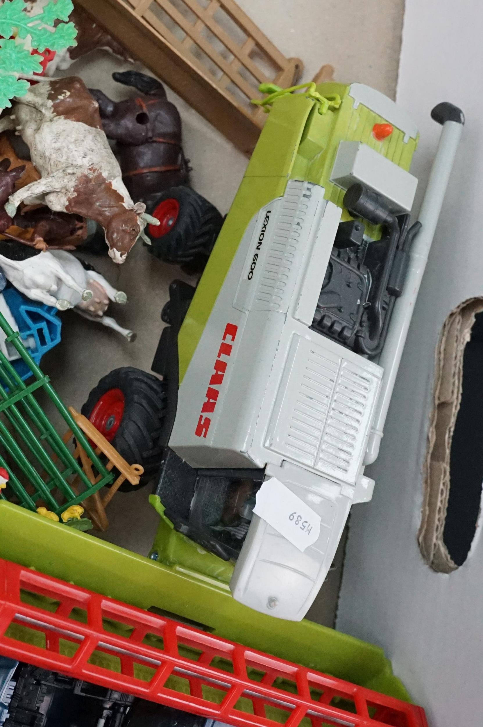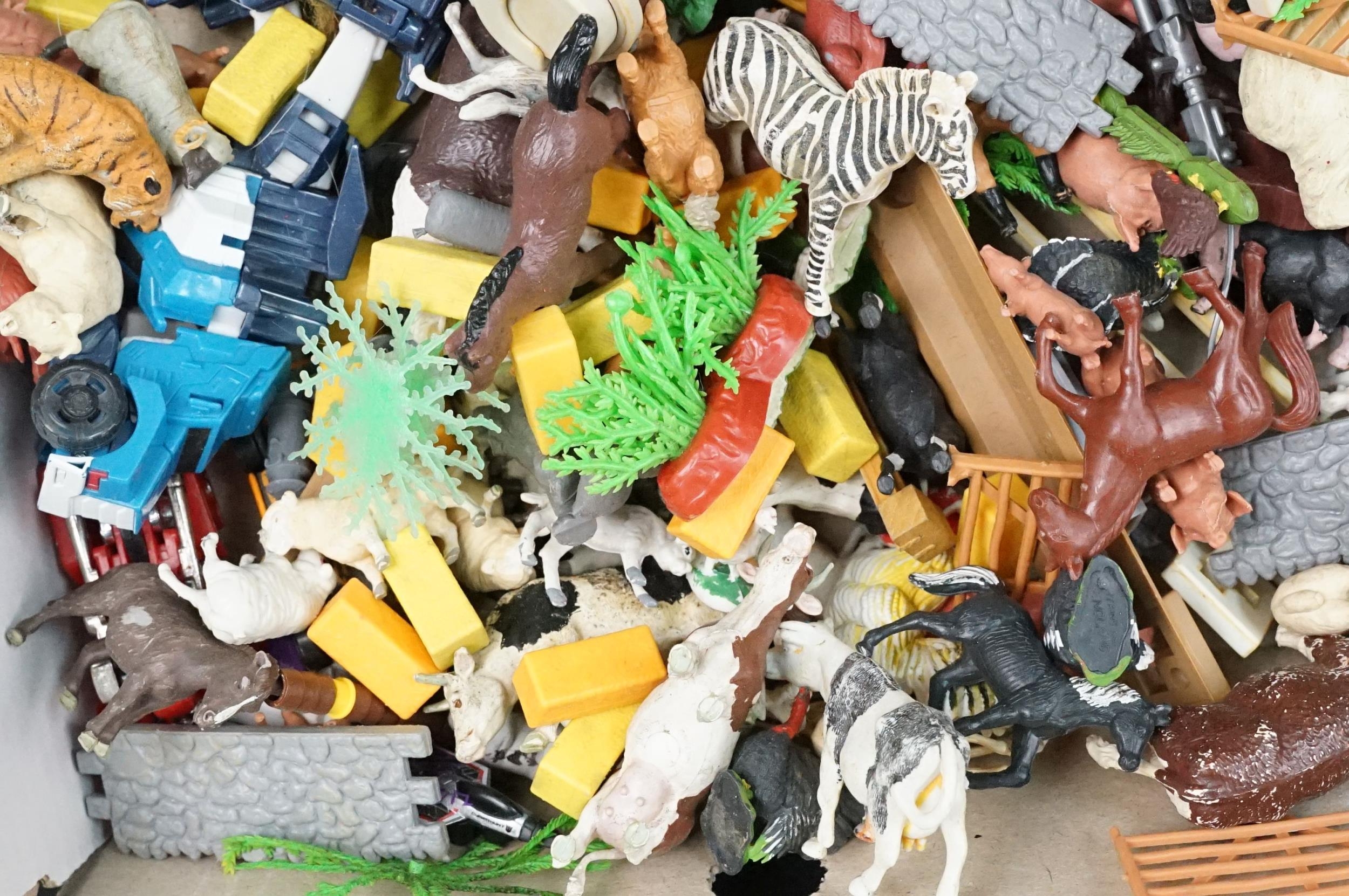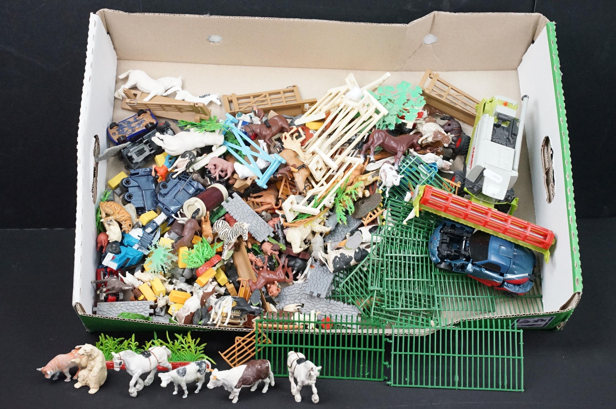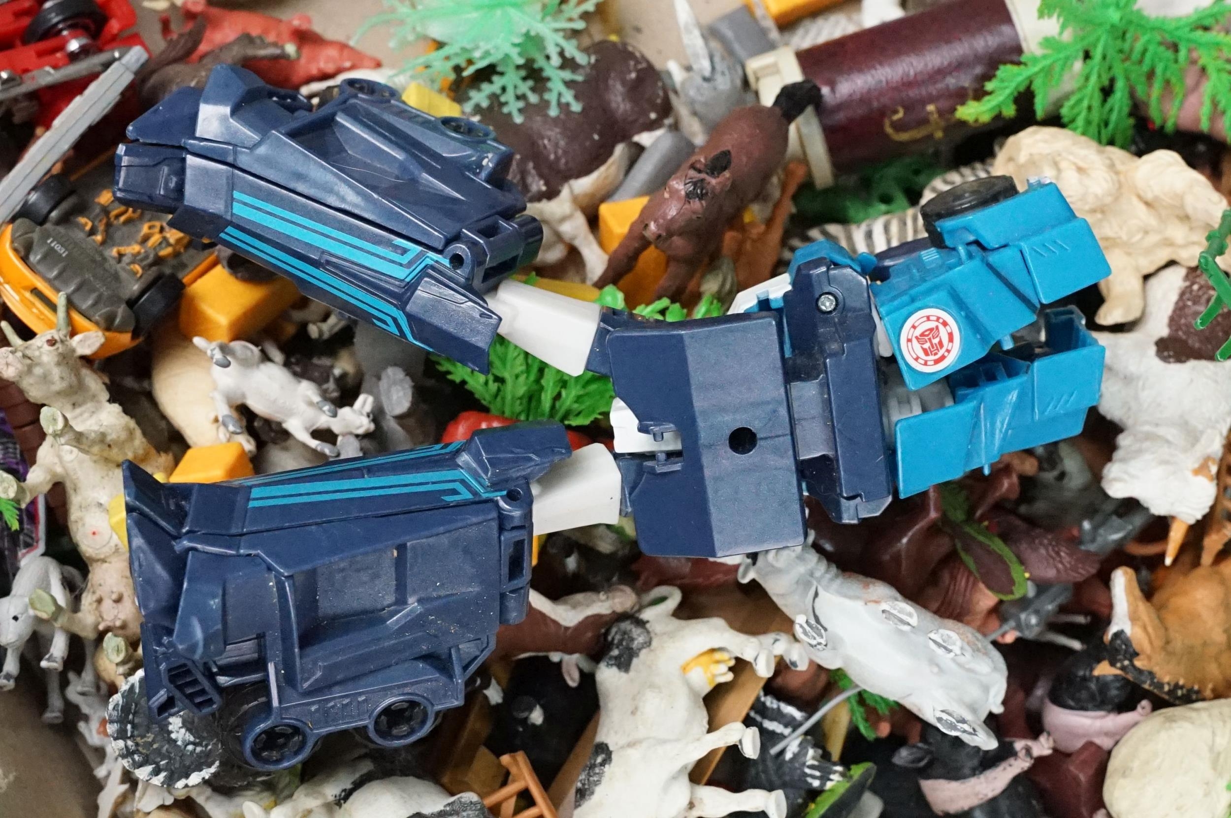 Quantity of mixed plastic animal figures and accessories to include examples from Britains featuring horses, turkeys, cows, farmers, gates, fencing, etc, plus Siku 1991 Claas Combine Harvester and 2 x Hasbro Transformers