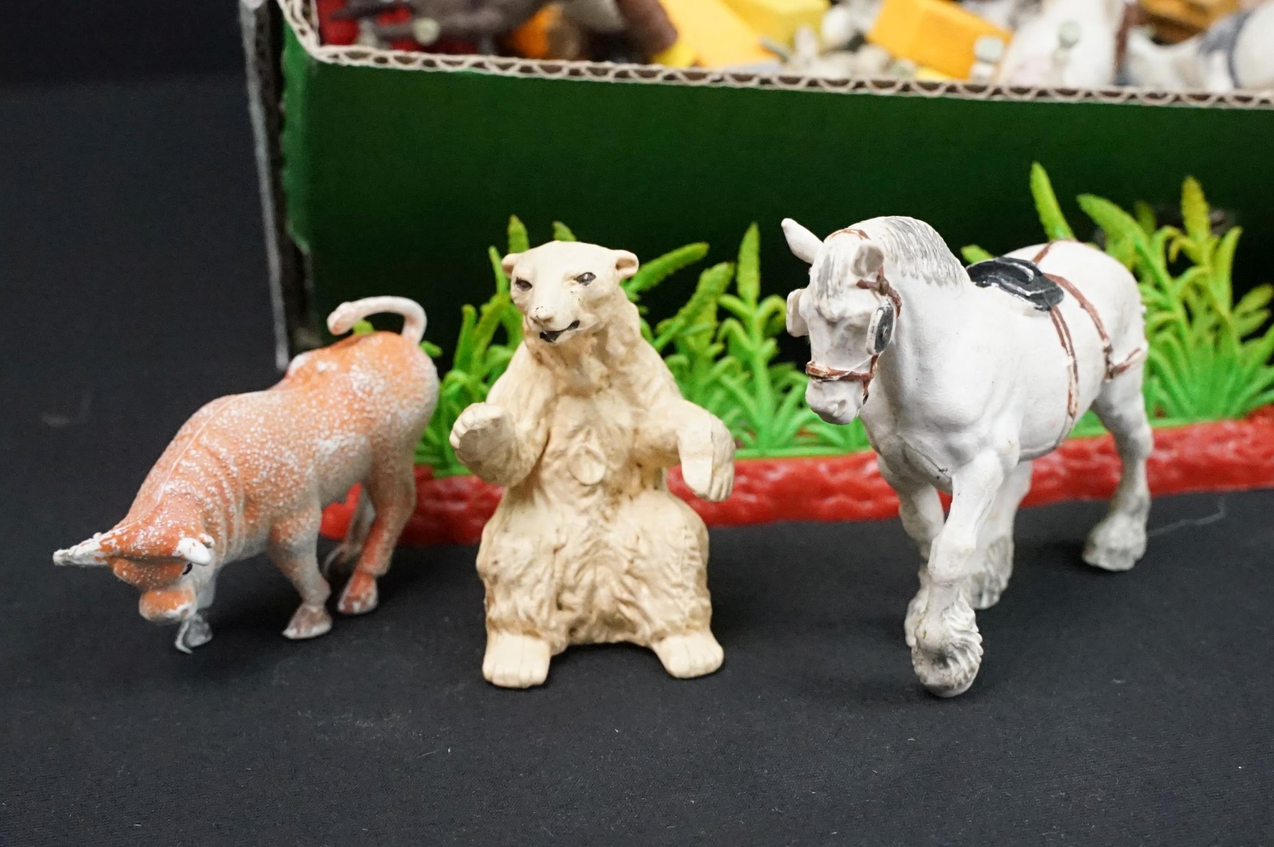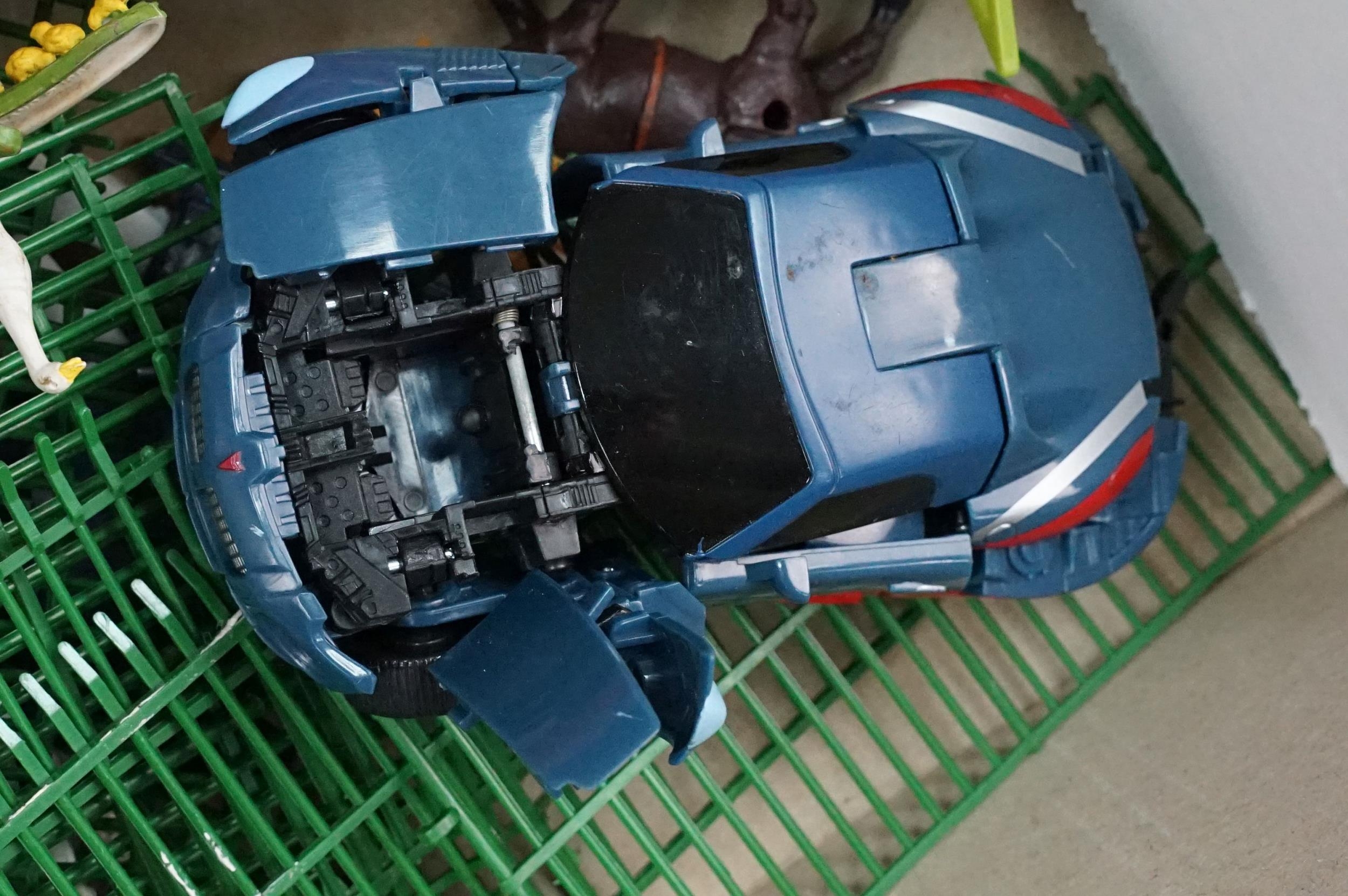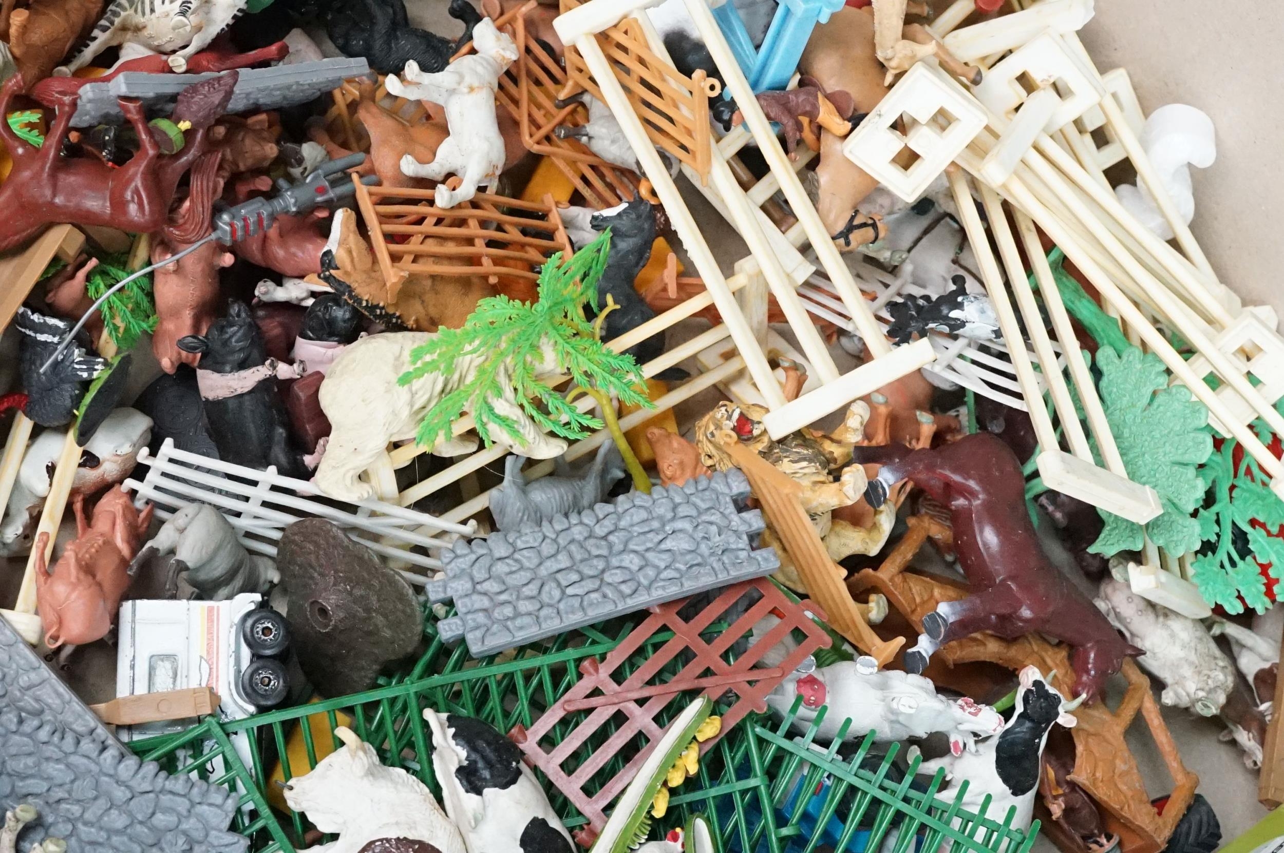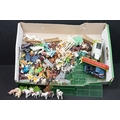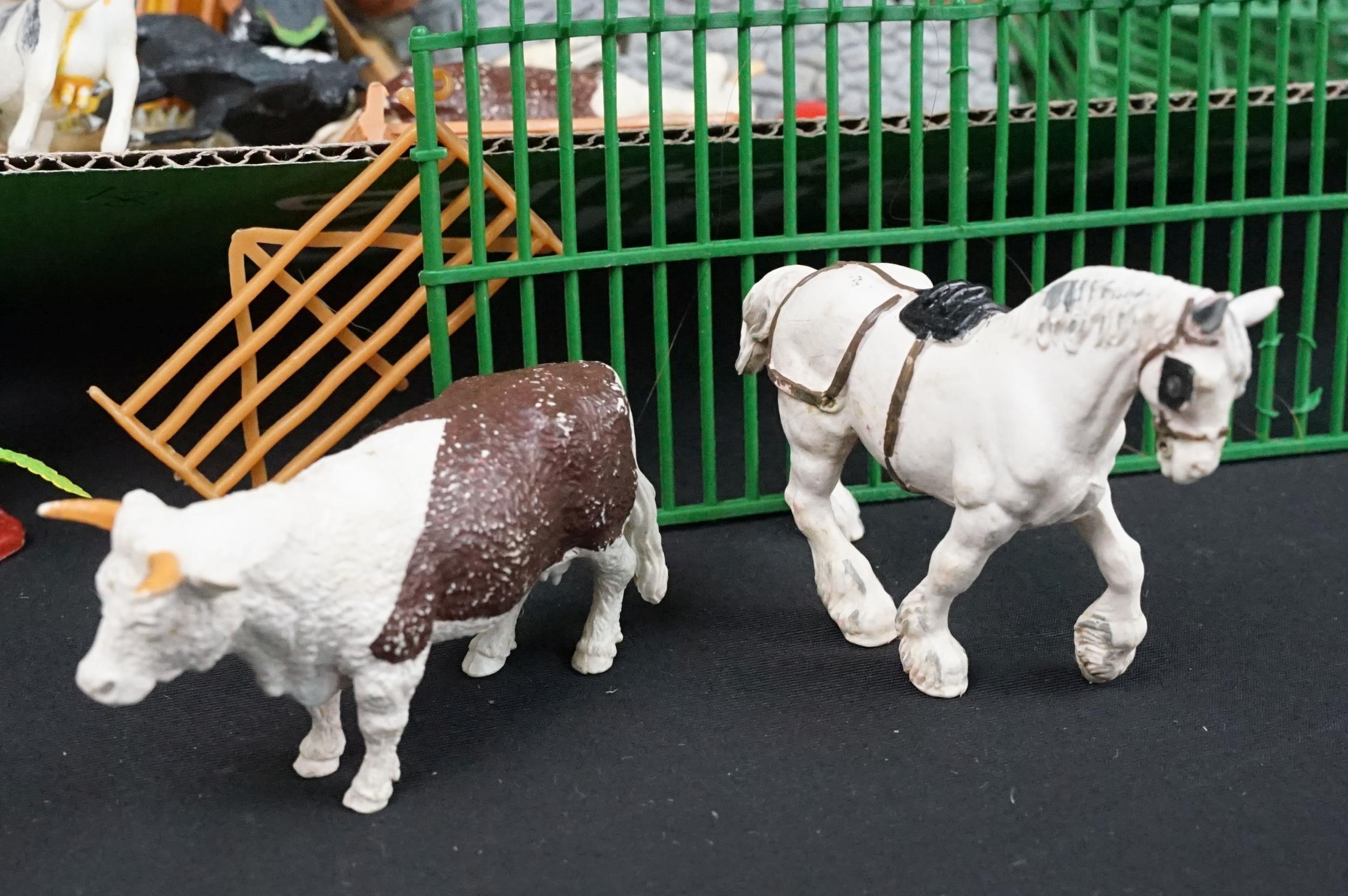 Quantity of mixed plastic animal figures and accessories to include examples from Britains featuring horses, turkeys, cows, farmers, gates, fencing, etc, plus Siku 1991 Claas Combine Harvester and 2 x Hasbro Transformers
