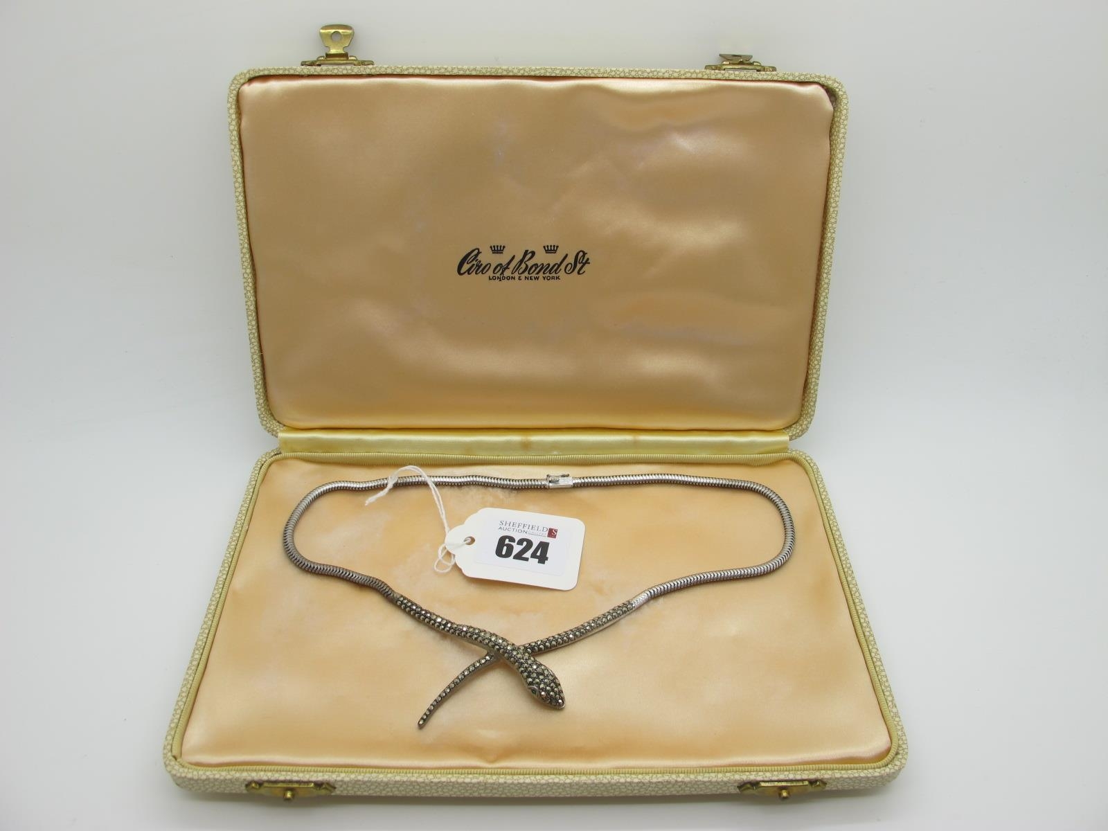 A Stylish Vintage Marcasite Set Serpent Necklace, of crossover design to the front (925 import marks for London 1966), to integral smooth link chain with snap clasp, in a Ciro of Bond Street case.