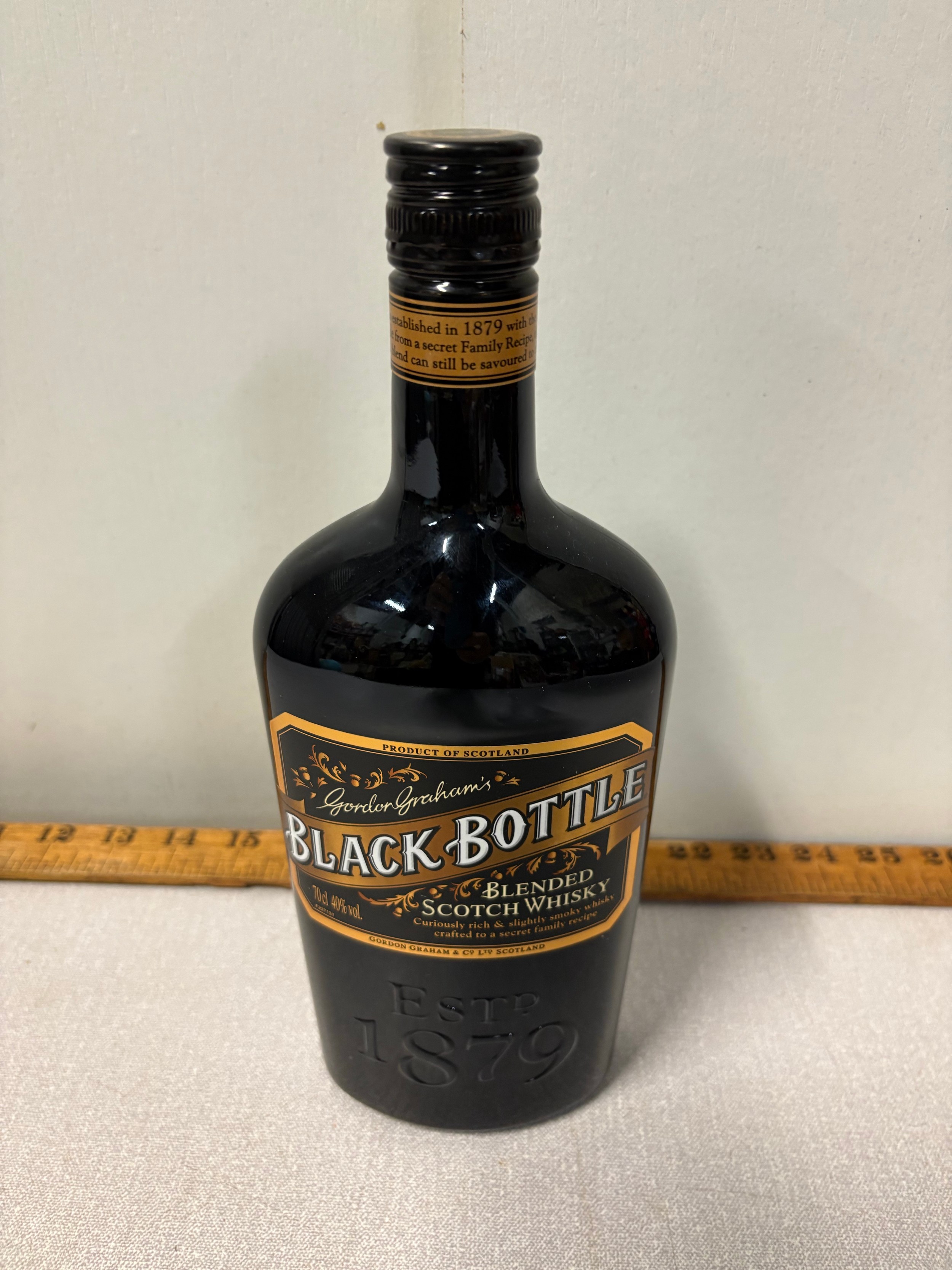 A bottle of Gordon grahams black bottle blended whisky