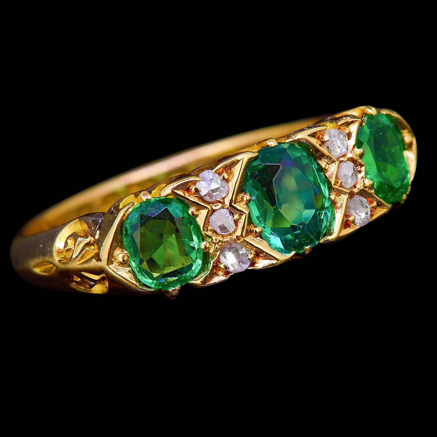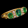 EMERALD AND DIAMOND RING, set with 3 emeralds totalling approx. 1.50 ct. flanked with diamonds. Size N. 4.1 grams.